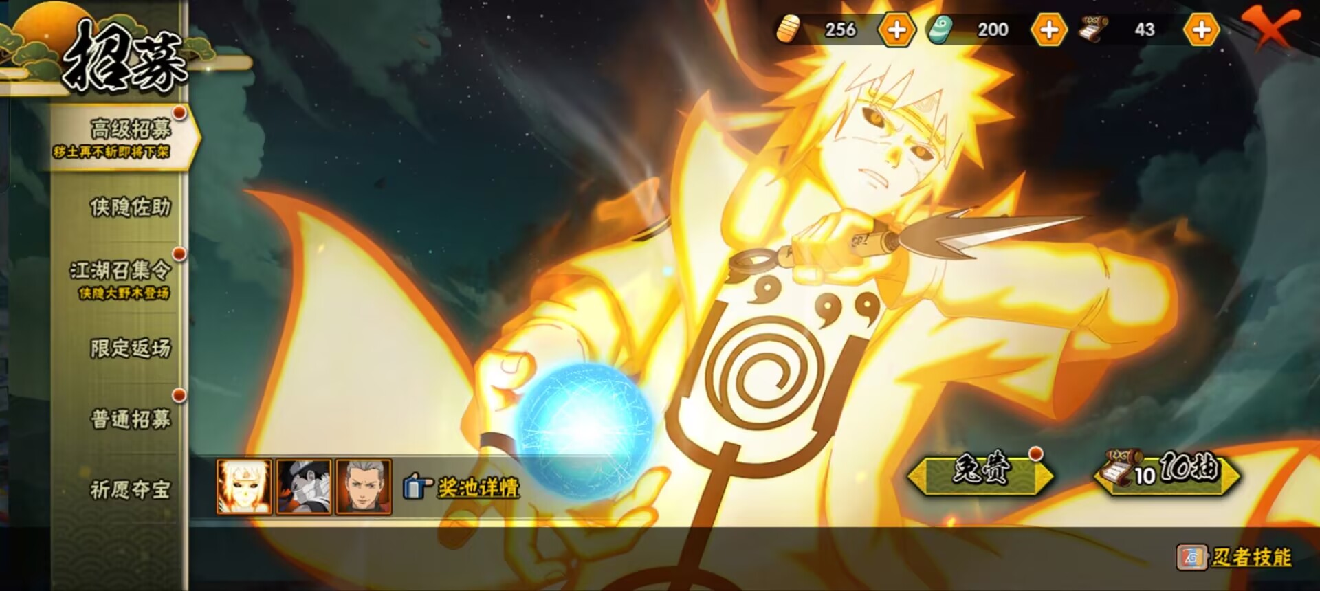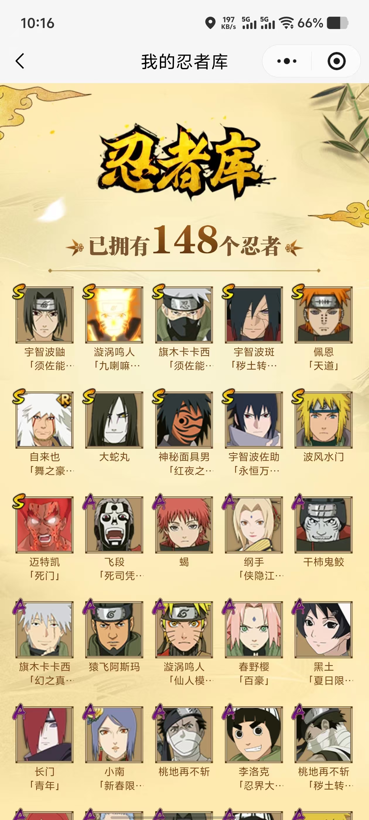 【A忍者】,纲手「侠隐江湖」,长十郎「六代目水影」,日向宁次「忍界大战」,漩涡博人「桃式显现」,旗木卡卡西「幻之真容」,李洛克「忍界大战」,神农「羁绊」,桃地再不斩「秽土转生」,长门「青年」,艾「青年」,达鲁伊「五代目雷影」,不风,波风水门「青年」,宇智波佐助「须佐能乎」,小南「新春限定」,宇智波鼬「新春限定」,秋道丁次「忍界大战」,春野樱「百豪」,照美冥「五代目水影」,漩涡鸣人「仙人模式」,飞段「死司凭血」,飞段,迪达拉,我爱罗「疾风传」,蝎,干柿鬼鲛,宇智波鼬,猿飞阿斯玛,迈特凯,桃地再不斩,