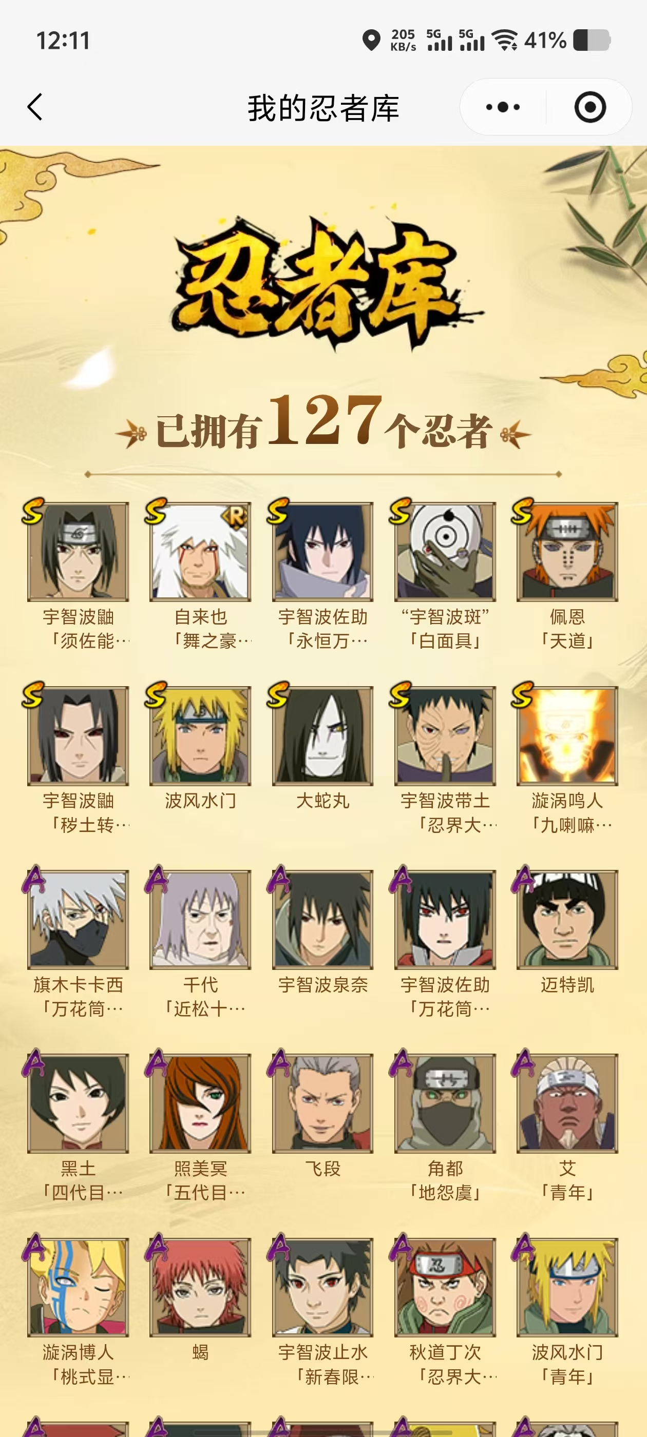 【A忍者】,漩涡博人「桃式显现」,宇智波泉奈,艾「青年」,波风水门「青年」,宇智波止水「新春限定」,宇智波佐助「须佐能乎」,千代「近松十人卫」,药师兜「半蛇斗篷」,秋道丁次「忍界大战」,照美冥「五代目水影」,宇智波佐助「万花筒写轮眼」,旗木卡卡西「万花筒写轮眼」,角都「地怨虞」,飞段「死司凭血」,飞段,迪达拉,我爱罗「疾风传」,蝎,干柿鬼鲛,迈特凯,