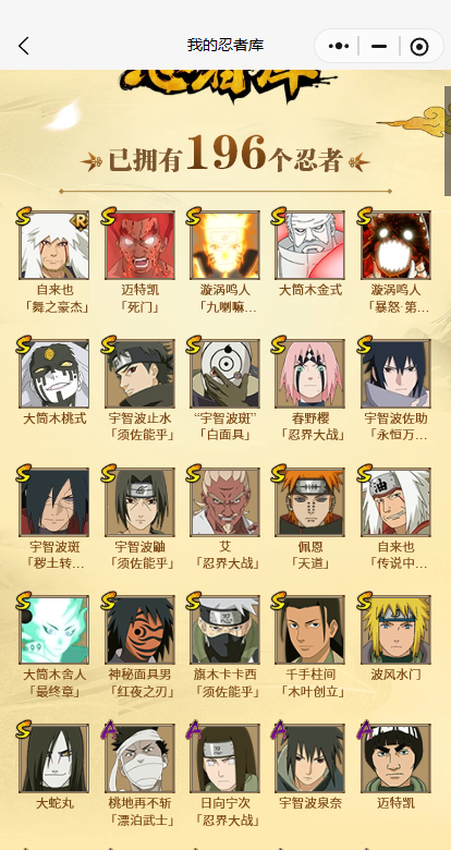 【A忍者】,土台「忍界大战」,长十郎「六代目水影」,不缘,日向宁次「忍界大战」,漩涡博人「桃式显现」,旗木卡卡西「幻之真容」,小南「漂泊浪客」,李洛克「忍界大战」,黑绝,蝎「绯流琥」,宇智波泉奈,宇智波带土「漂泊浪客」,神农「羁绊」,桃地再不斩「秽土转生」,角都「秽土转生」,长门「青年」,佩恩·六道「漂泊浪客」,艾「青年」,波风水门「青年」,宇智波止水「新春限定」,宇智波佐助「须佐能乎」,桃地再不斩「漂泊武士」,迪达拉「秽土转生」,小南「新春限定」,漩涡鸣人「九尾查克拉」,千代「近松十人卫」,宇智波鼬「新春限定」,秋道丁次「忍界大战」,大蛇丸「晓」,波风水门「新春限定」,宇智波佐助「万花筒写轮眼」,角都「地怨虞」,飞段「死司凭血」,飞段,迪达拉,我爱罗「疾风传」,蝎,干柿鬼鲛,宇智波鼬,猿飞阿斯玛,迈特凯,卑留呼「火之意志继承者」,