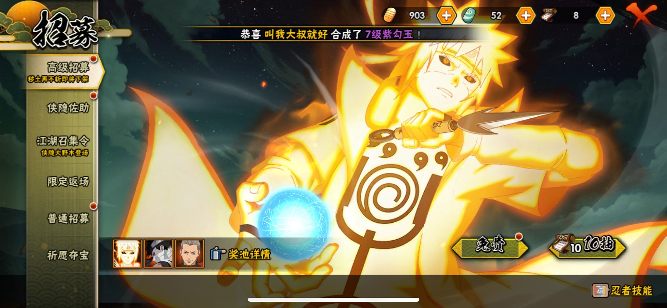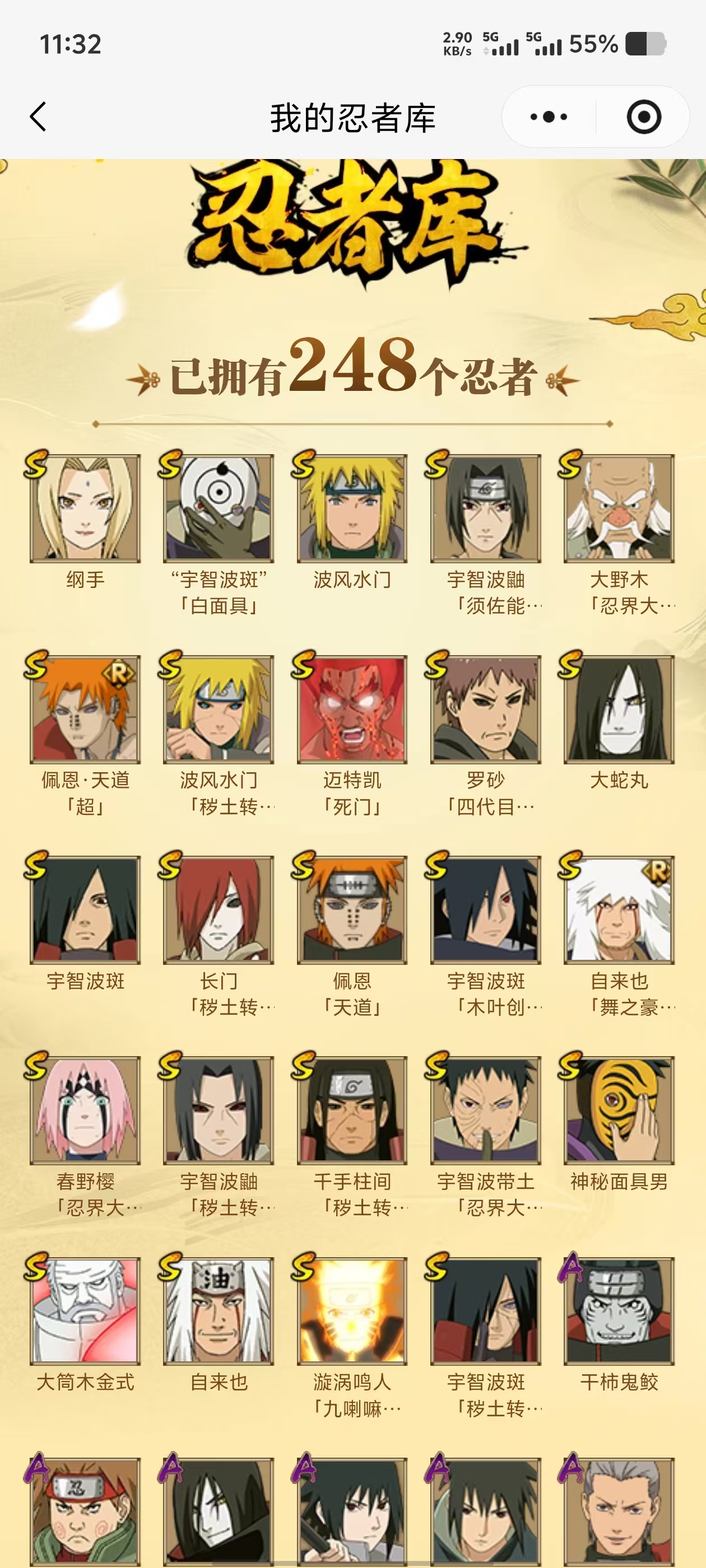 【A忍者】,长十郎「六代目水影」,不缘,蝎「绯流琥」,宇智波泉奈,神农「羁绊」,宇智波止水,长门「青年」,佩恩·六道「漂泊浪客」,艾「青年」,迪达拉「新春限定」,达鲁伊「五代目雷影」,神秘面具男「忍者之路」,波风水门「青年」,千手扉间「漂泊武士」,奇拉比「忍界大战」,宇智波佐助「须佐能乎」,加藤断,迪达拉「秽土转生」,宇智波带土「暴怒」,漩涡鸣人「九尾查克拉」,千代「近松十人卫」,药师兜「半蛇斗篷」,我爱罗「忍界大战」,秋道丁次「忍界大战」,大蛇丸「晓」,春野樱「百豪」,照美冥「五代目水影」,勘九郎「忍界大战」,宇智波佐助「万花筒写轮眼」,奇拉比,绝,漩涡鸣人「仙人模式」,旗木卡卡西「万花筒写轮眼」,角都「地怨虞」,飞段「死司凭血」,角都,小南,飞段,迪达拉,我爱罗「疾风传」,蝎,干柿鬼鲛,宇智波鼬,猿飞阿斯玛,迈特凯,卑留呼「火之意志继承者」,桃地再不斩,