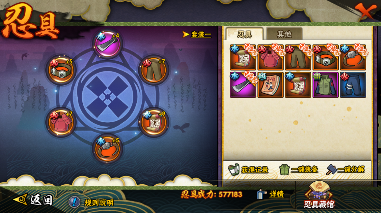 【A忍者】,旗木卡卡西「幻之真容」,小南「漂泊浪客」,李洛克「忍界大战」,蝎「绯流琥」,宇智波泉奈,宇智波带土「漂泊浪客」,神农「羁绊」,桃地再不斩「秽土转生」,角都「秽土转生」,漩涡鸣人「九尾查克拉」,千代「近松十人卫」,飞段,蝎,干柿鬼鲛,迈特凯,
