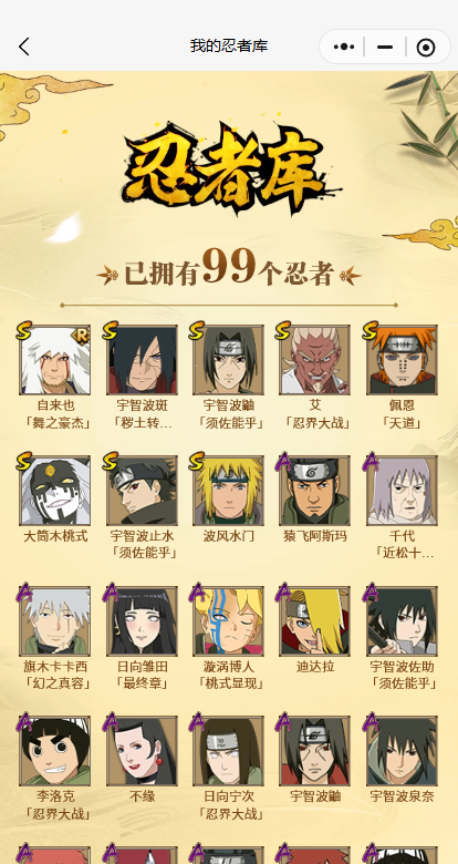 【A忍者】,不缘,日向宁次「忍界大战」,漩涡博人「桃式显现」,日向雏田「最终章」,旗木卡卡西「幻之真容」,李洛克「忍界大战」,宇智波泉奈,长门「青年」,宇智波佐助「须佐能乎」,千代「近松十人卫」,迪达拉,我爱罗「疾风传」,蝎,干柿鬼鲛,宇智波鼬,猿飞阿斯玛,迈特凯,