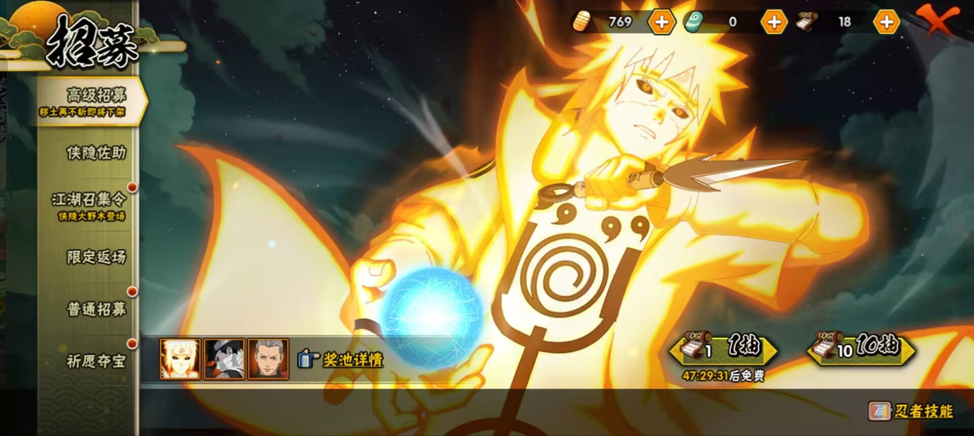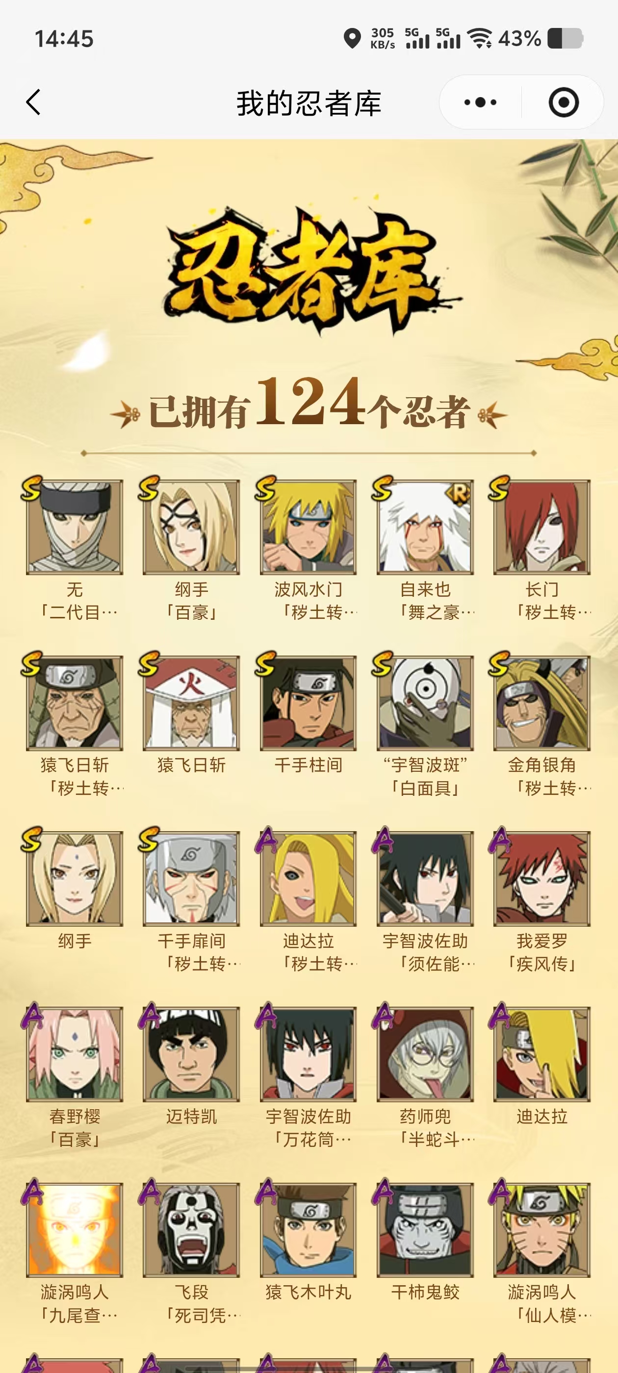 【S忍者】,自来也「舞之豪杰」,宇智波斑「白面具」,千手扉间「秽土转生」,纲手「百豪」,波风水门「秽土转生」,无「二代目土影」,金角银角「秽土转生」,猿飞日斩「秽土转生」,长门「秽土转生」,千手柱间,猿飞日斩,纲手,