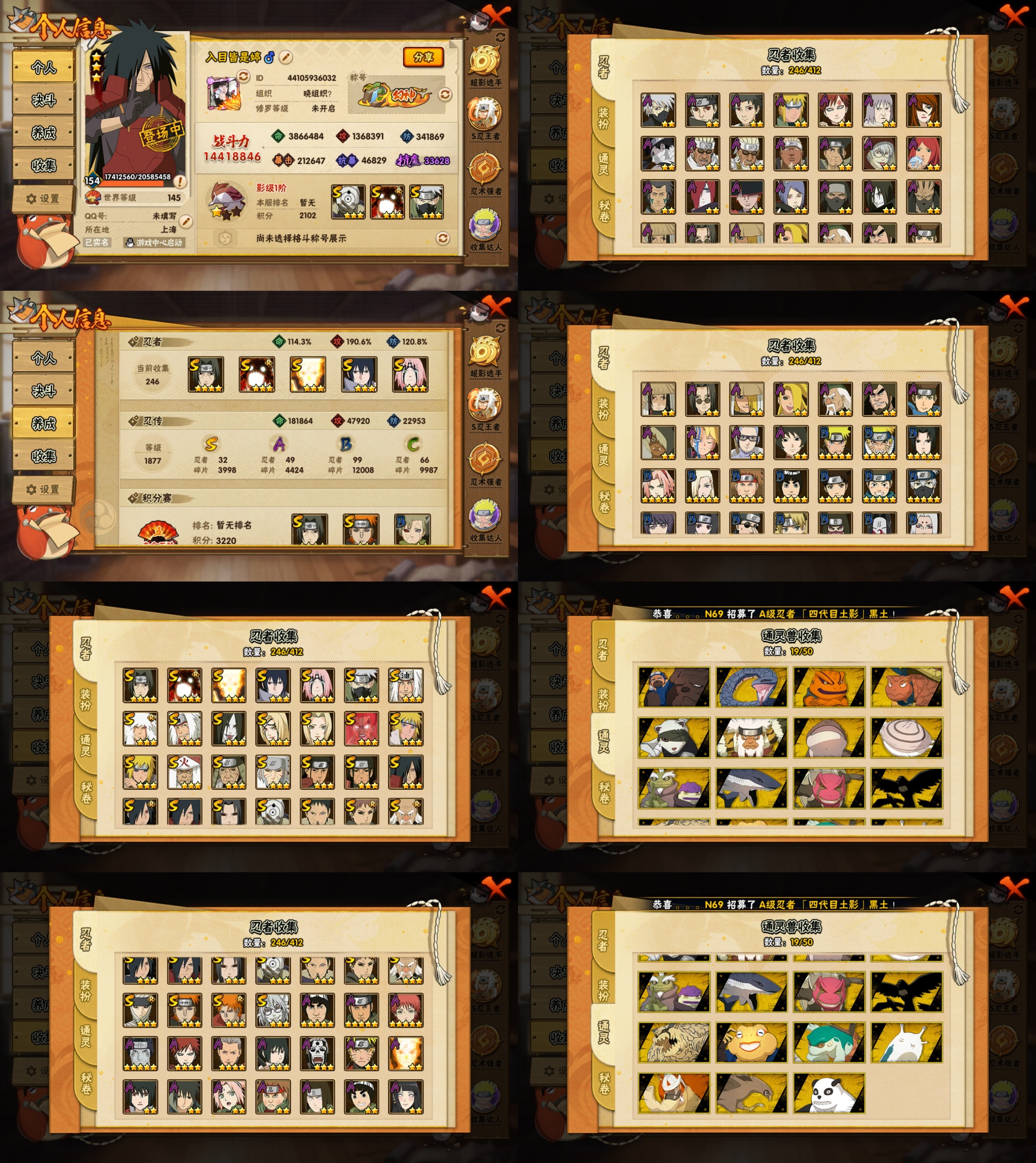 【A忍者】,土台「忍界大战」,长十郎「六代目水影」,日向宁次「忍界大战」,漩涡博人「桃式显现」,日向雏田「最终章」,李洛克「忍界大战」,不动,蝎「绯流琥」,宇智波泉奈,神农「羁绊」,桃地再不斩「秽土转生」,宇智波止水,长门「青年」,佩恩·六道「漂泊浪客」,艾「青年」,达鲁伊「五代目雷影」,不风,波风水门「青年」,奇拉比「忍界大战」,宇智波止水「新春限定」,宇智波佐助「须佐能乎」,迪达拉「秽土转生」,漩涡鸣人「九尾查克拉」,角都「晓创生」,千代「近松十人卫」,药师兜「半蛇斗篷」,宇智波鼬「新春限定」,我爱罗「忍界大战」,秋道丁次「忍界大战」,大蛇丸「晓」,春野樱「百豪」,照美冥「五代目水影」,宇智波佐助「万花筒写轮眼」,奇拉比,漩涡鸣人「仙人模式」,旗木卡卡西「万花筒写轮眼」,飞段「死司凭血」,小南,飞段,迪达拉,我爱罗「疾风传」,蝎,干柿鬼鲛,宇智波鼬,猿飞阿斯玛,迈特凯,