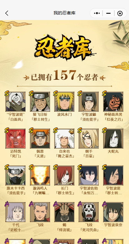 【A忍者】,长十郎「六代目水影」,不缘,日向宁次「忍界大战」,漩涡博人「桃式显现」,李洛克「忍界大战」,不动,蝎「绯流琥」,宇智波泉奈,宇智波带土「漂泊浪客」,角都「秽土转生」,长门「青年」,艾「青年」,照美冥「侠隐江湖」,达鲁伊「五代目雷影」,波风水门「青年」,宇智波佐助「须佐能乎」,漩涡鸣人「九尾查克拉」,千代「近松十人卫」,秋道丁次「忍界大战」,大蛇丸「晓」,春野樱「百豪」,宇智波佐助「万花筒写轮眼」,旗木卡卡西「万花筒写轮眼」,飞段「死司凭血」,飞段,我爱罗「疾风传」,蝎,干柿鬼鲛,猿飞阿斯玛,迈特凯,