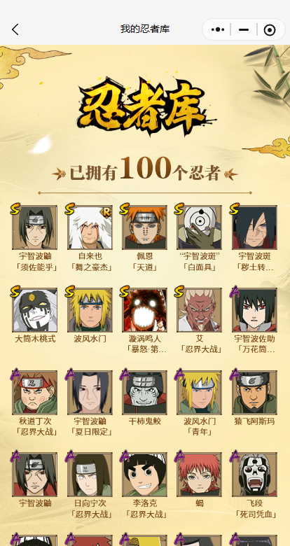 【A忍者】,不缘,日向宁次「忍界大战」,漩涡博人「桃式显现」,宇智波鼬「夏日限定」,日向雏田「最终章」,李洛克「忍界大战」,宇智波泉奈,神农「羁绊」,波风水门「青年」,秋道丁次「忍界大战」,宇智波佐助「万花筒写轮眼」,飞段「死司凭血」,迪达拉,我爱罗「疾风传」,蝎,干柿鬼鲛,宇智波鼬,猿飞阿斯玛,迈特凯,