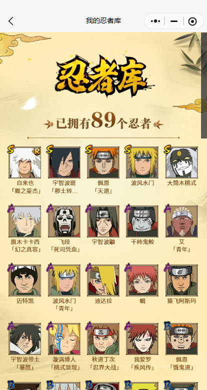 PX_2234672-5S忍/14A忍/战力582W/V8/区服3735 【S忍者】,大筒木桃式,宇智波斑「秽土转生·解」,自来也「舞之豪杰」,佩恩「天道」,波风水门, 【A忍者】,漩涡博人「桃式显现」,旗木卡卡西「幻之真容」,艾「青年」,波风水门「青年」,宇智波带土「暴怒」,秋道丁次「忍界大战」,飞段「死司凭血」,迪达拉,我爱罗「疾风传」,蝎,干柿鬼鲛,宇智波鼬,猿飞阿斯玛,迈特凯,