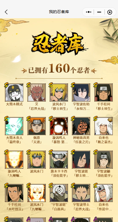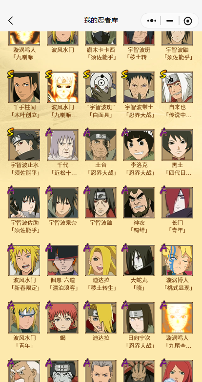 【A忍者】,土台「忍界大战」,日向宁次「忍界大战」,漩涡博人「桃式显现」,李洛克「忍界大战」,蝎「绯流琥」,宇智波泉奈,宇智波带土「漂泊浪客」,神农「羁绊」,桃地再不斩「秽土转生」,角都「秽土转生」,长门「青年」,佩恩·六道「漂泊浪客」,不风,波风水门「青年」,宇智波佐助「须佐能乎」,迪达拉「秽土转生」,漩涡鸣人「九尾查克拉」,千代「近松十人卫」,秋道丁次「忍界大战」,大蛇丸「晓」,波风水门「新春限定」,飞段「死司凭血」,飞段,迪达拉,我爱罗「疾风传」,蝎,干柿鬼鲛,宇智波鼬,猿飞阿斯玛,迈特凯,