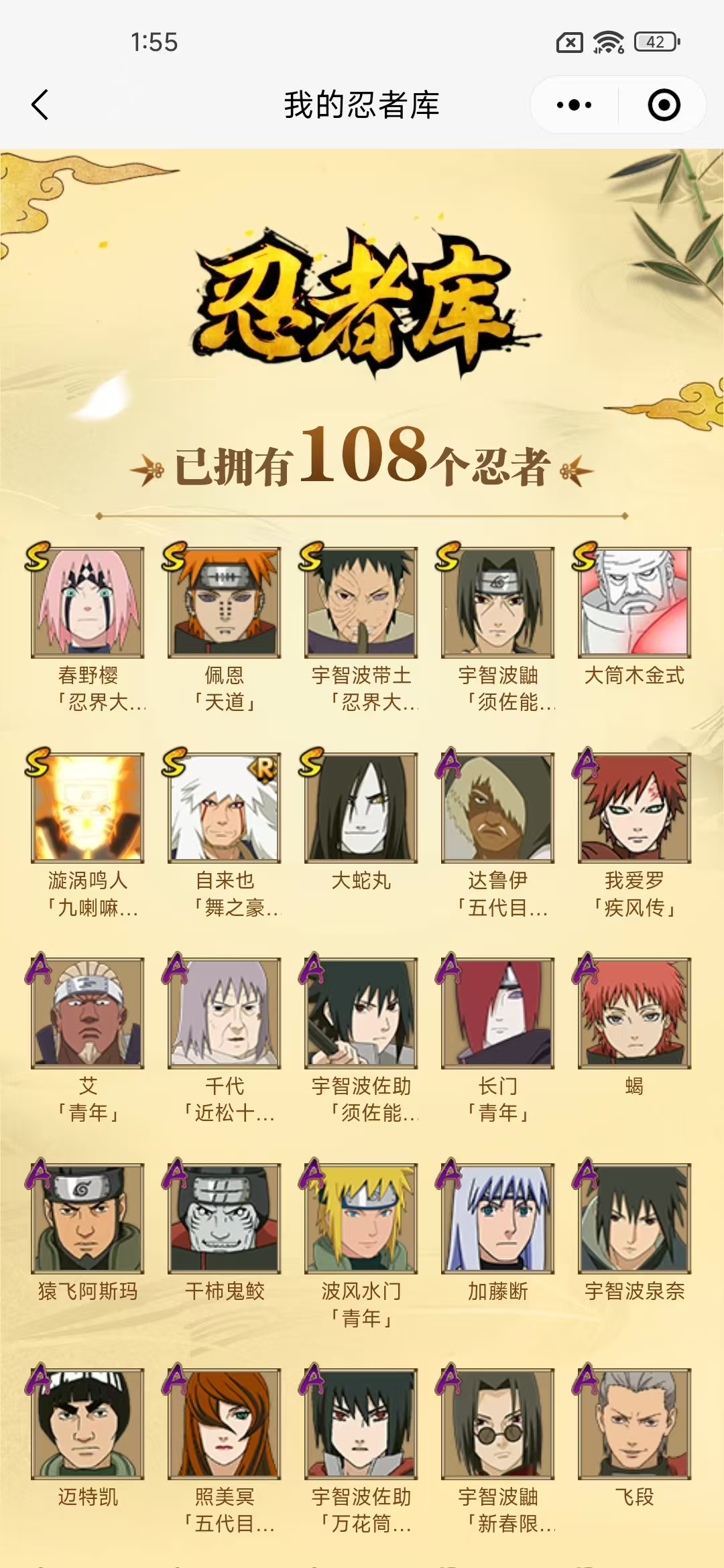 【A忍者】,宇智波泉奈,长门「青年」,艾「青年」,达鲁伊「五代目雷影」,波风水门「青年」,宇智波佐助「须佐能乎」,加藤断,千代「近松十人卫」,宇智波鼬「新春限定」,大蛇丸「晓」,照美冥「五代目水影」,宇智波佐助「万花筒写轮眼」,漩涡鸣人「仙人模式」,飞段「死司凭血」,飞段,我爱罗「疾风传」,蝎,干柿鬼鲛,猿飞阿斯玛,迈特凯,