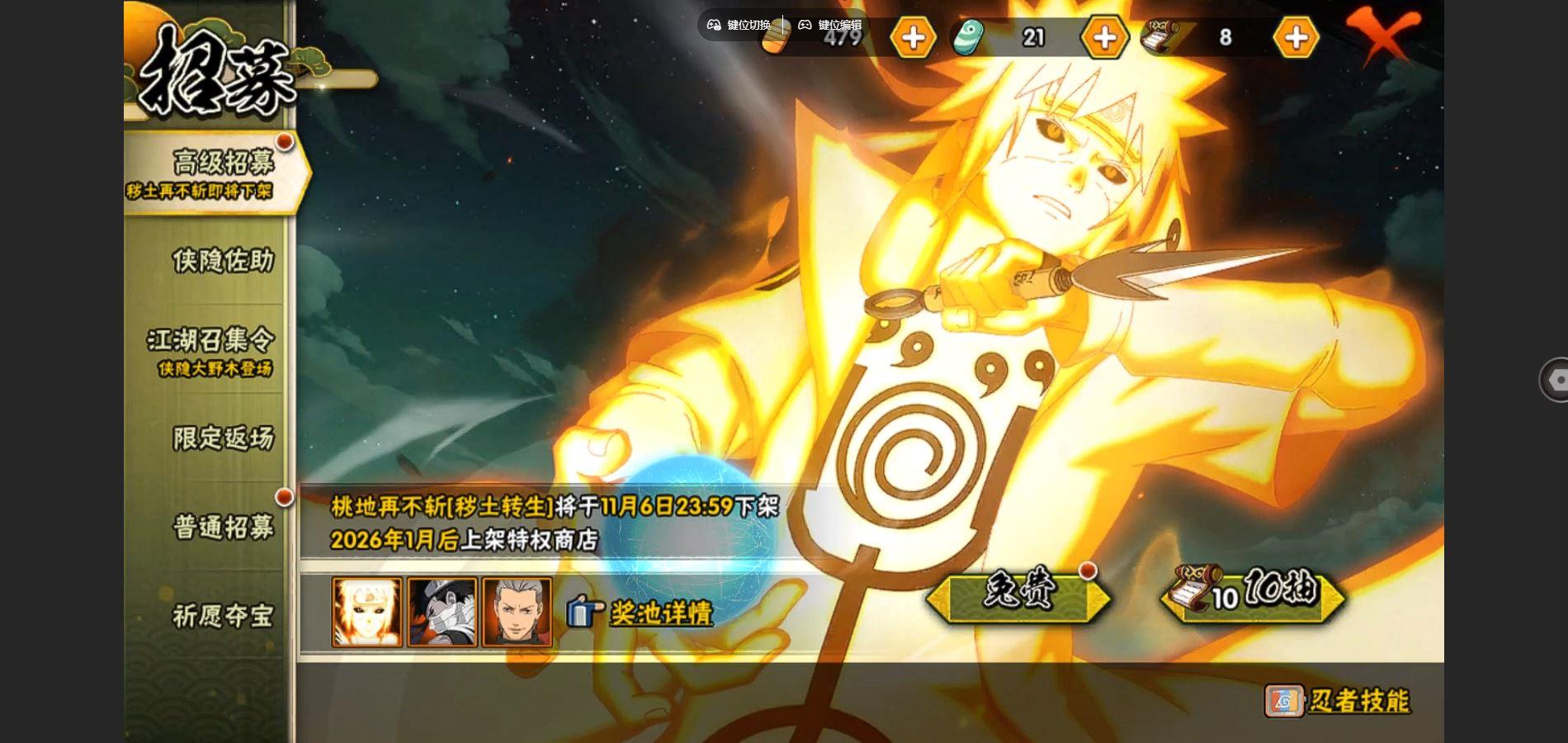 【S忍者】,宇智波止水「须佐能乎」,艾「忍界大战」,大筒木桃式,宇智波斑「秽土转生·解」,千手柱间「木叶创立」,宇智波佐助「永恒万花筒」,神秘面具男「红夜之刃」,自来也「舞之豪杰」,旗木卡卡西「须佐能乎」,自来也「传说中的三忍」,漩涡鸣人「暴怒·第六尾」,宇智波鼬「须佐能乎」,佩恩「天道」,波风水门,