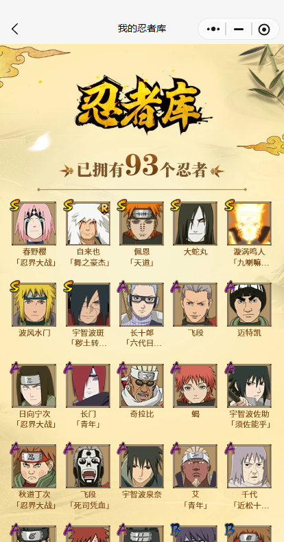 【A忍者】,长十郎「六代目水影」,日向宁次「忍界大战」,宇智波泉奈,长门「青年」,艾「青年」,宇智波佐助「须佐能乎」,千代「近松十人卫」,秋道丁次「忍界大战」,奇拉比,飞段「死司凭血」,飞段,我爱罗「疾风传」,蝎,干柿鬼鲛,猿飞阿斯玛,迈特凯,