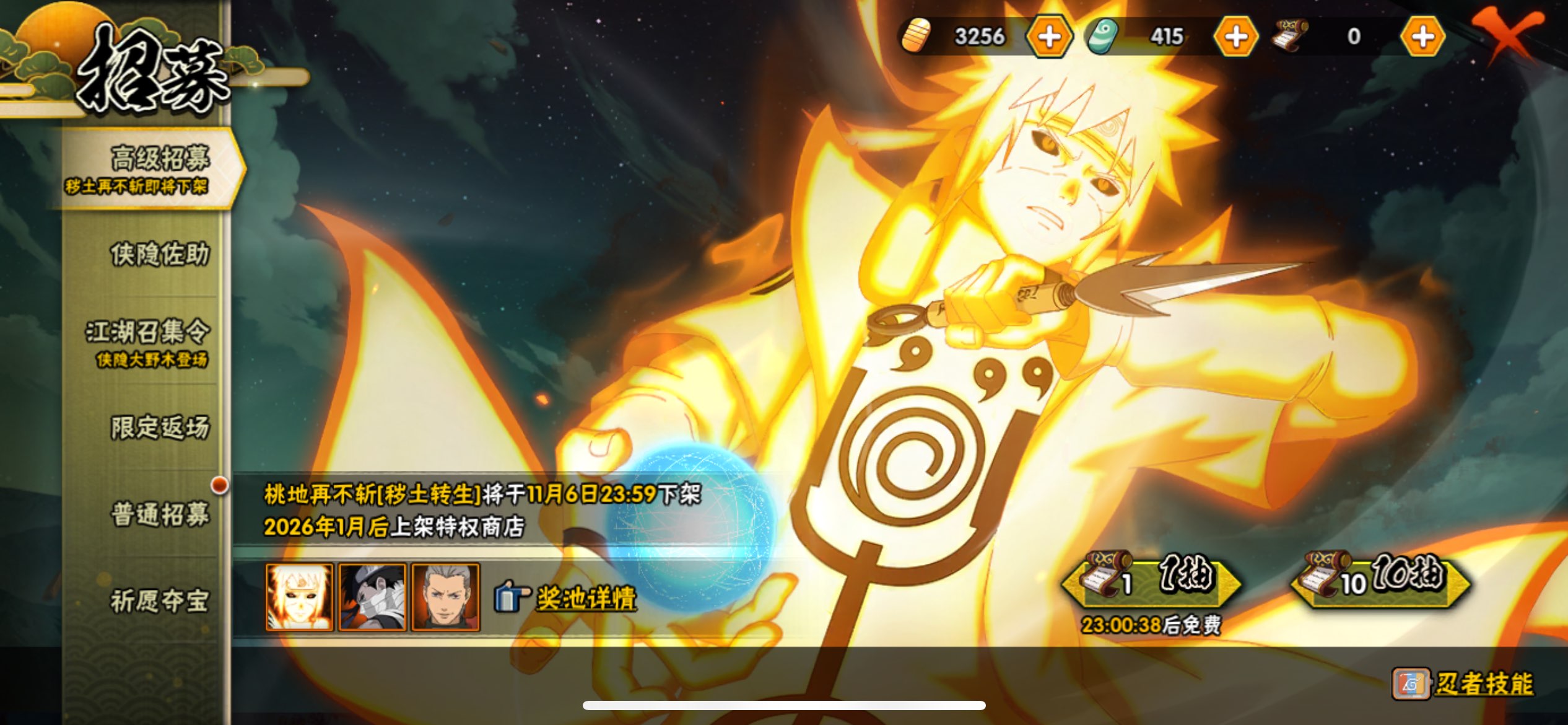 【S忍者】,宇智波止水「须佐能乎」,大筒木桃式,自来也「舞之豪杰」,旗木卡卡西「须佐能乎」,猿飞日斩「秽土转生」,长门「秽土转生」,宇智波鼬「须佐能乎」,佩恩「天道」,猿飞日斩,纲手,