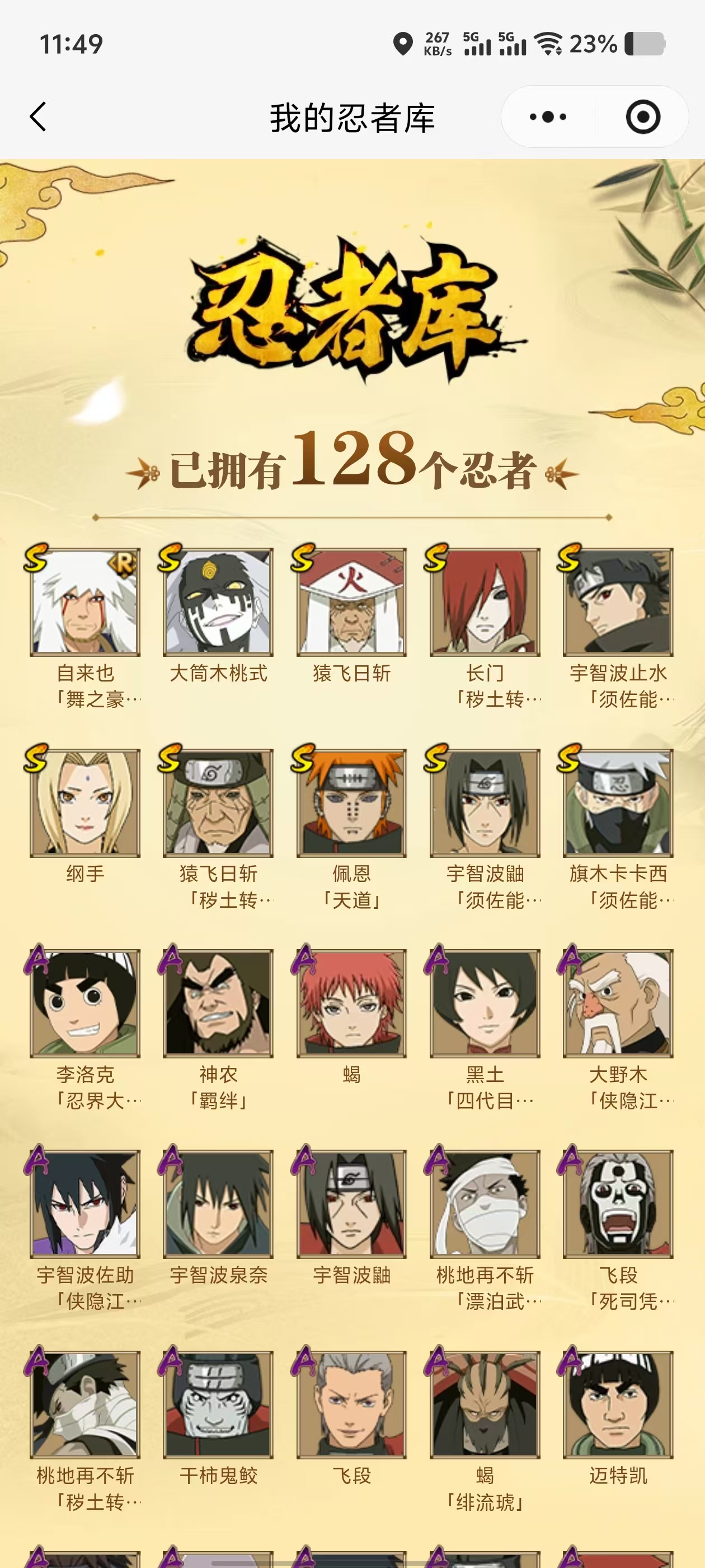 【A忍者】,李洛克「忍界大战」,蝎「绯流琥」,宇智波泉奈,宇智波带土「漂泊浪客」,神农「羁绊」,桃地再不斩「秽土转生」,长门「青年」,宇智波佐助「须佐能乎」,桃地再不斩「漂泊武士」,千代「近松十人卫」,猿飞日斩「火影继承人」,飞段「死司凭血」,飞段,迪达拉,我爱罗「疾风传」,蝎,干柿鬼鲛,宇智波鼬,猿飞阿斯玛,迈特凯,