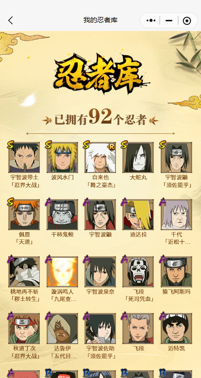 【A忍者】,宇智波泉奈,桃地再不斩「秽土转生」,达鲁伊「五代目雷影」,宇智波佐助「须佐能乎」,漩涡鸣人「九尾查克拉」,千代「近松十人卫」,秋道丁次「忍界大战」,飞段「死司凭血」,飞段,迪达拉,蝎,干柿鬼鲛,宇智波鼬,猿飞阿斯玛,迈特凯,
