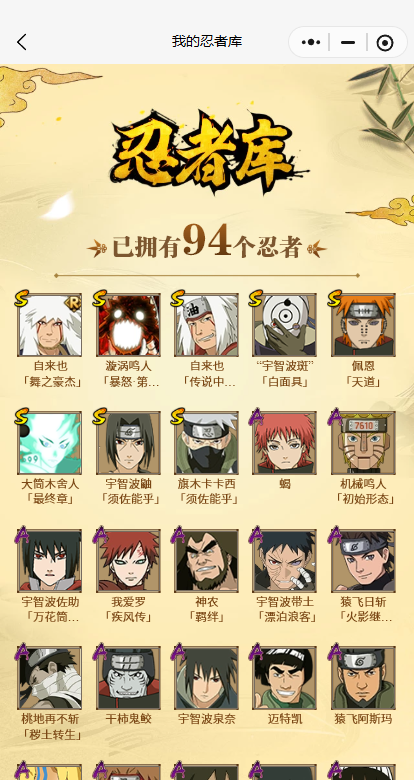 【A忍者】,漩涡博人「桃式显现」,李洛克「忍界大战」,宇智波泉奈,宇智波带土「漂泊浪客」,神农「羁绊」,桃地再不斩「秽土转生」,角都「秽土转生」,宇智波佐助「须佐能乎」,药师兜「半蛇斗篷」,秋道丁次「忍界大战」,猿飞日斩「火影继承人」,宇智波佐助「万花筒写轮眼」,飞段,迪达拉,我爱罗「疾风传」,蝎,干柿鬼鲛,宇智波鼬,猿飞阿斯玛,迈特凯,
