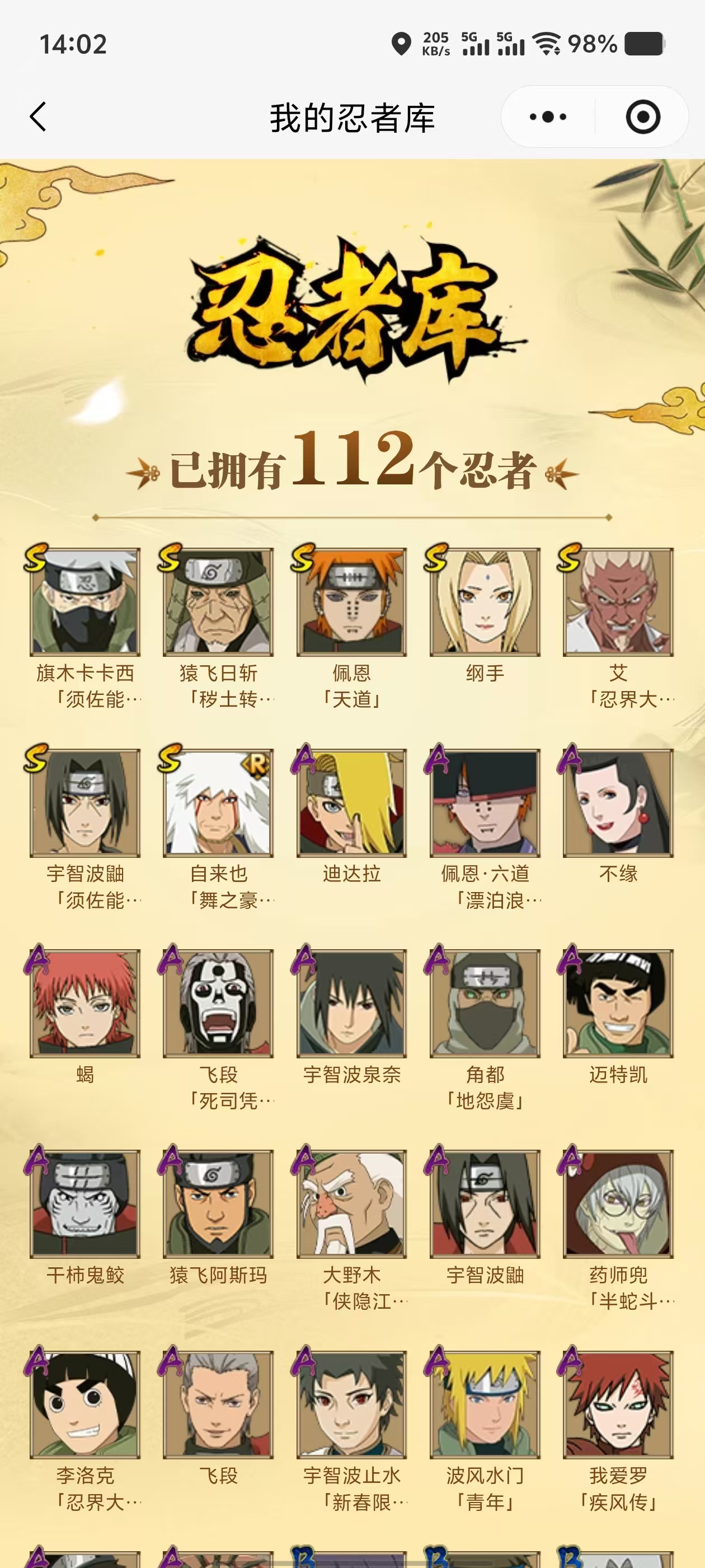 【A忍者】,不缘,李洛克「忍界大战」,蝎「绯流琥」,宇智波泉奈,桃地再不斩「秽土转生」,佩恩·六道「漂泊浪客」,波风水门「青年」,宇智波止水「新春限定」,药师兜「半蛇斗篷」,角都「地怨虞」,飞段「死司凭血」,飞段,迪达拉,我爱罗「疾风传」,蝎,干柿鬼鲛,宇智波鼬,猿飞阿斯玛,迈特凯,