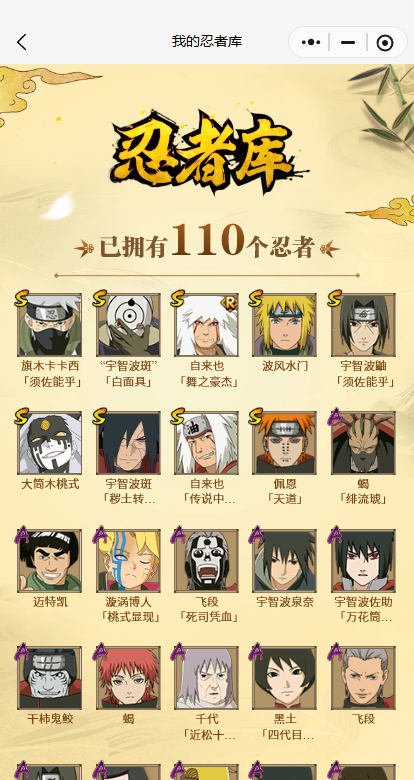 【A忍者】,不缘,日向宁次「忍界大战」,漩涡博人「桃式显现」,旗木卡卡西「幻之真容」,蝎「绯流琥」,宇智波泉奈,宇智波带土「漂泊浪客」,达鲁伊「五代目雷影」,宇智波佐助「须佐能乎」,千代「近松十人卫」,宇智波佐助「万花筒写轮眼」,飞段「死司凭血」,飞段,迪达拉,我爱罗「疾风传」,蝎,干柿鬼鲛,宇智波鼬,猿飞阿斯玛,迈特凯,