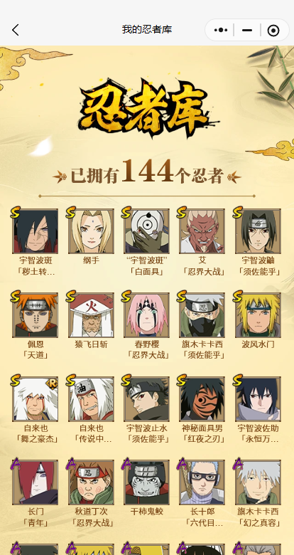 【A忍者】,长十郎「六代目水影」,不缘,日向宁次「忍界大战」,漩涡博人「桃式显现」,旗木卡卡西「幻之真容」,李洛克「忍界大战」,蝎「绯流琥」,宇智波泉奈,角都「秽土转生」,长门「青年」,波风水门「青年」,宇智波佐助「须佐能乎」,漩涡鸣人「九尾查克拉」,千代「近松十人卫」,秋道丁次「忍界大战」,大蛇丸「晓」,飞段「死司凭血」,飞段,迪达拉,我爱罗「疾风传」,蝎,干柿鬼鲛,宇智波鼬,猿飞阿斯玛,迈特凯,
