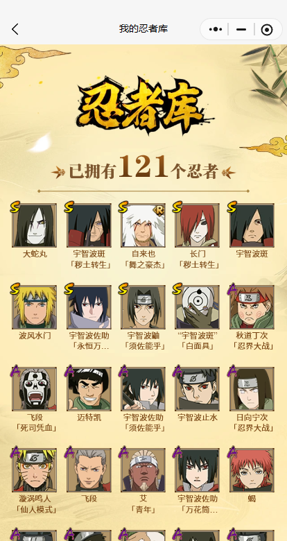 【S忍者】,宇智波佐助「永恒万花筒」,自来也「舞之豪杰」,宇智波斑「秽土转生」,宇智波斑「白面具」,长门「秽土转生」,宇智波斑,宇智波鼬「须佐能乎」,波风水门,大蛇丸,