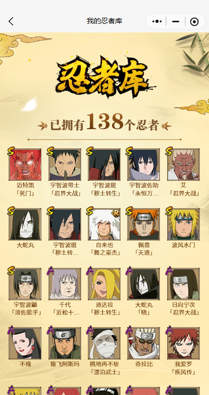 【A忍者】,长十郎「六代目水影」,不缘,日向宁次「忍界大战」,李洛克「忍界大战」,宇智波泉奈,不风,波风水门「青年」,奇拉比「忍界大战」,宇智波佐助「须佐能乎」,桃地再不斩「漂泊武士」,迪达拉「秽土转生」,千代「近松十人卫」,秋道丁次「忍界大战」,大蛇丸「晓」,宇智波佐助「万花筒写轮眼」,奇拉比,漩涡鸣人「仙人模式」,飞段「死司凭血」,我爱罗「疾风传」,蝎,干柿鬼鲛,猿飞阿斯玛,迈特凯,