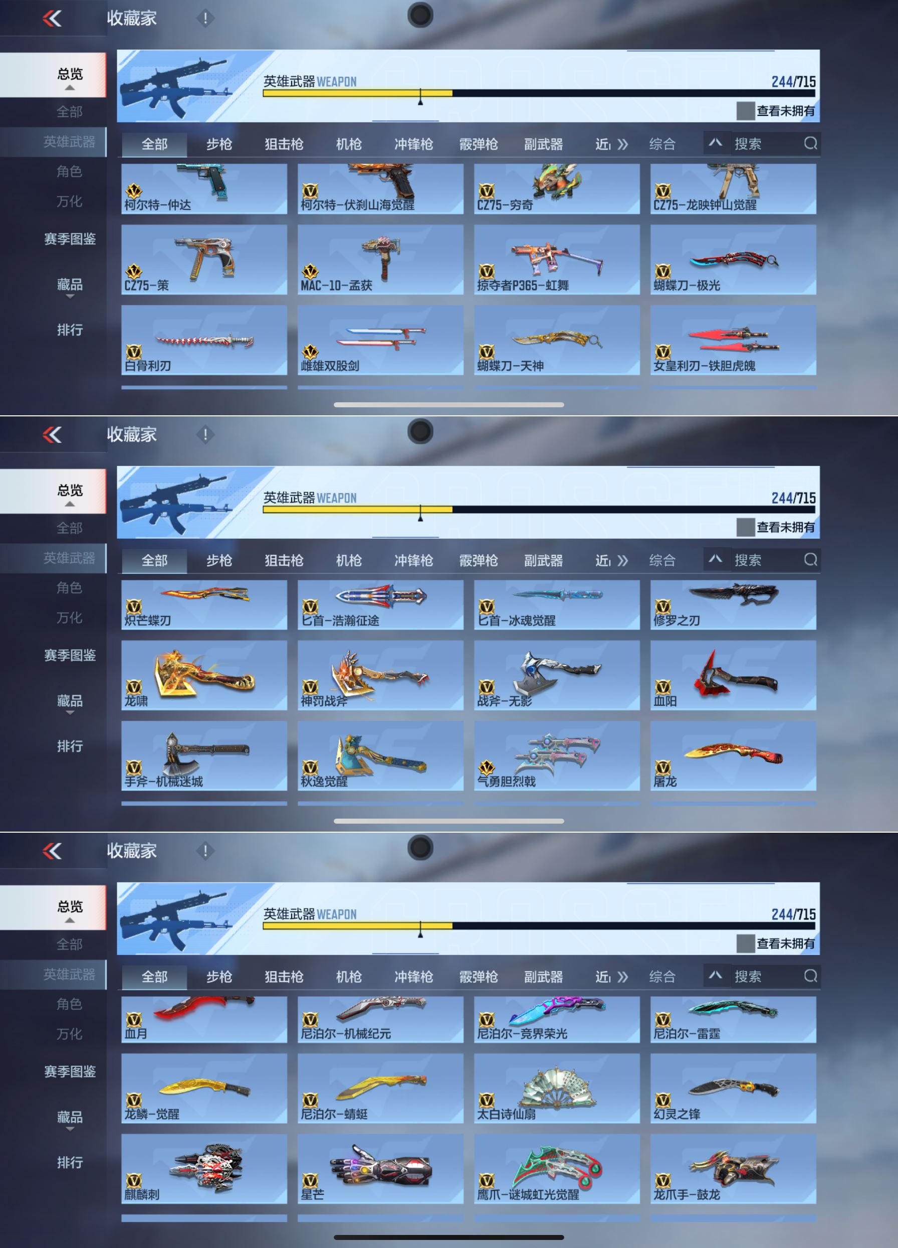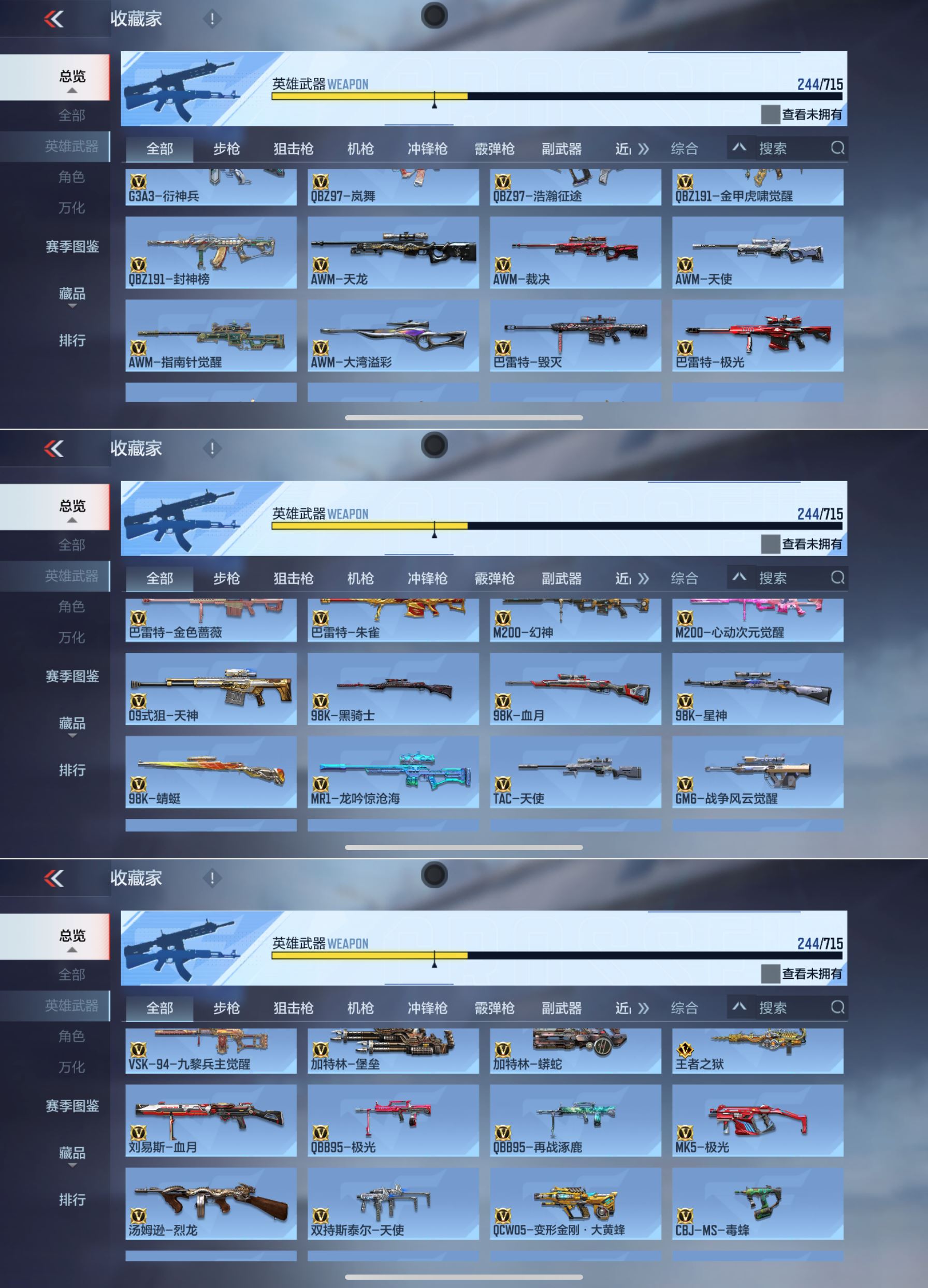 【稀有武器】AWM-青花瓷,M4A1-超级联赛S1,贝雷塔-穹顶之雀,AWM-情缘,M60-生化杀手,黄金雷刃,黄金凤舞,胡萝卜匕首,带刺的玫瑰,电锯,电推子,粒子炮-宇宙战士,双管猎枪,虚空双枪,冰龙火炮-冰晶,QCW05-S10限定,CZS2-蔚蓝外滩,亡命之徒-S8限定