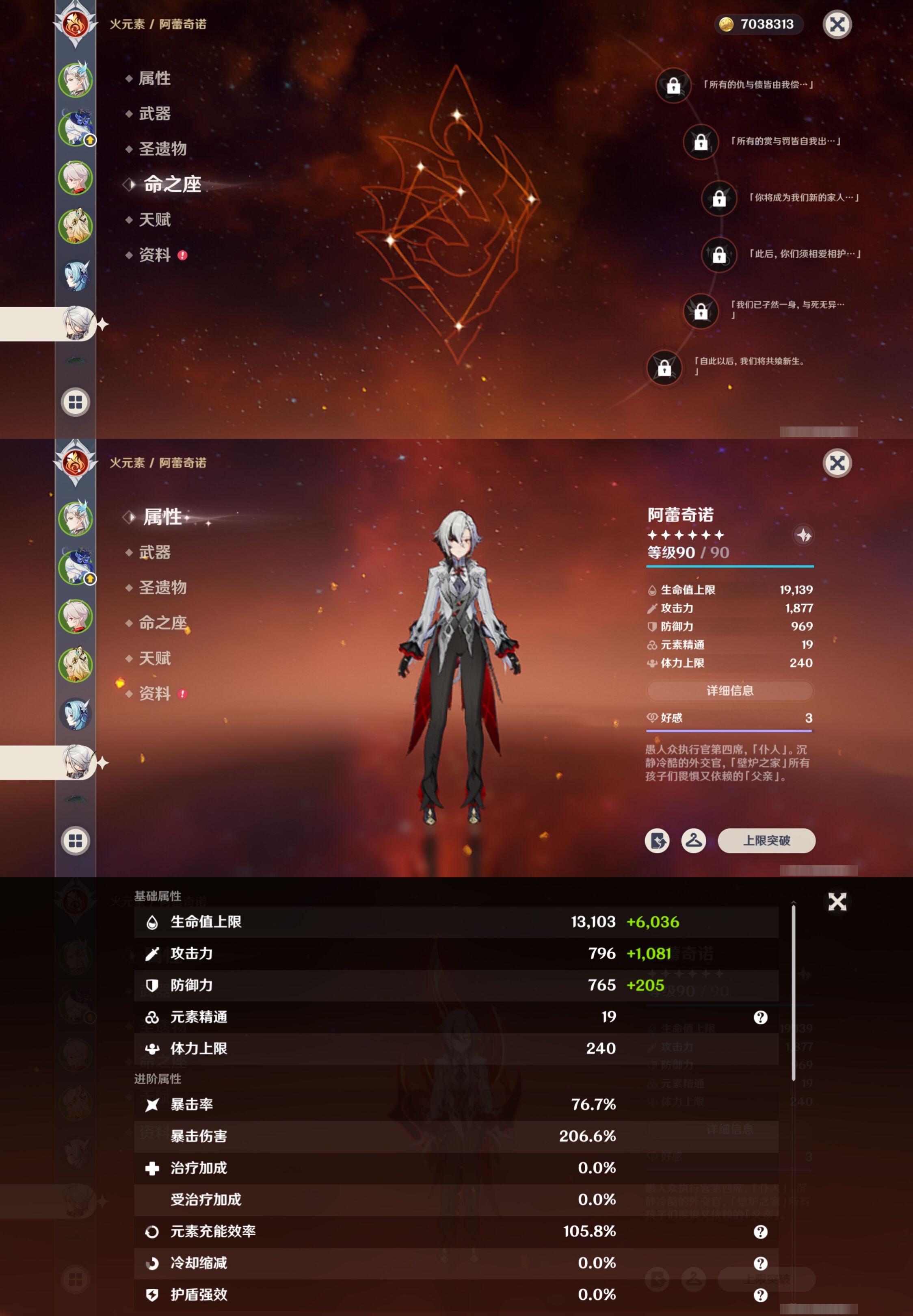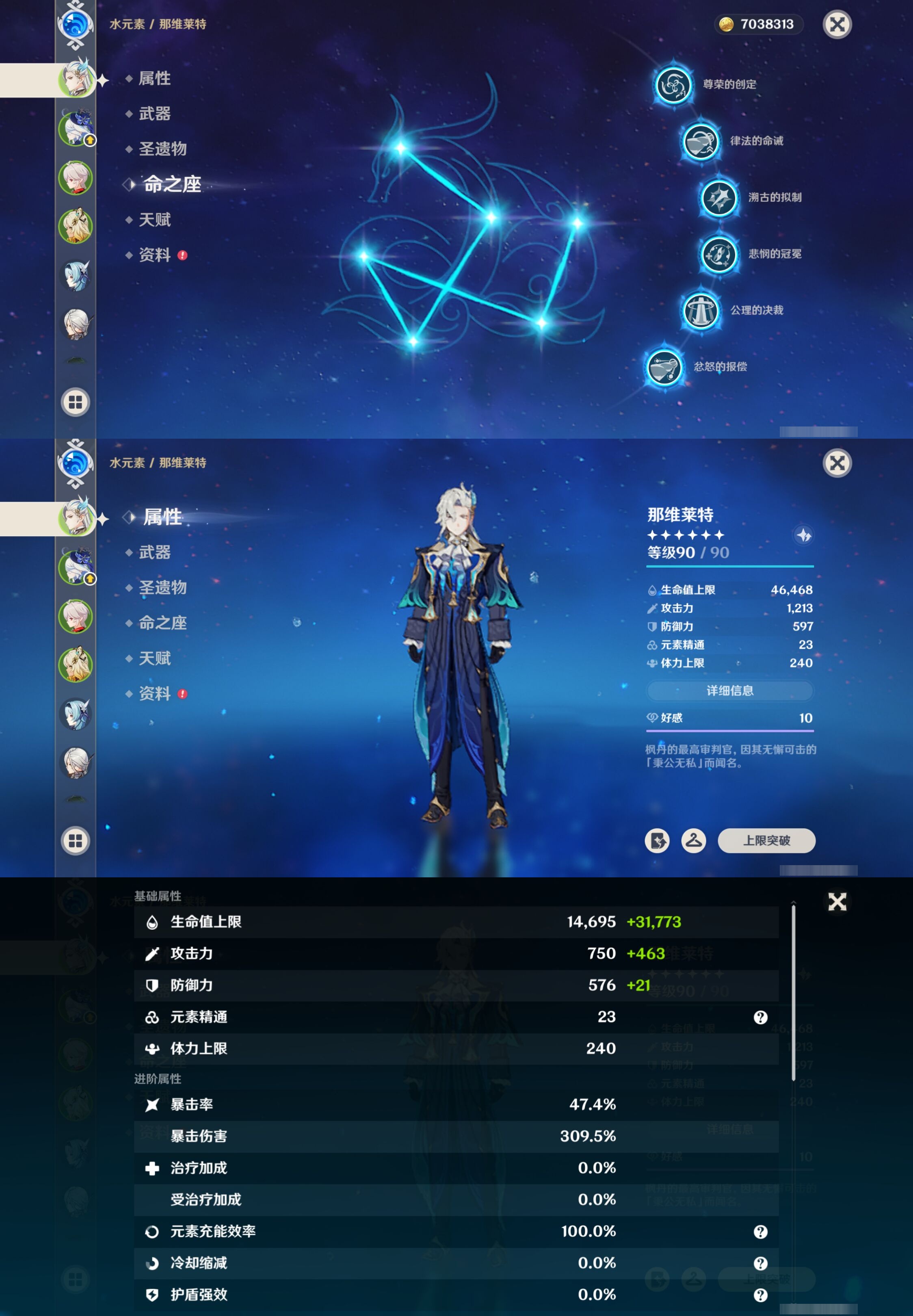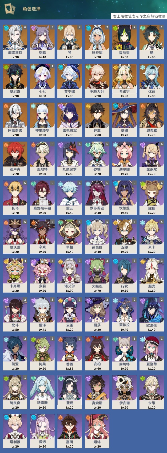 【19个五星角色】,满命那维莱特,3命刻晴,2命琴,2命玛拉妮,2命提纳里,1命魈,1命基尼奇,1命七七,0命芙宁娜,0命枫原万叶,0命希诺宁,0命优菈,0命阿蕾奇诺,0命神里绫华,0命雷电将军,0命钟离,0命莫娜,0命迪希雅,0命迪卢克,