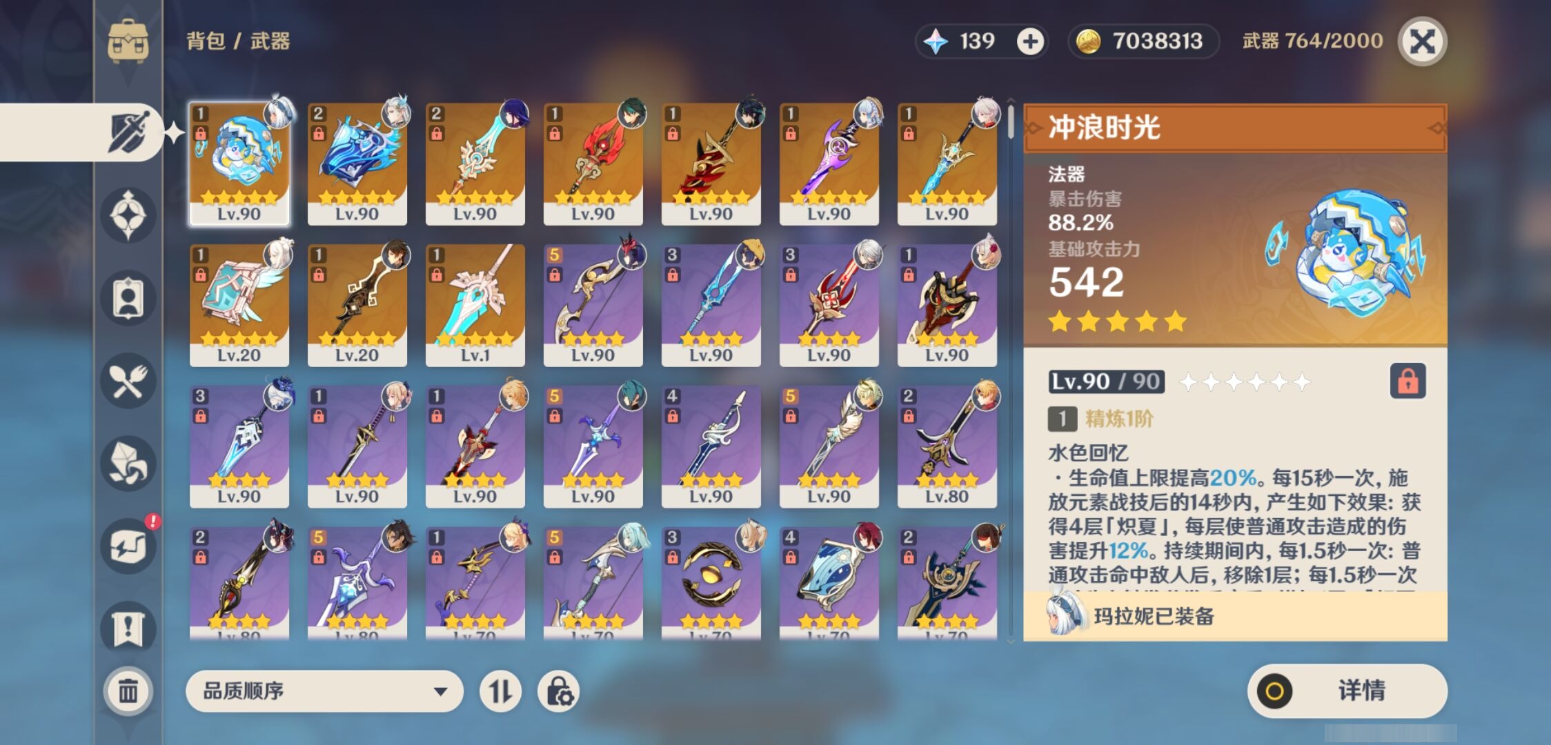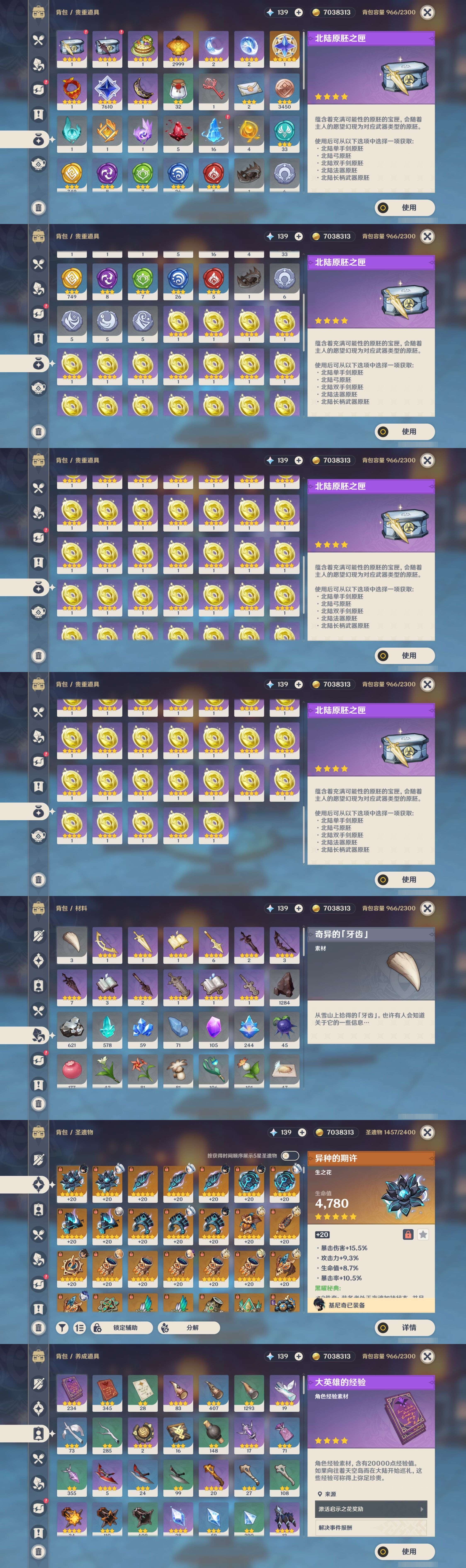 【10个五星武器】,精2万世流涌大典,精2天空之脊,精1冲浪时光,精1天空之卷,精1贯虹之槊,精1天空之傲,精1护摩之杖,精1赤角石溃杵,精1雾切之回光,精1苍古自由之誓,5套,
