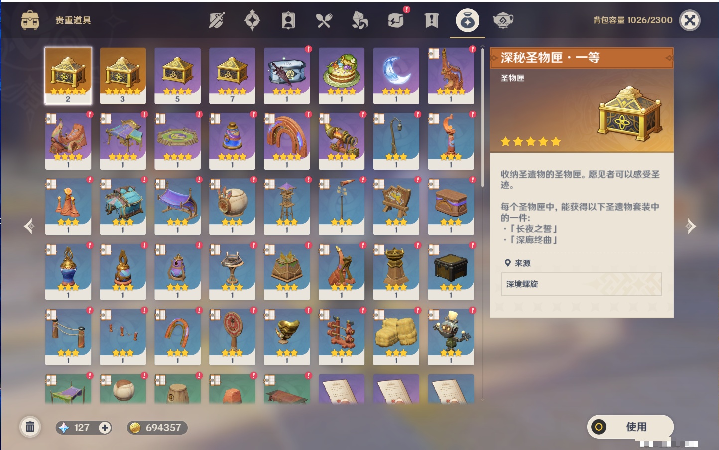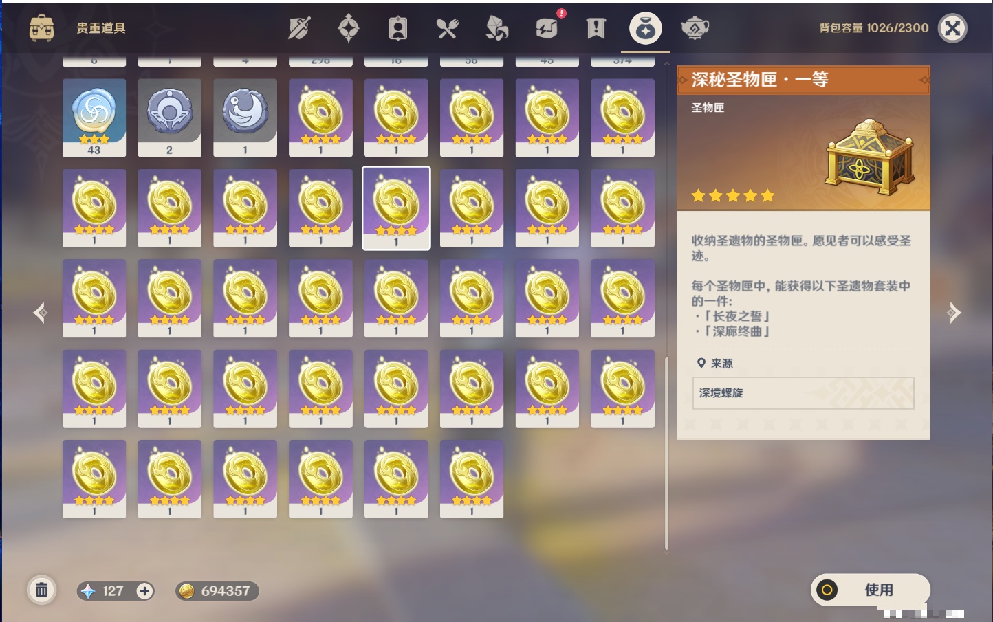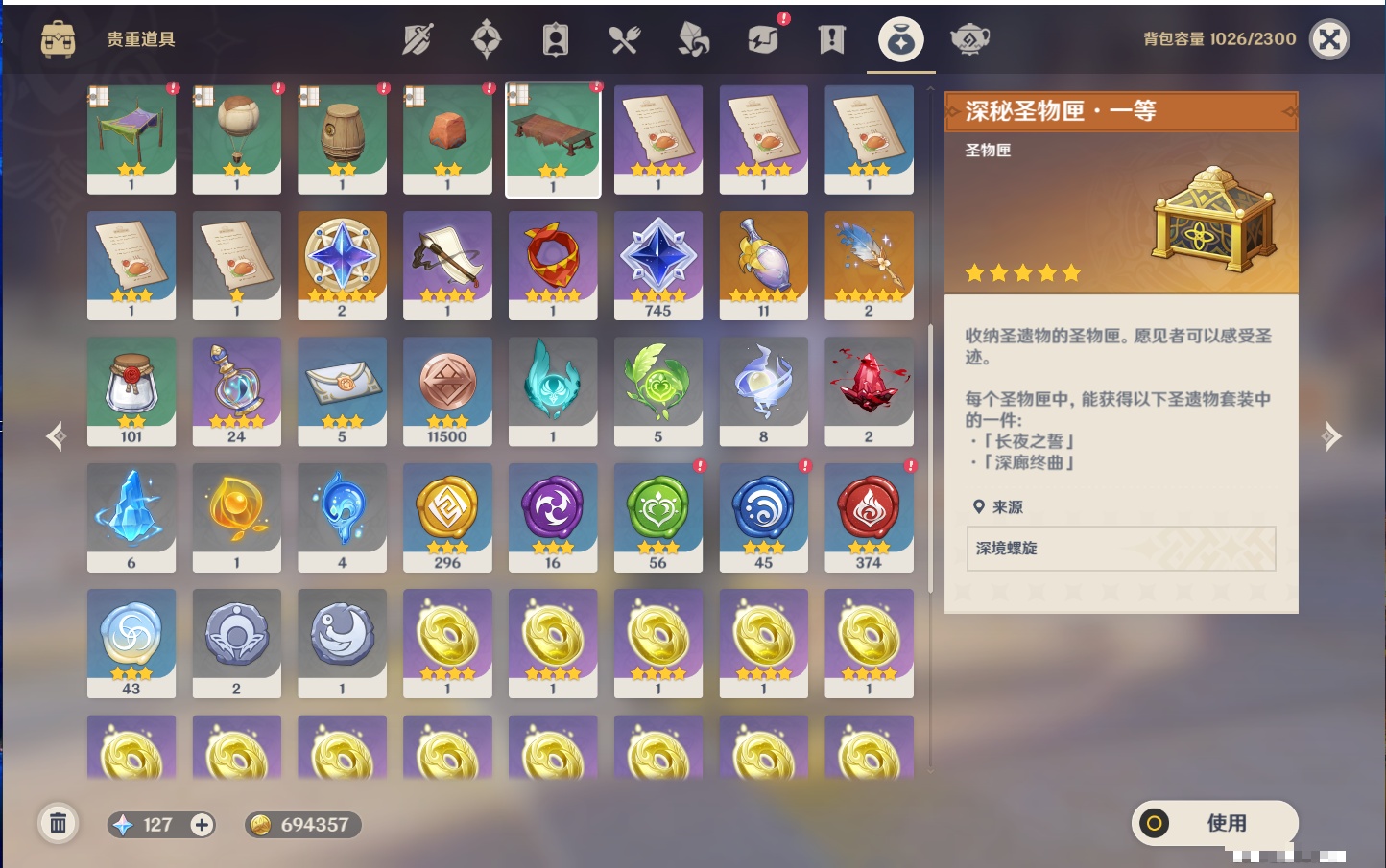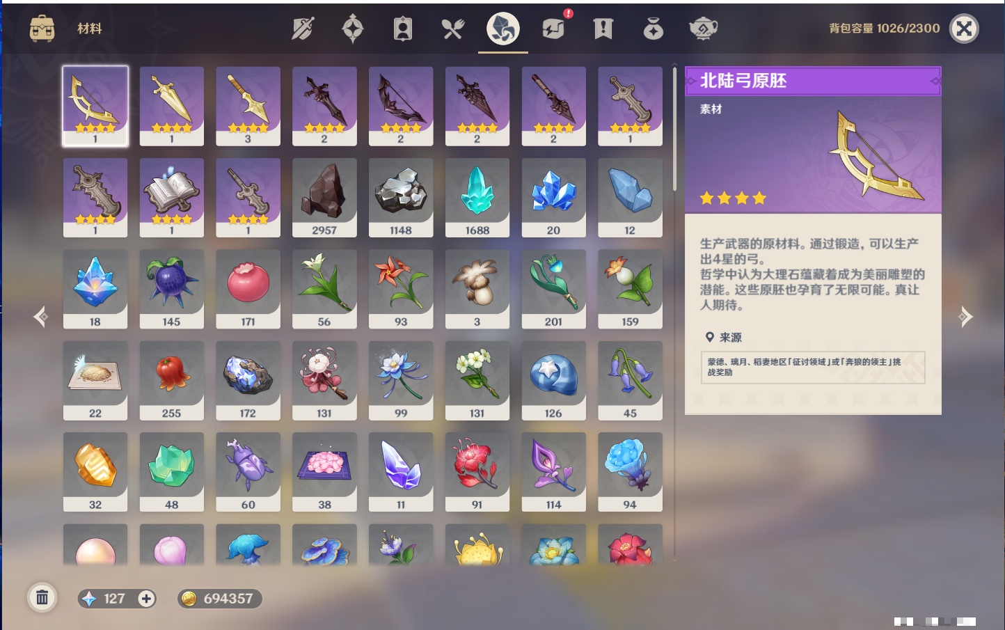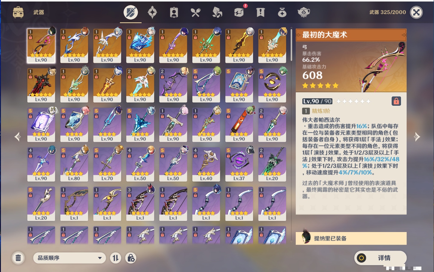 【12个五星武器】,精2天空之刃,精1最初的大魔术,精1若水,精1阿莫斯之弓,精1万世流涌大典,精1薙草之稻光,精1和璞鸢,精1贯虹之槊,精1天空之脊,精1狼的末路,精1裁叶萃光,精1圣显之钥,