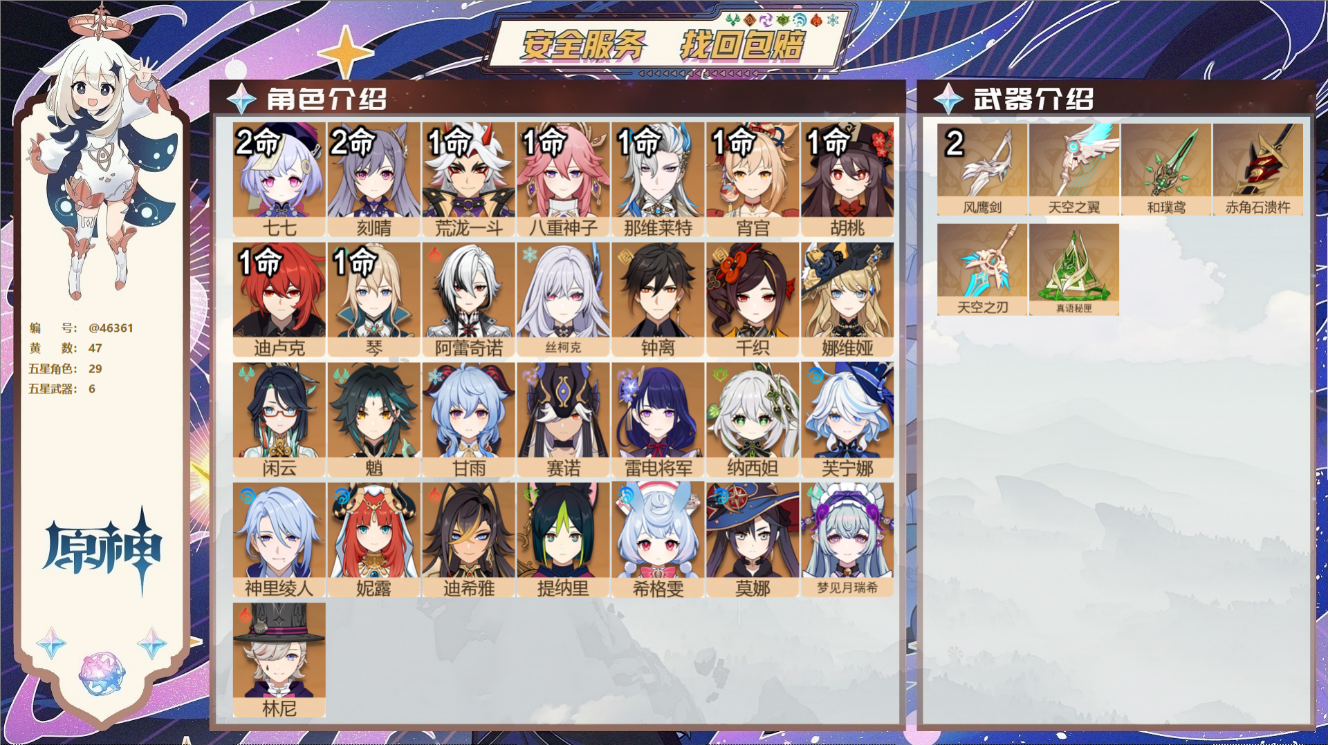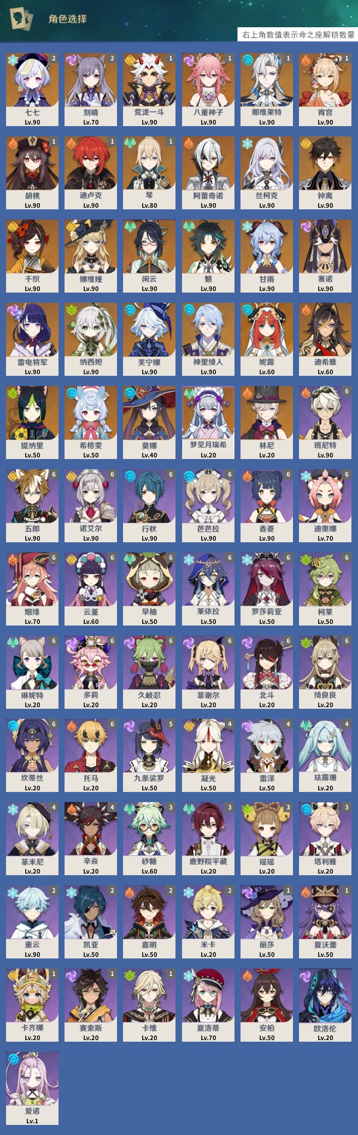 【29个五星角色】,2命七七,2命刻晴,1命荒泷一斗,1命八重神子,1命那维莱特,1命宵宫,1命胡桃,1命迪卢克,1命琴,0命阿蕾奇诺,0命丝柯克,0命钟离,0命千织,0命娜维娅,0命闲云,0命魈,0命甘雨,0命赛诺,0命雷电将军,0命纳西妲,0命芙宁娜,0命神里绫人,0命妮露,0命迪希雅,0命提纳里,0命希格雯,0命莫娜,0命梦见月瑞希,0命林尼,