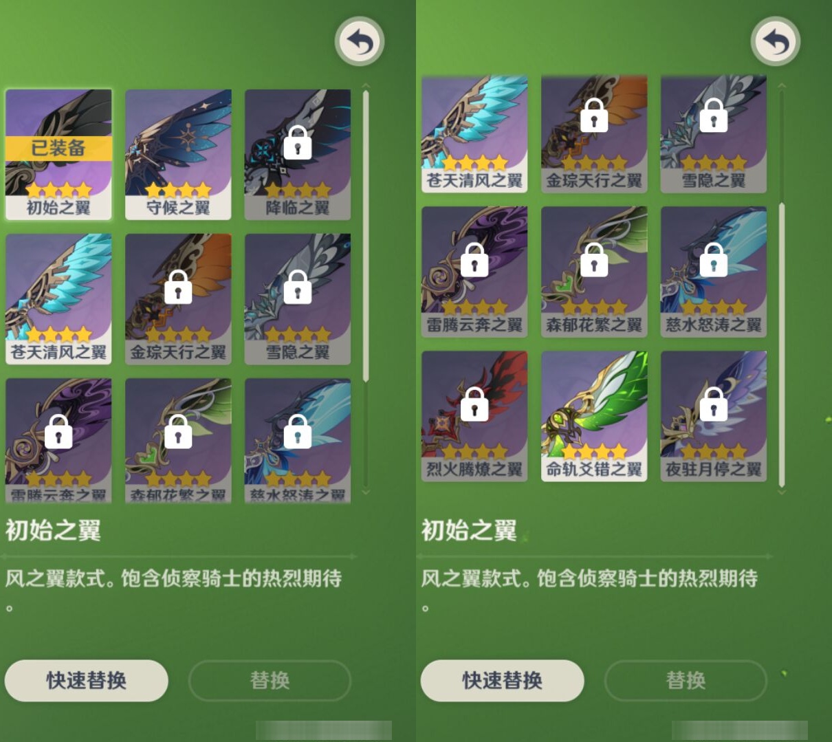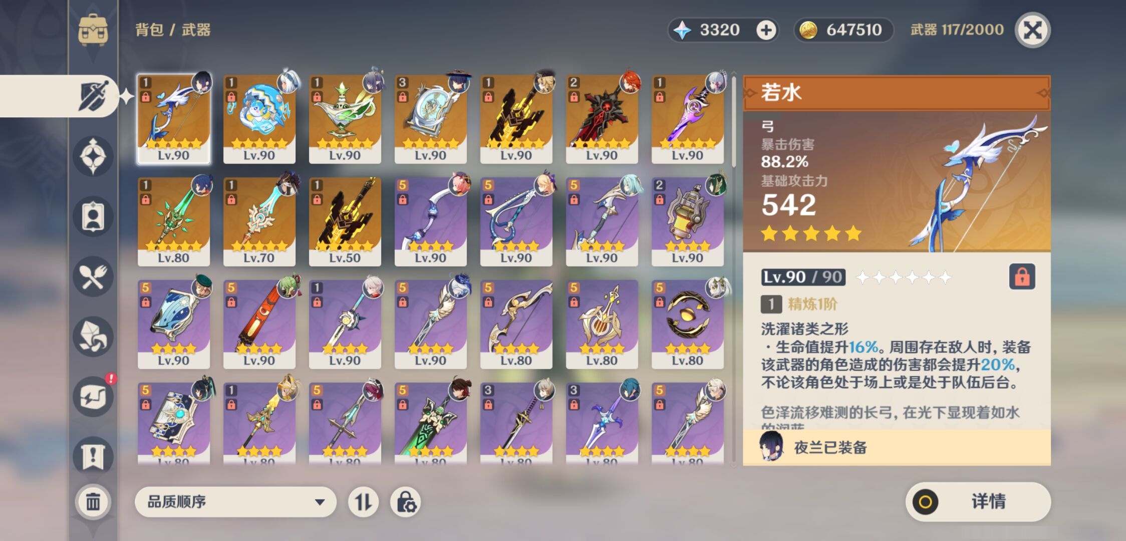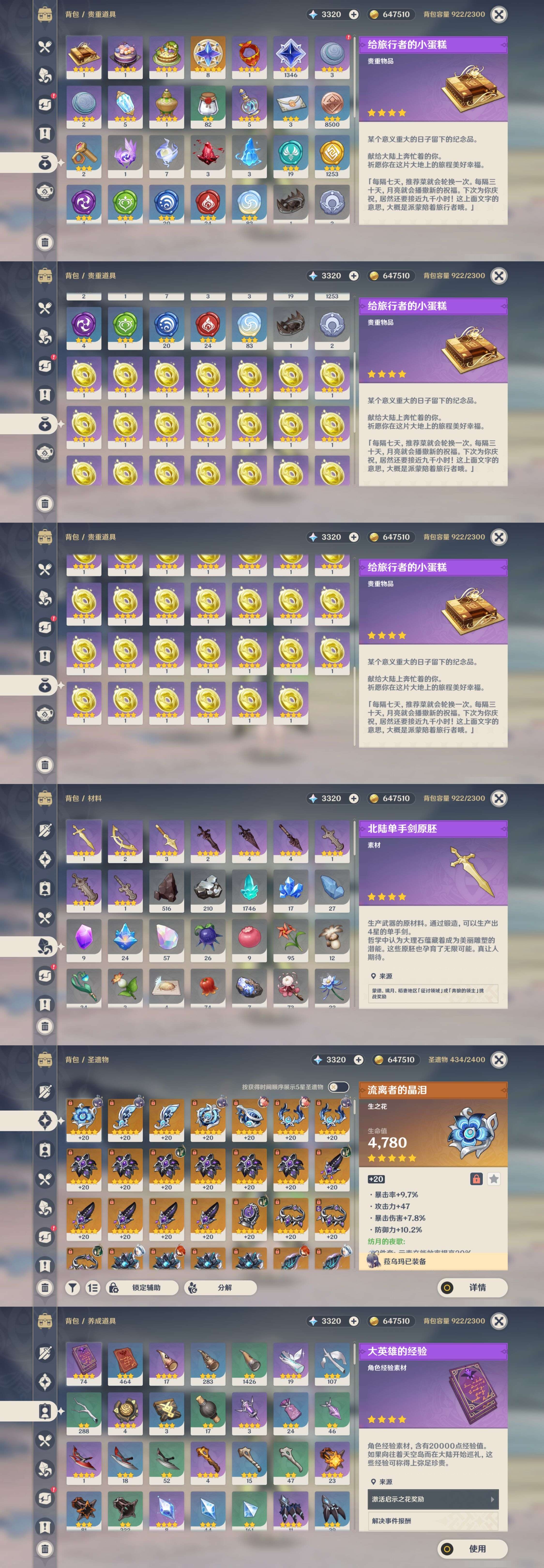 【10个五星武器】,精3四风原典,精2狼的末路,精1若水,精1和璞鸢,精1冲浪时光,精1天空之脊,精1千夜浮梦,精1无工之剑,精1无工之剑,精1雾切之回光,5套,