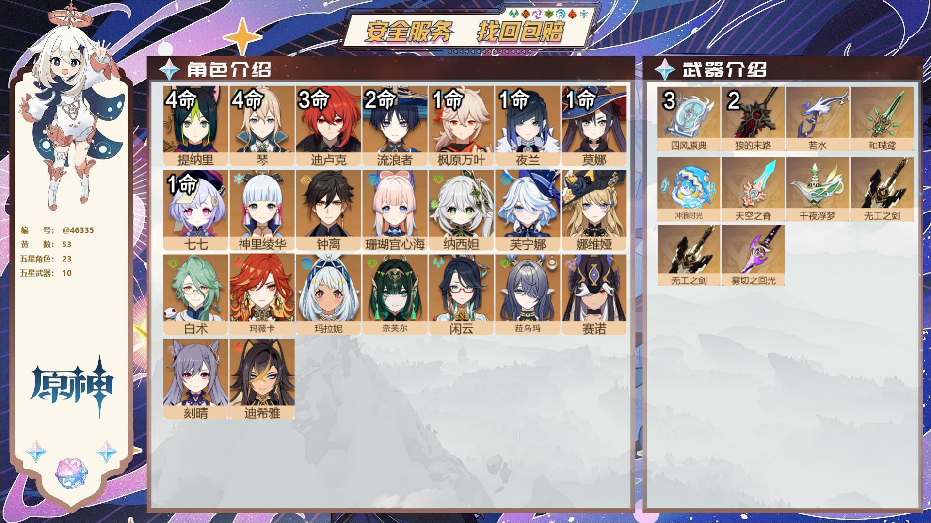 PX_2271263-,邮箱不出售,,冒险等级60级,女主,53黄,23个五星角色,10个五星武器,纠缠之源0--原石3320--圣遗物434--【时装】,帆影游风,极夜真梦,雨化竹身,叶隐芳名,炽绘奇旅,