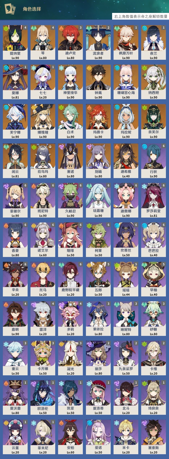 【23个五星角色】,4命提纳里,4命琴,3命迪卢克,2命流浪者,1命枫原万叶,1命夜兰,1命莫娜,1命七七,0命神里绫华,0命钟离,0命珊瑚宫心海,0命纳西妲,0命芙宁娜,0命娜维娅,0命白术,0命玛薇卡,0命玛拉妮,0命奈芙尔,0命闲云,0命菈乌玛,0命赛诺,0命刻晴,0命迪希雅,