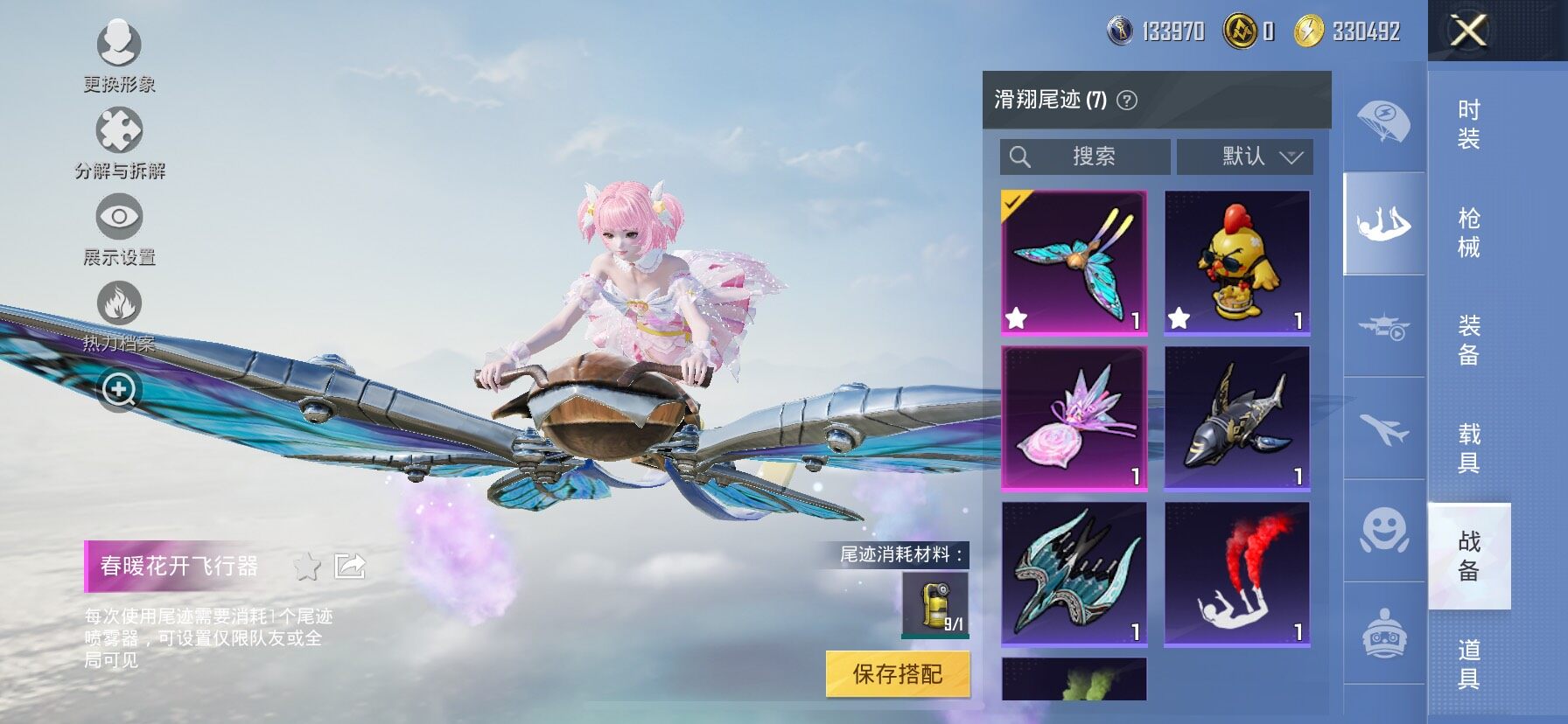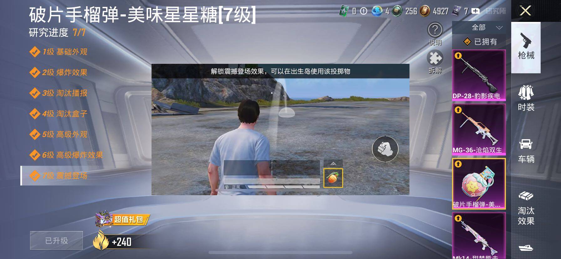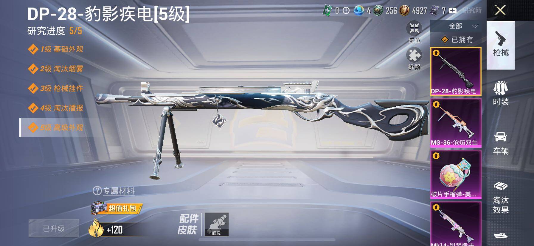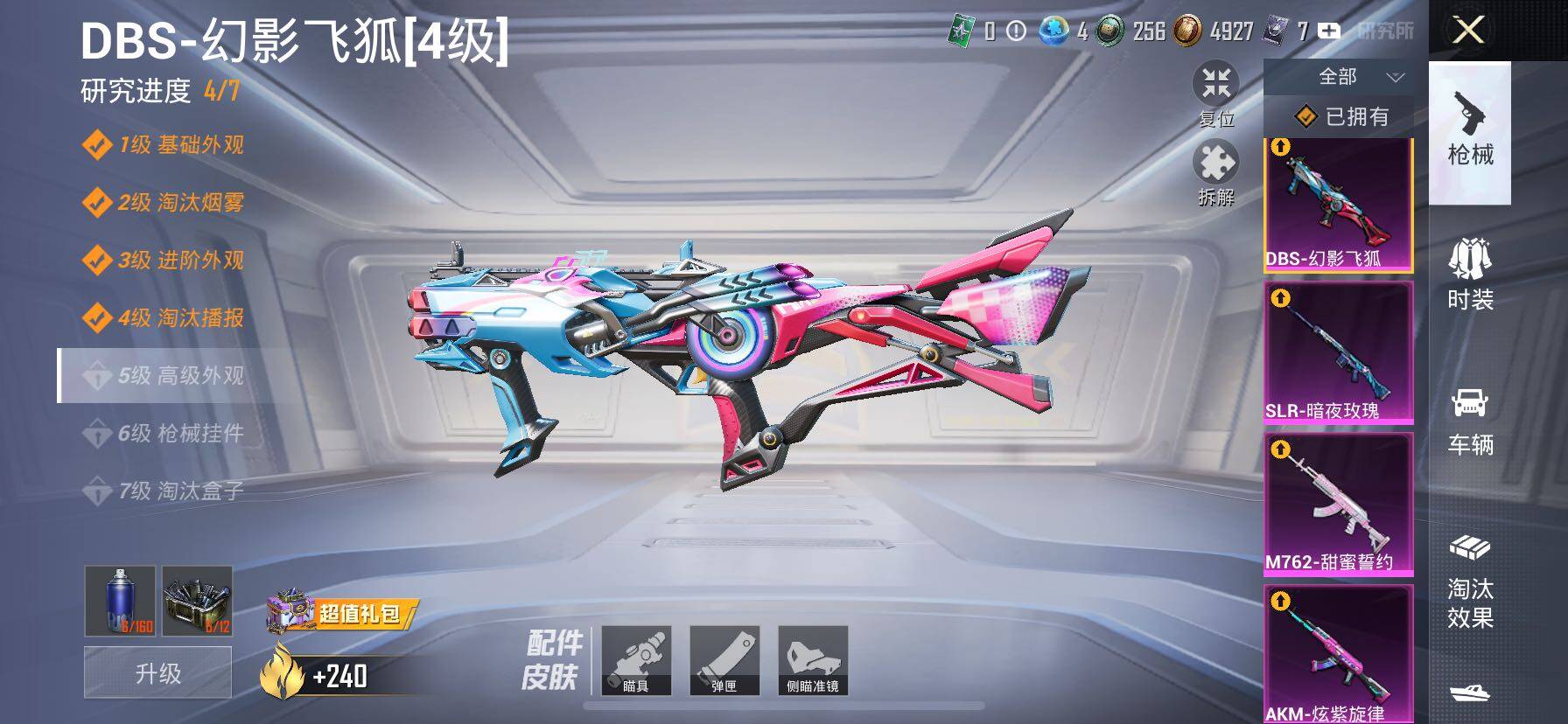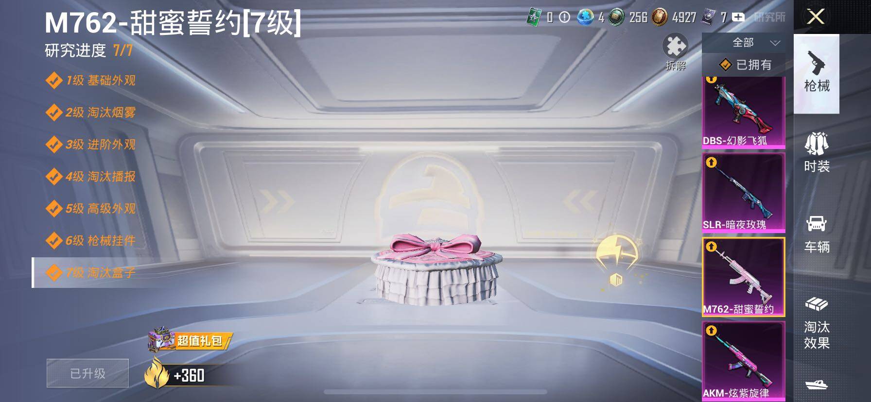 【7特效枪】,AKM-炫紫旋律,(5级),M762-甜蜜誓约,(7级),MG-36-沧焰双生,(5级),DP-28-豹影疾电,(5级),Mk14-甜梦熊击,(5级),DBS-幻影飞狐,(4级),SLR-暗夜玫瑰,(4级),