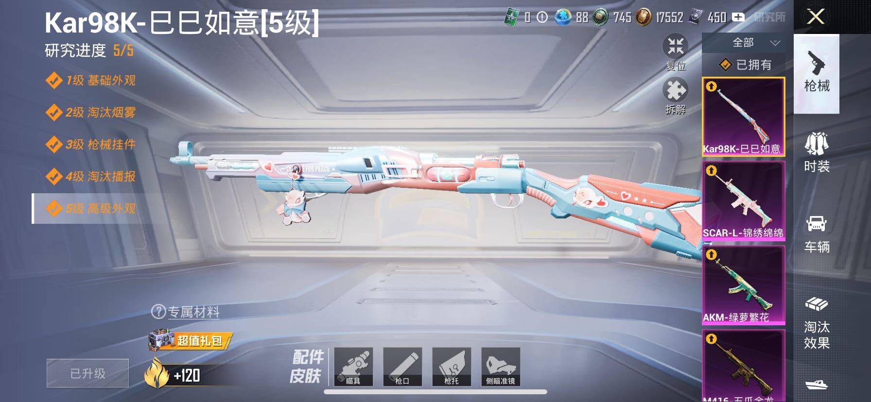 【4特效枪】,M416-五爪金龙,(7级),SCAR-L-锦绣绵绵,(5级),AKM-绿萝繁花,(5级),Kar98K-巳巳如意,(5级),