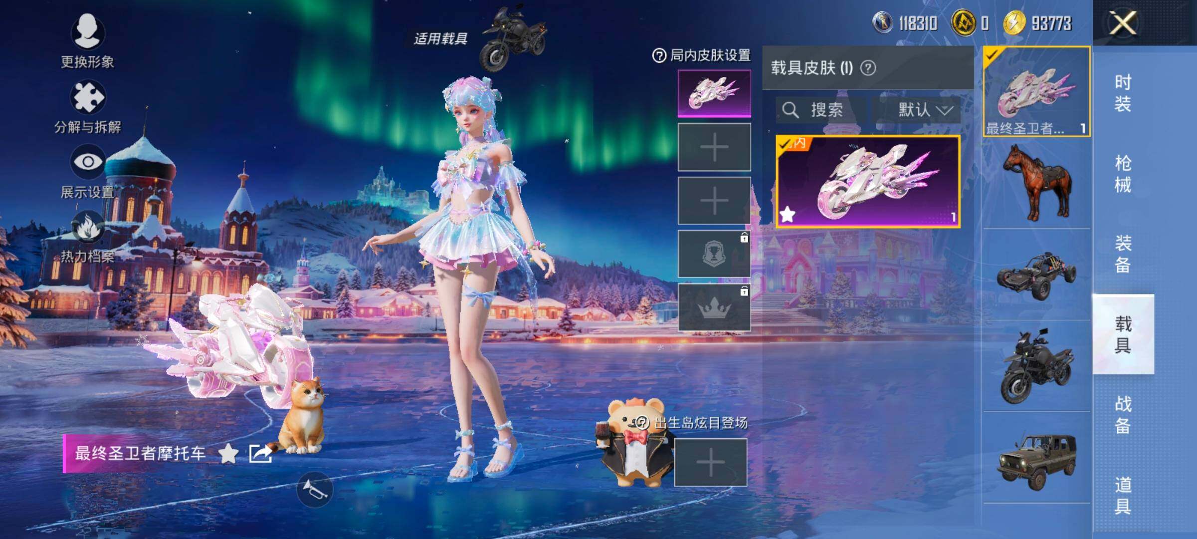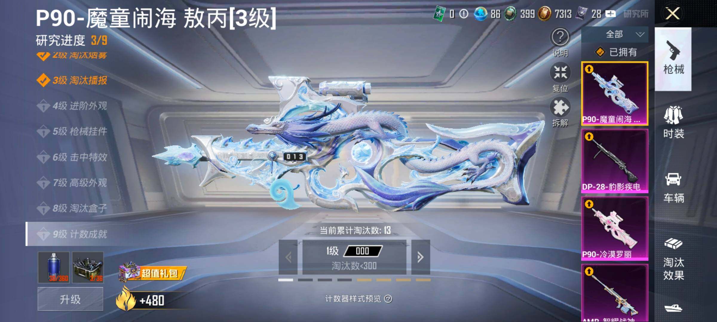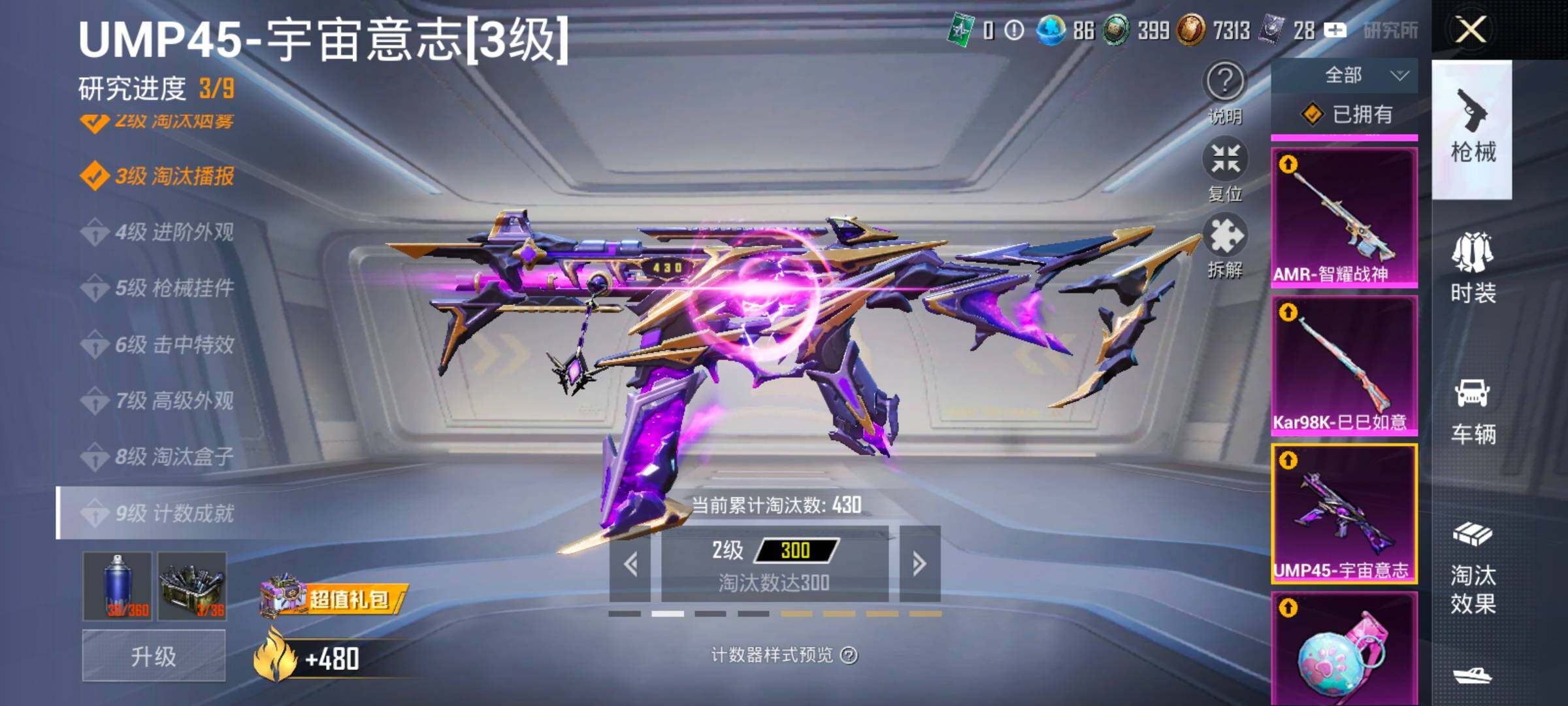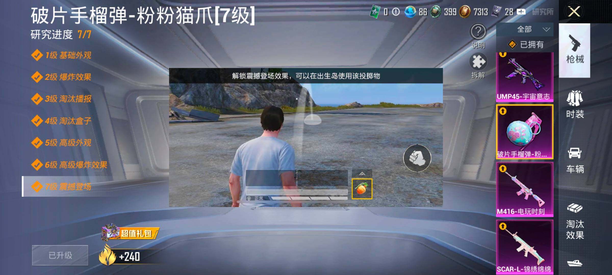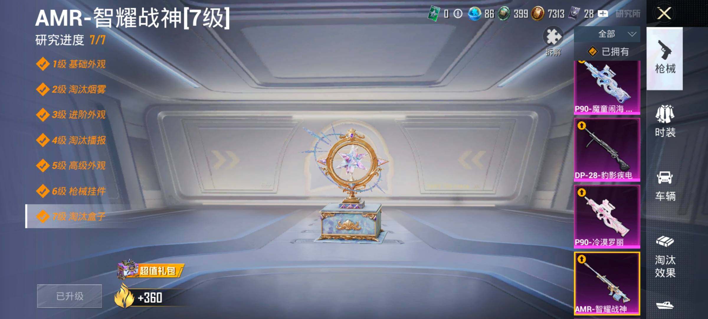 【9特效枪】,SCAR-L-锦绣绵绵,(5级),P90-魔童闹海敖丙,(3级),M416-电玩时刻,(5级),P90-冷漠罗丽,(7级),UMP45-宇宙意志,(3级),Kar98K-巳巳如意,(5级),DP-28-豹影疾电,(5级),AMR-智耀战神,(7级),破片手榴弹-粉粉猫爪,(7级),