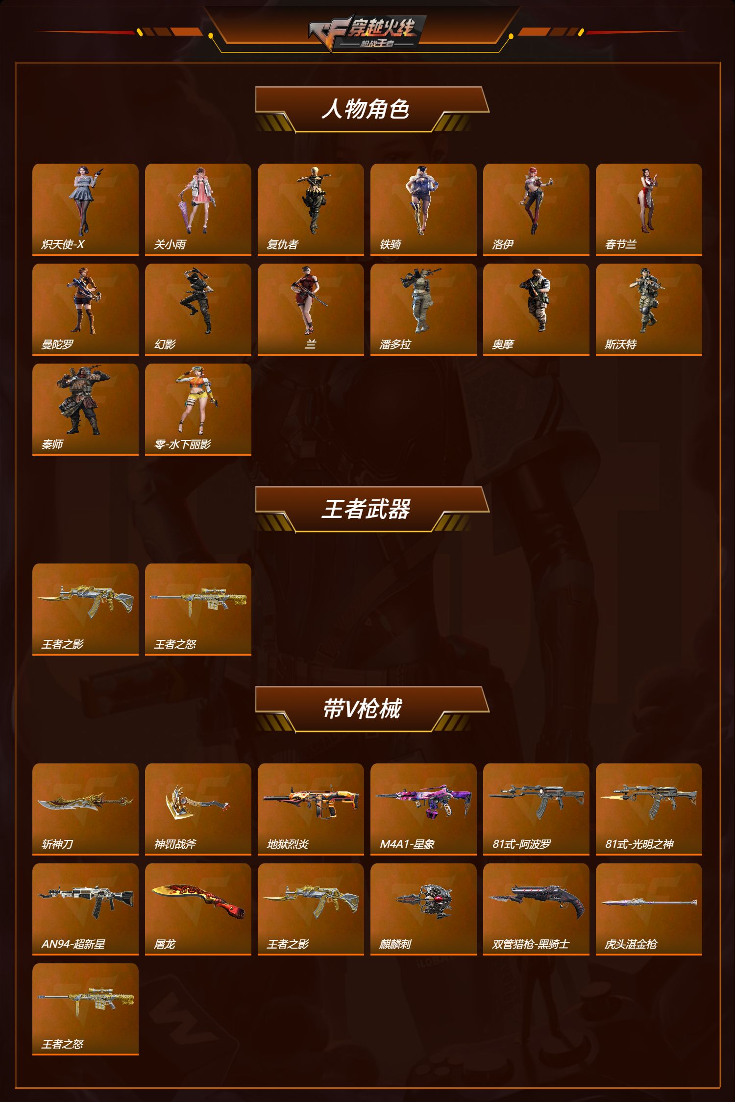 【铜V武器】焕·蝴蝶刀,AK47-雷斯库瓦-觉醒,焕·M4A1-S,焕·斯泰尔-月神,SCAR-电竞荣耀·情久,漫·环保98K,AK47-牛魔王,白骨刃,M4A1-电竞荣耀·LGD,闪光弹-浪子娃,沙鹰-鹰眼娃,AK47-喷火娃,烟雾弹-隐身娃,闪光弹-浪子娃,KSG-悟能,G36-竞技亚魂,丛林匕首-庆龙,P90-突突兔,81式-阿波罗,QBZ97-岚,TAC-晴,G3A3-五色琉璃,SKS-女妖之咒,AK47-塔罗牌,柯尔特-伏刹山海
