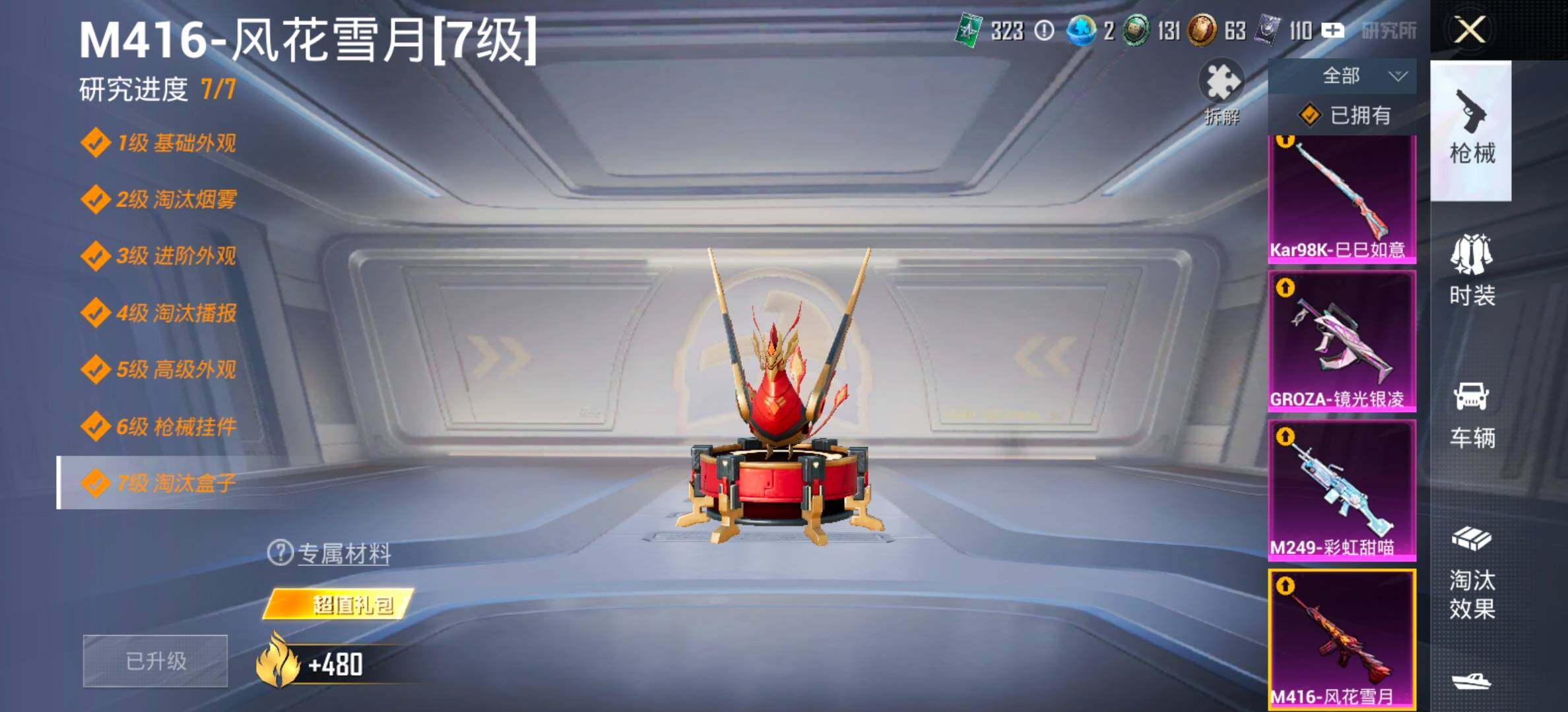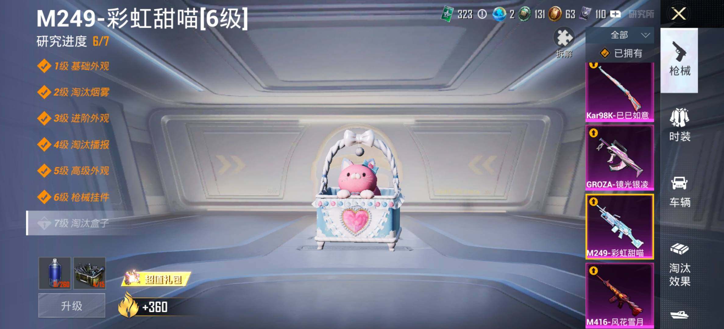 【7特效枪】,Kar98K-巳巳如意,(5级),MG-36-幻彩电音,(5级),DP-28-豹影疾电,(5级),AUG-暖羊咩咩,(5级),GROZA-镜光银凌,(5级),M416-风花雪月,(7级),M249-彩虹甜喵,(6级),