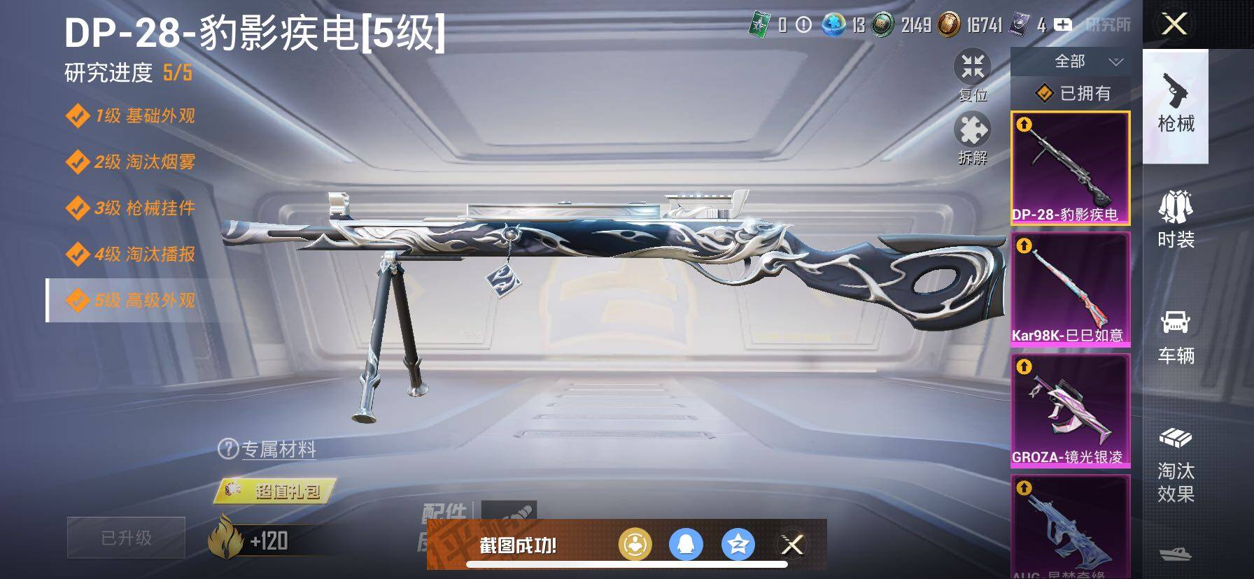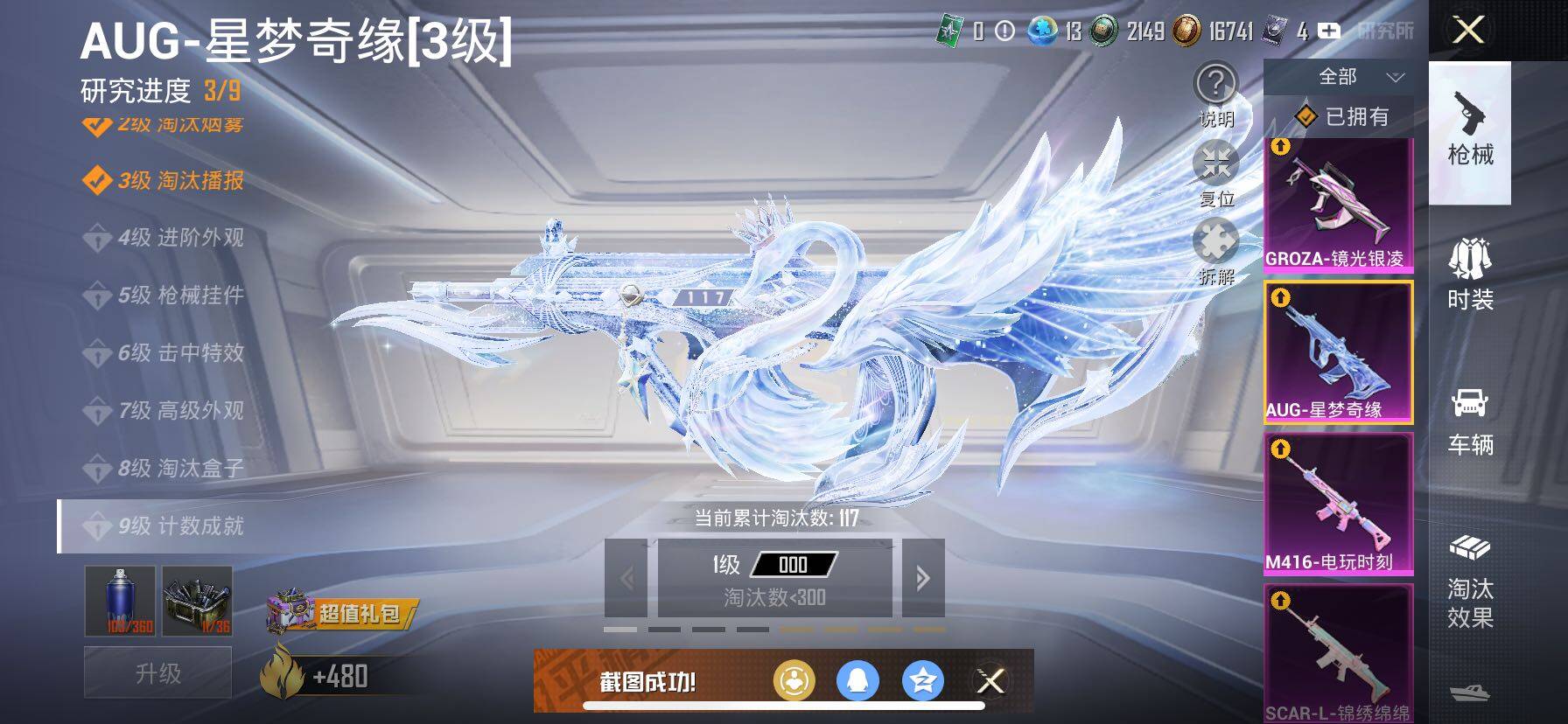 【8特效枪】,SCAR-L-锦绣绵绵,(5级),M416-电玩时刻,(5级),AKM-绿萝繁花,(5级),Kar98K-巳巳如意,(5级),DP-28-豹影疾电,(5级),AUG-星梦奇缘,(3级),GROZA-镜光银凌,(5级),Vector-环太平洋,(7级),