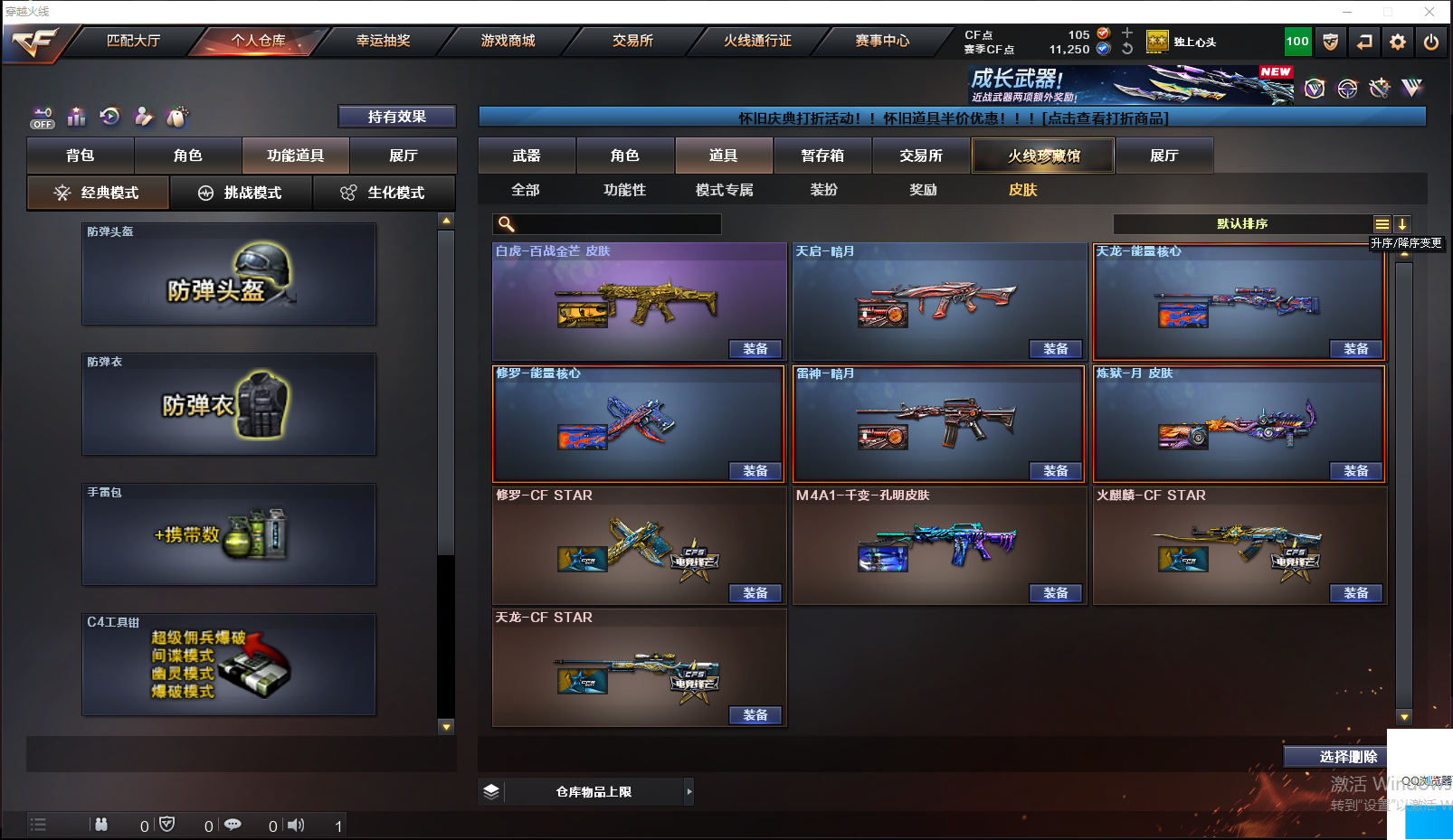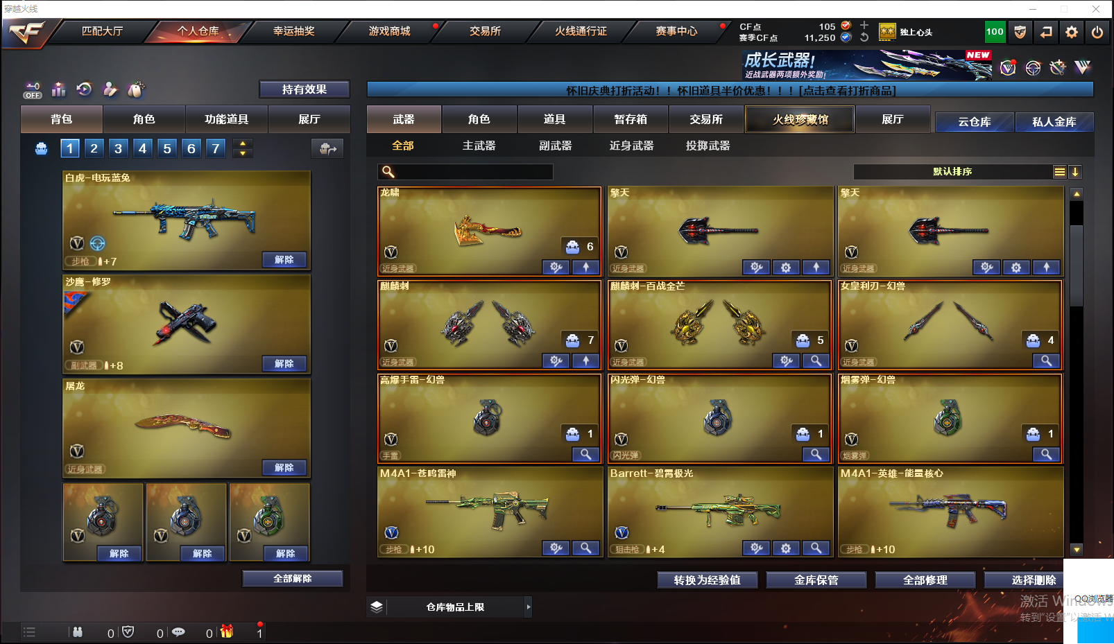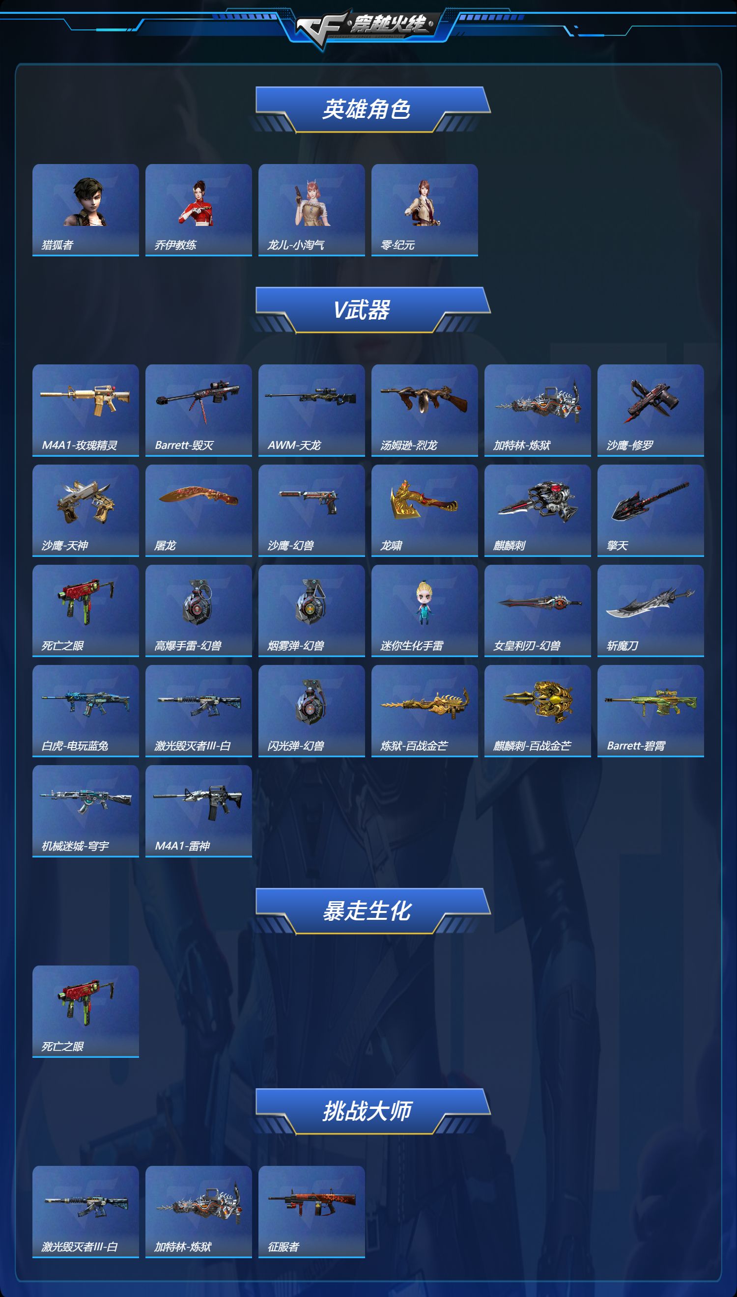 【英雄级武器】Barrett-毁灭,QBZ03-独角-III,白虎-电玩蓝兔,Barrett-碧霄极光,炼狱-百战金芒,M4A1-再燃火线,麒麟刺-百战金芒,机械迷城-穹宇,女皇利刃-幻兽,沙鹰-幻兽,烟雾弹-幻兽,闪光弹-幻兽,高爆手雷-幻兽,沙鹰-天神,麒麟刺,沙鹰-天神,擎天,AWM-天龙,龙啸,擎天,M4A1-雷神,龙啸,沙鹰-天神,AWM-天龙,M4A1-雷神,M4A1-雷神,M4A1-玫瑰精灵,屠龙,沙鹰-修罗,加特林-炼狱,AWM-天龙,M4A1-雷神,龙啸,汤姆逊-烈龙