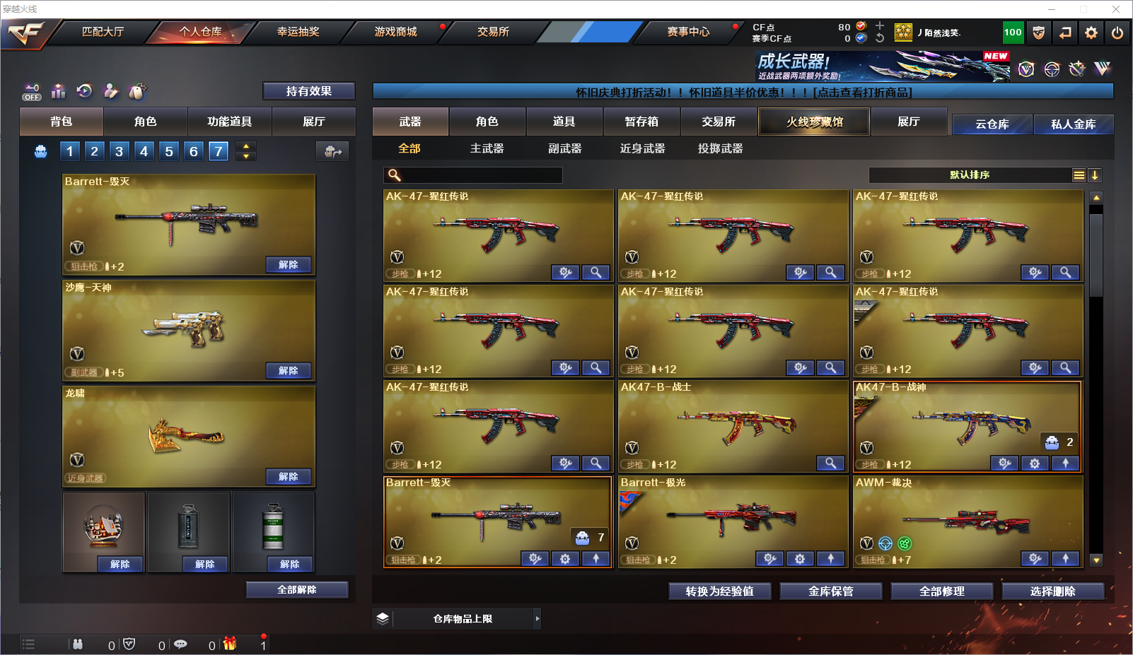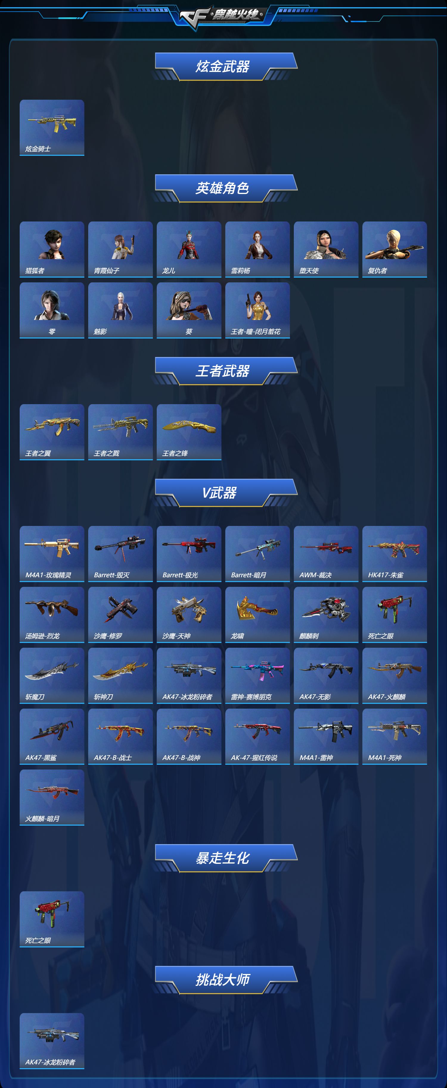 【王者级武器】王者之武-觉醒版,王者之翼,王者之戮,王者之锋【炫金级武器】炫金骑士,炫金骑士【英雄级角色】零,葵,魅影【英雄级武器】HK417-朱雀,沙鹰-修罗,龙啸,麒麟刺,沙鹰-修罗,AK47-黑鲨,AK47-无影,AWM-裁决,AK-47-猩红传说,AK-47-猩红传说,AK-47-猩红传说,Barrett-暗月传说,AK-47-猩红传说,AK-47-猩红传说,M4A1-雷神,AK-47-猩红传说,AK47-B-战神,AK-47-猩红传说,AK-47-猩红传说,AK47-B-战士,AK-47-猩红传说,Barrett-毁灭,汤姆逊-烈龙,AK47-无影,沙鹰-天神,AK47-火麒麟,Barrett-极光,M4A1-死神,汤姆逊-烈龙,M4A1-玫瑰精灵