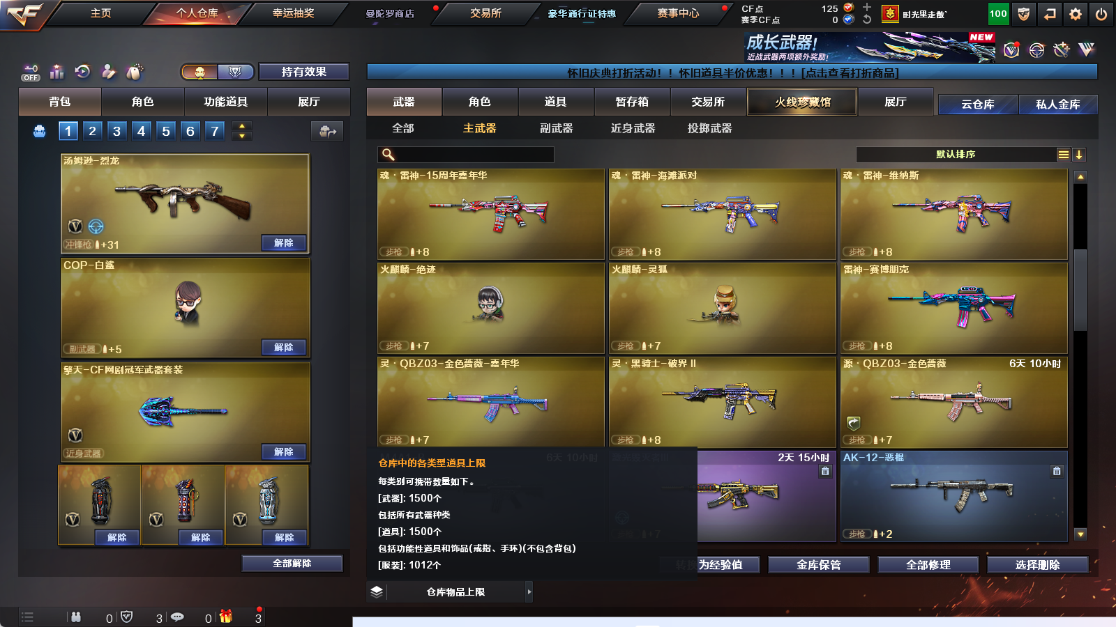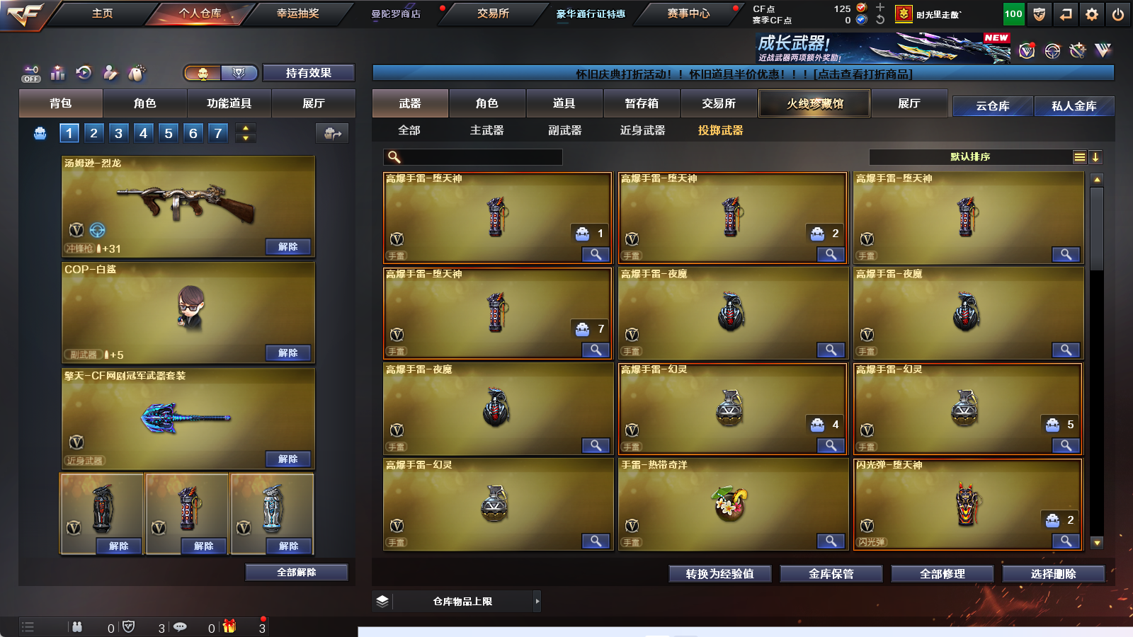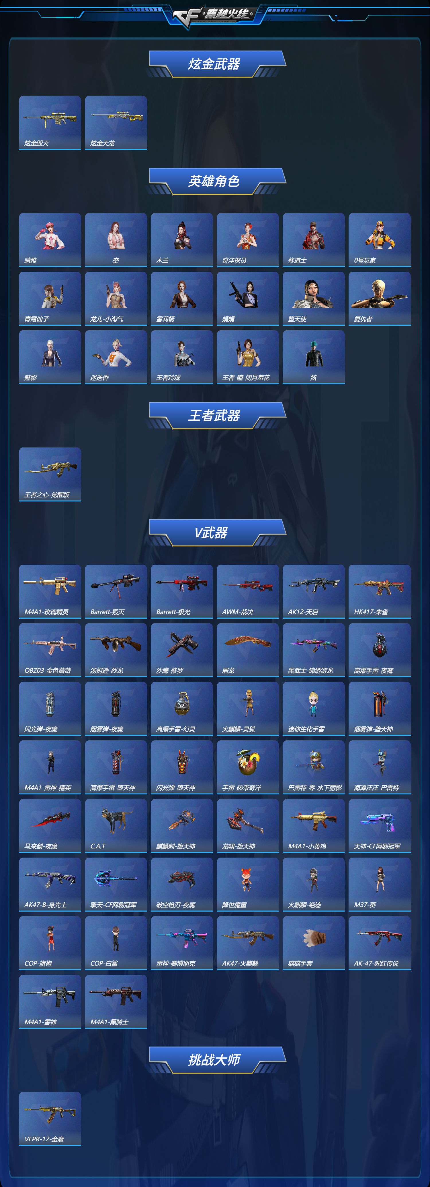 【普通武器】降世魔童,死亡之眼-电子连击,加利尔ACE-零号,精英手雷II,愤怒公牛左轮-枪王排位,流光斩魔刀-枪王排位,AK47-圣诞节[2019],EVO3A1-温暖冬日,幻影沙鹰-枪王排位,虹光丛林匕首-枪王排位,虹光鹰爪-枪王排位,招财猫-枪王排位,蝴蝶刀-枪王排位,黄金Anaconda,M16A2-破界,Anaconda-雷电核心,Anaconda-电子连击,柯尔特-涂鸦,金箍棒,AWM-破界,SteyrAUGA1,TAR21,瓦尔特WA2000,98K-电子连击,G36C-宇航兔兔,CF05-秦师,暗金M200,M200-大黄蜂,Spas-12-幻能朋克,AK47-荆桃,动力CPW-,新春神龙,AWM-冥府犬,SPAS-12-卡通,M240B-卡通,疾爆手雷-电子连击,Scar,Light-电子连击,手雷-万圣节2021,激光长刃-朋克,M82A1-水枪,AK47-魔将,沙鹰-魔将,CBS-魔将,M200-美杜莎,M4A1-火线初心,M4A1-水枪,龙珠,QBZ03-电子连击,闪光弹-静谧之夜,EVO,III-祥云,M4A1-圣诞2021,动力CPW-锦绣游龙,暗金鹰爪,尼泊尔-大黄蜂,Scarlight-炫彩,愤怒的公牛-朋克,Cop,357-秦师,闪光弹-11周年,EVOIII-神兵利器,新USP-春桃,新USP-锋芒破茧,COP-金蝉子-枪王排位,幻影双斧-枪王排位,胜利奖杯闪光弹-枪王排位,幻影Anaconda-枪王排位,M4A1-T,银色M4A1-A,闪光弹-维纳斯,幻影扳手-枪王排位,幻影沙鹰-枪王排位,白银警棍,沙漠之鹰-暗炎,黄金尼泊尔,mac-10-蒸汽钟表,Cop357-灵狐,CPW-灵狐,军用手斧-灵狐,AK47-蓝水晶,AK47-轮回,疾爆手雷-9周年,AWM-7周年,棒球棒-像素,闪光弹-像素,粉色烟雾弹-娜塔莉娅,EVO,III-锦绣游龙,月饼手雷,FR-F2-彩蝶,Barrett-神兵利器,Cop357-迷彩,M4A1-暗金风暴,Barrett-蒸汽钟表,Colt,1911-锦绣游龙,幻刃-枪王排位S28,QBZ95,紫色烟雾弹-神秘黑洞,粉色烟雾弹-萌杀,猫猫手套,沙漠之鹰-苍龙,汽锤-小故障,5-枪王排位,汽锤-醒狮,G36-精英,Cop357-娜塔莉娅,Cop357-凤灵,闪光弹-二次元蓝,闪光弹-锦绣游龙,高爆手雷-机甲刑天,煤炭-圣诞节2023,龙拳,Barrett-苍龙,森林灭火神器-打火鞭,M200-枪王排位,EVO,III-烈虎,破天狂龙,AA-12-圣龙,魔能镰刀,百城AK47,Anaconda-恶棍,AK-12-恶棍,AWM-恶棍,枪王之刃,OTs-23-精英爆破,精英手雷III,紫色烟雾弹-神秘黑洞,M4A1-狼牙,闪光弹-关羽,新USP-锋芒破茧,彩蛋-捣乱兔兔,粉色烟雾弹-幻能朋克,AK47-火种,沙鹰-醒狮,闪光弹—道聚城,M4A1-朋克,COP,357-平天大圣,闪光弹-黄钻贵族,毛瑟军用手枪,M249-幽灵,闪光弹-独角兽,M4A1-蓝水晶,激光长刃-朋克,98K-幻能朋克,贝雷塔-李思楠,沙鹰-御龙,马来剑-独角兽,COP,357-独角兽,粉色烟雾弹-15周年嘉年华,尼泊尔-翡翠,水晶双管猎枪,QBZ03-月,M4A1-T,Spas-12-幻能朋克,M4A1-凤灵,汽锤-醒狮,Barrett,M82A1,破天九龙,闪光弹-擎天柱,新USP-春桃,闪光弹-京剧黄,惨叫鸡高爆手雷,M200-月,M200-醒狮,闪光弹-大黄蜂,M200-清凉夏日,贝雷塔687-醒狮,蓝色烟雾弹,黄色烟雾弹,AWM-银月,沙鹰-醒狮,M6突击步枪,魔能飞环-曼陀罗,新USP-枪王排位奖励,新USP-枪王排位奖励,MAC-10-涂鸦,迷你生化手雷,迷你生化手雷,MAC-10-涂鸦,胜利之火,虹光丛林匕首-枪王排位,军用手斧-平天大圣,闪光弹-QQ20周年,Barrett-麟龙,5-红水晶,尼泊尔军刀,雄黄酒手雷,粽子手雷限定版,双生雷-恶棍,军用铁锹-蓝钻,黄金M14EBR,沙漠之鹰-苍龙,EVOIII-炫光四叶草,刘易斯枪,沙漠之鹰-战龙,Anaconda-麟龙,AWM-冥府犬,M1216-暗金,Cop357-迷彩,AWM-小故障,AWM-蓝水晶,绿色烟雾弹,影之刃-小故障,M4A1-蓝水晶,尼泊尔-凤灵,98K-黑金,AK47-紫鸢,M700,新USP-枪王排位奖励,招财猫-枪王排位,环刃-枪王排位,USP-黑大圣,闪光弹-巨浪,海滩汪汪-巴雷特,魔能飞环-曼陀罗,沙鹰-蓝水晶-曼陀罗,闪光弹-神兵利器,EVOIII-神兵利器,AWM-灵狐-15周年嘉年华,霓虹左轮-枪王排位,手雷-15周年嘉年华,荣耀之证-荣耀之巅,暗杀者-街机,街机小灰机,COP-白鲨,灵狐卡片-15周年嘉年华,粉色烟雾弹-15周年嘉年华,M4A1-紫狱,QBZ03-街机,精英手雷VII,蝴蝶刀-枪王排位,23-湛蓝裂痕,荣耀之证-荣耀之巅,太极扇-锋芒,EVO,III-秘银,M4A1-小黄鸡,手雷-炫彩,G36C-宇航兔兔,FAMAS,G2-炫彩,愤怒公牛左轮-丹龙,丛林匕首-玫瑰,激光匕首,Cop.,357,彩蛋,蓝色烟雾弹-机甲刑天,EVO,III-蓝色魅影,QBZ95-泰坦,HK417-遗迹,碳合金短刀-9周年,胡萝卜匕首,糖衣炮弹,柯尔特-萌杀,斩神刀-青帝,红龙SCARLight,斯特林-熔岩,KAC-情人节2021,蜡烛-圣诞2021,手榴弹-圣诞2021,M14EBR-粉红伪装,M4A1-蓝钻,AWM-A-圣诞2021,闪光弹-小乔,手雷-圣诞节[2019],AK47-万圣节2021,镰刀-万圣节2021,黄金沙漠之鹰,手雷-幻彩,萨维奇110,麦特左轮,蟒蛇,M60,Anaconda,Cop357-迷彩,巴雷特-绚樱,Colt,1911-大黄蜂,M14EBR-大黄蜂,迷彩沙鹰-70KG,Colt,1911-大黄蜂,AWM-卡通,AK47-十年火线,AWM-涂鸦,M37-葵,闪光弹-枪娘,闪光弹-万圣节2019,M14EBR-CFS,2020,粽子手雷加强版,沙漠之鹰-暗杀者,鹰爪-暗夜,AK47-QT,丛林匕首-紫鸢,Colt,1911-大黄蜂,AK-103-红色悦动,凤凰之锋,M4A1-红色线条,PMR,30-金色豹纹,M4A1-QT,斩魔刀-白龙,暗杀者-绿豆,Anaconda-黑金神龙,COP,357-牡丹,COP-旗袍,M4A1-秘银赤龙,沙鹰-娜塔莎,C.A.T,AWM-枪娘,AK47-娜塔莎,G3A3-SS,P90-迷彩,锤子,尼泊尔-英特尔,FAMAS,G2-碳素,强化版迅捷虫手雷,M82A1-8周年,斯泰尔-万圣节2020,烟雾弹-冠军广东,沙漠之鹰-CFS,AK47-狂欢-CFS,尼泊尔-水晶之心,M4A1-S-能量核心,爱之雷,猫猫手套,AWM-万圣节刀锋,加利尔ACE,G36K,AWM-A,尼泊尔-2018圣诞,G3A3-迷彩,M249-烈火,M14EBR-天羽,AK47-绚樱,Desert,Eagle-A,巴雷特-零-水下丽影,DesertEagle,丛林匕首-蓝色骑士,SR99-红色闪电,SMOKE,FLASHBANG,SMOKE,SMOKE,FLASHBANG,COP,357--绚樱,COP357,SMOKE,FLASHBANG,SMOKE,FLASHBANG,金丝匕首,M4A1-Guitar,炫彩,军用铁锹-荷鲁斯,GRENADE,DesertEagle,棒球棒-红色闪电,鞭炮手雷,AK-47,FL