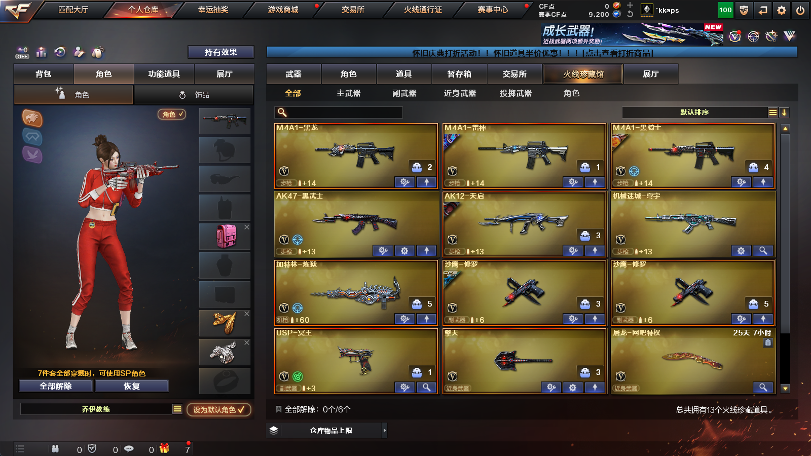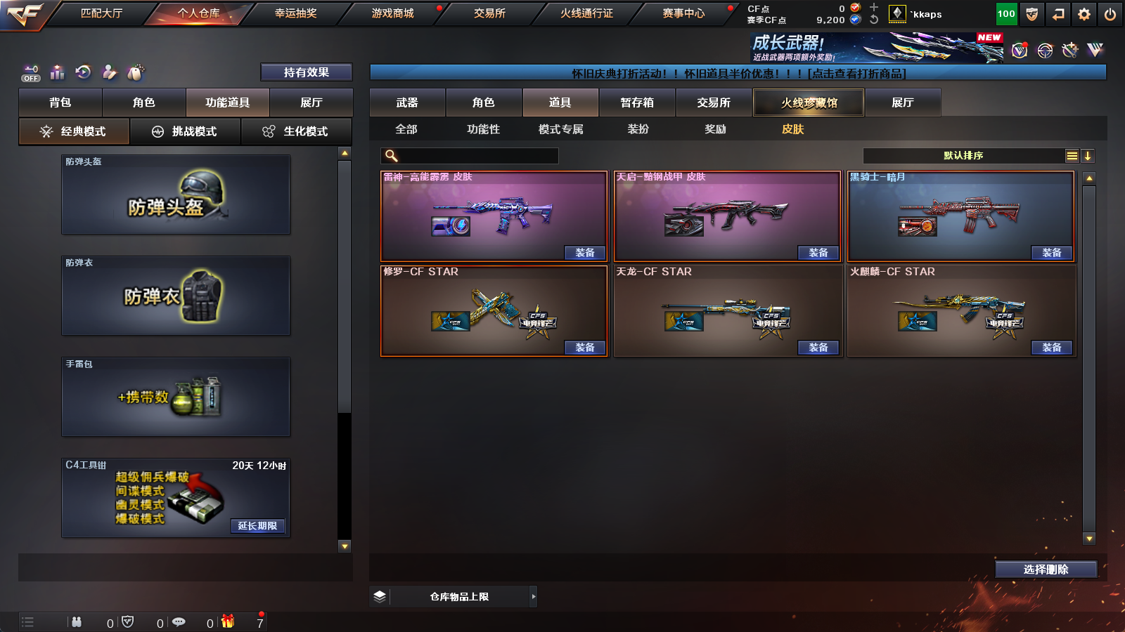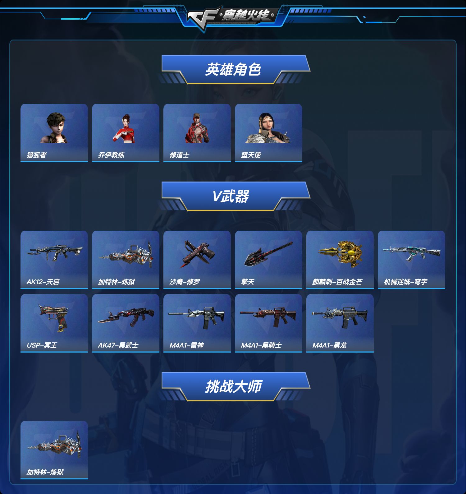 【英雄级武器】麒麟刺-百战金芒,AK12-天启,M4A1-雷神,AK47-黑武士,M4A1-黑龙,擎天,沙鹰-修罗,沙鹰-修罗,加特林-炼狱,USP-冥王,M4A1-黑骑士,机械迷城-穹宇