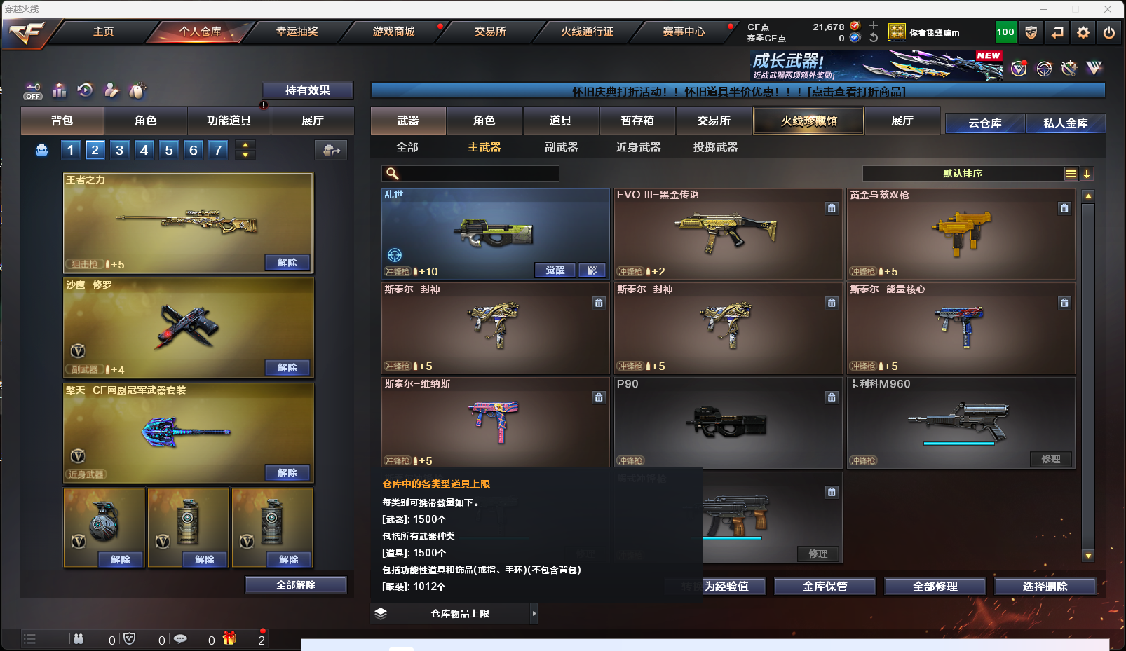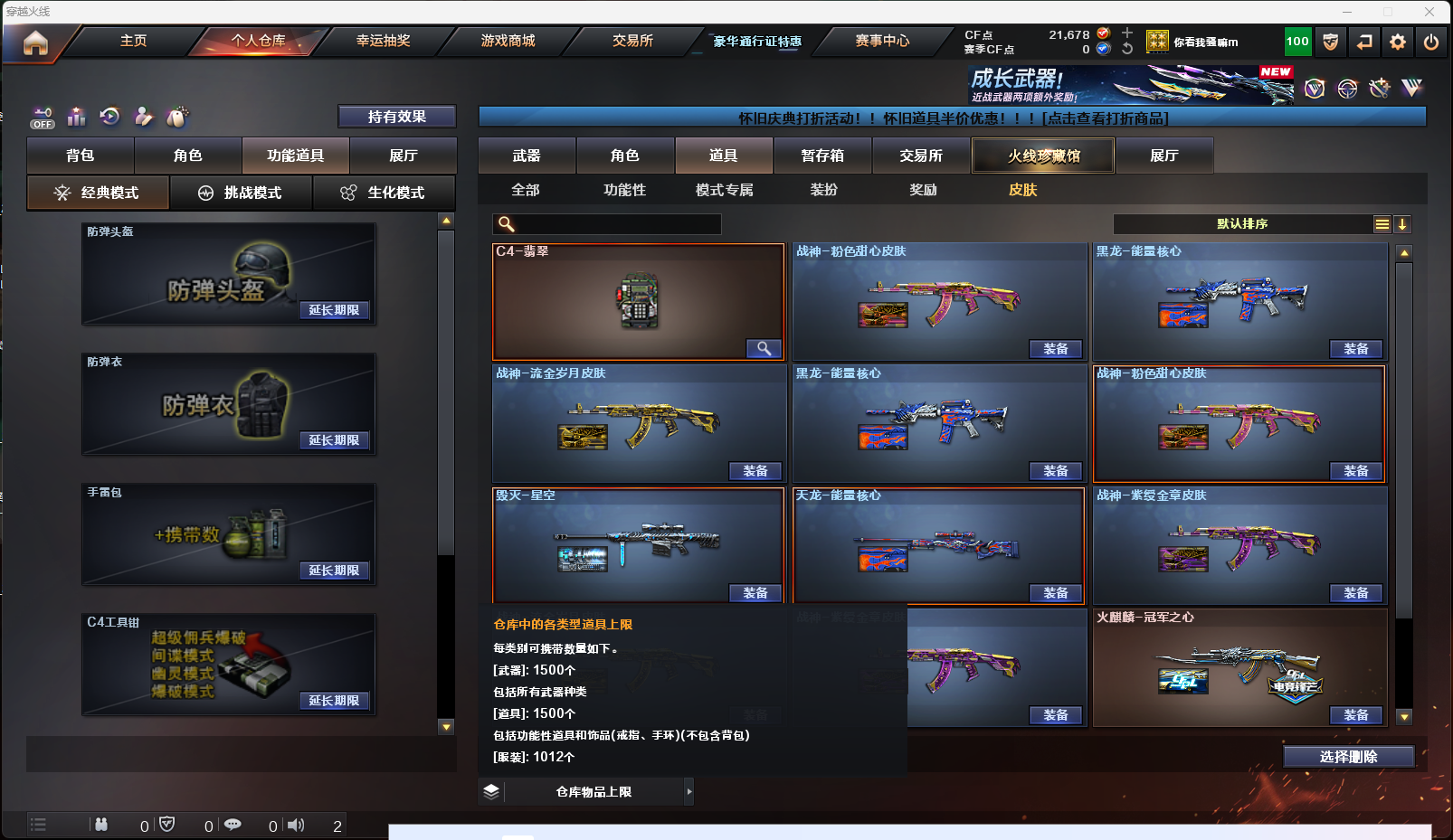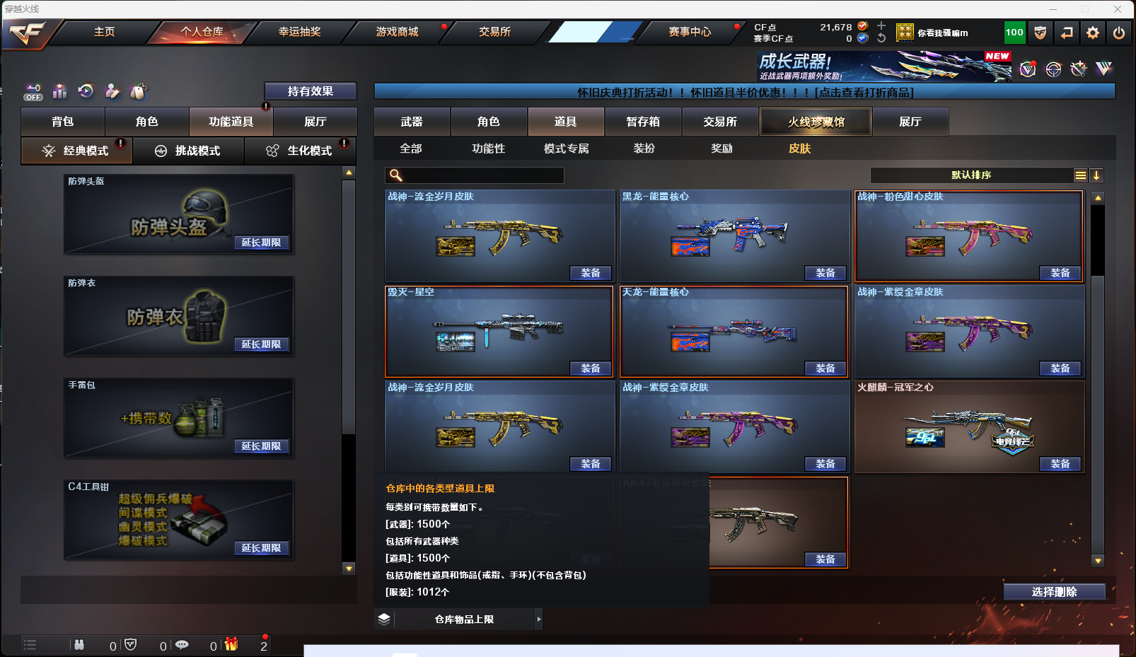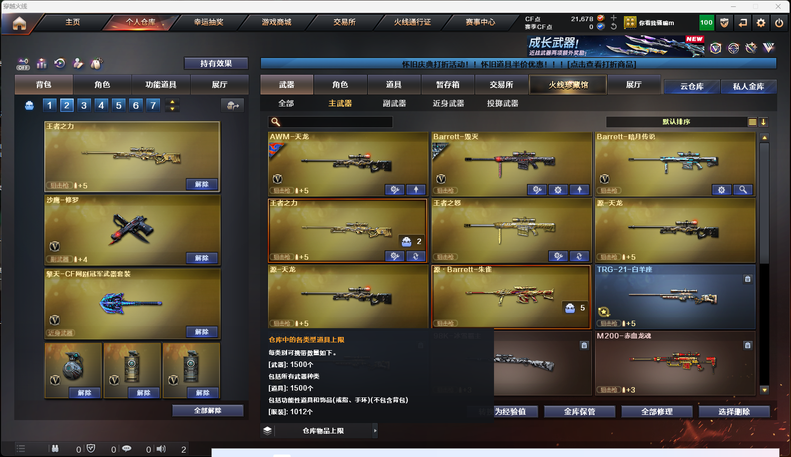 【英雄级武器】AK-47-猩红传说,AK47-黑鲨,AK-47-猩红传说,AK-47-猩红传说,M4A1-雷神,擎天-CF网剧冠军,AK47-黑武士,Barrett-暗月传说,AK47-B-战神,麒麟刺-堕天神,烟雾弹-堕天神,高爆手雷-堕天神,闪光弹-堕天神,AK47-B-战士,雷霆之锋,高爆手雷-雷霆,烟雾弹-雷霆,闪光弹-雷霆,9A91-烈火,M4A1-玫瑰精灵,M4A1-黑骑士,M4A1-武圣,Glock18-武圣,龙啸,沙鹰-修罗,屠龙,AWM-天龙,Barrett-毁灭