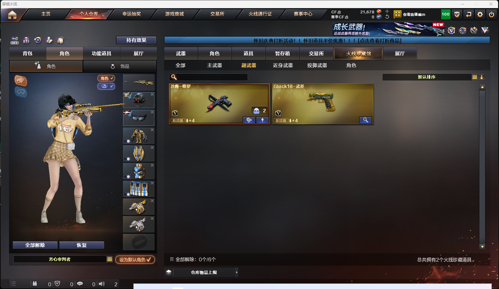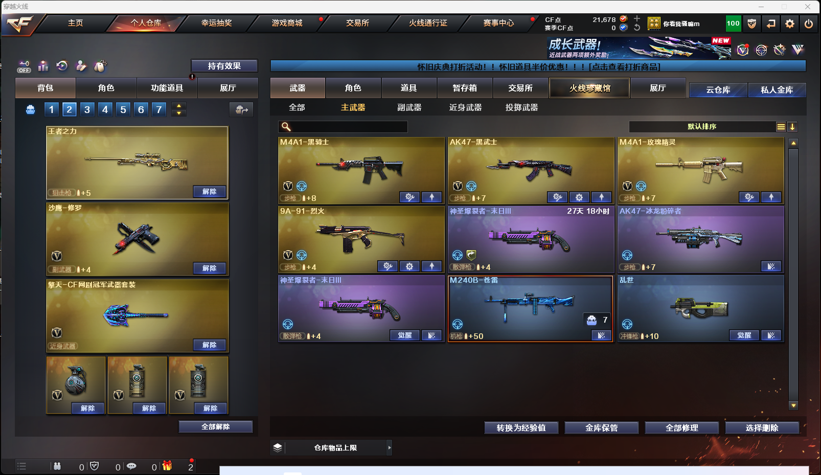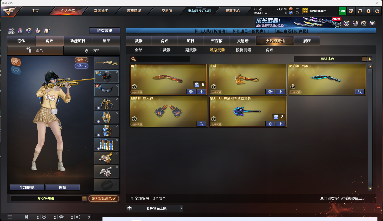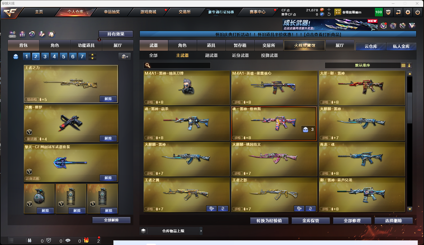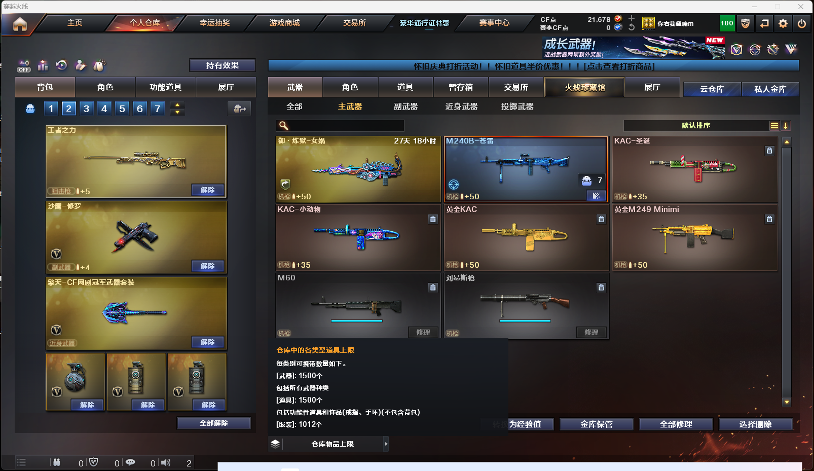 【英雄级武器】AK-47-猩红传说,AK47-黑鲨,AK-47-猩红传说,AK-47-猩红传说,M4A1-雷神,擎天-CF网剧冠军,AK47-黑武士,Barrett-暗月传说,AK47-B-战神,麒麟刺-堕天神,烟雾弹-堕天神,高爆手雷-堕天神,闪光弹-堕天神,AK47-B-战士,雷霆之锋,高爆手雷-雷霆,烟雾弹-雷霆,闪光弹-雷霆,9A91-烈火,M4A1-玫瑰精灵,M4A1-黑骑士,M4A1-武圣,Glock18-武圣,龙啸,沙鹰-修罗,屠龙,AWM-天龙,Barrett-毁灭