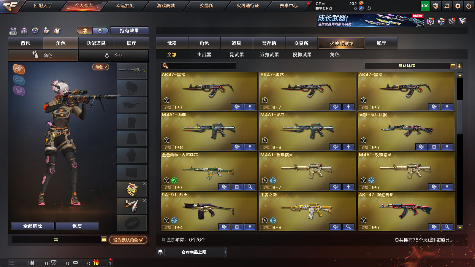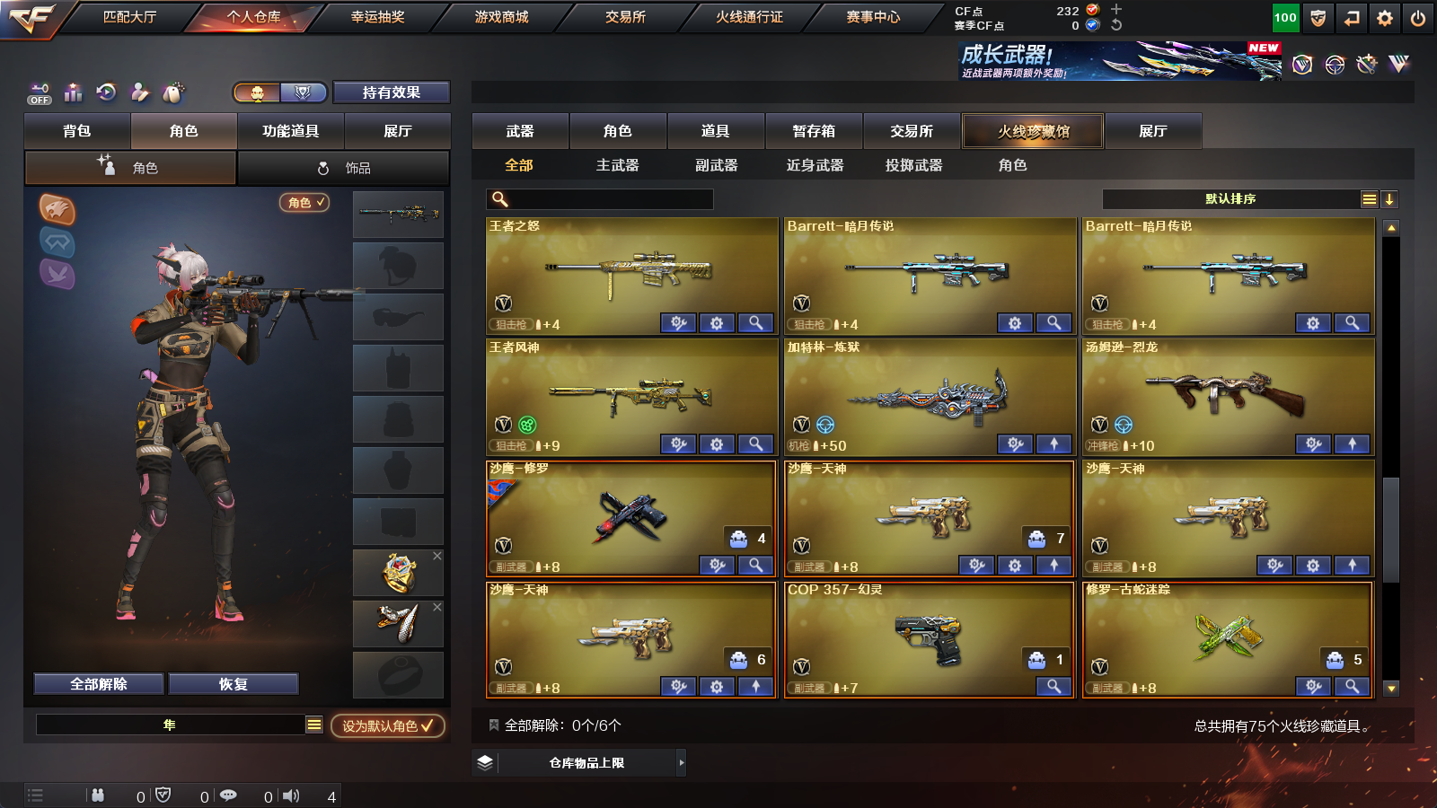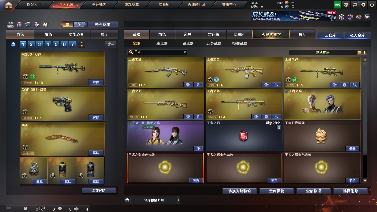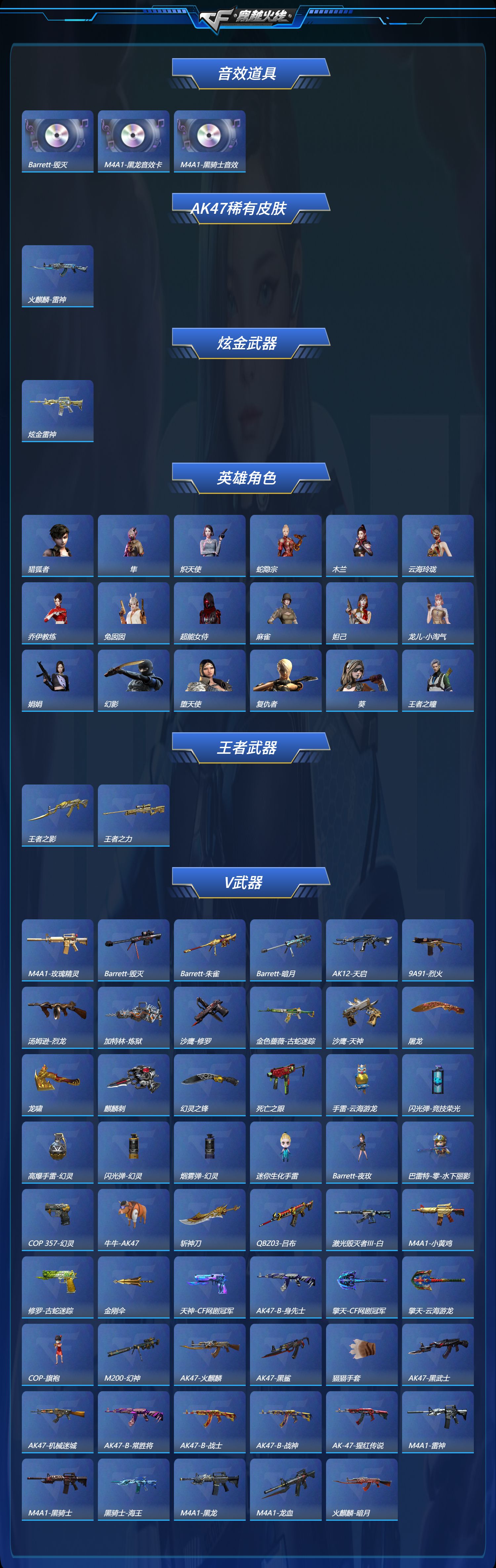 【王者级武器】王者风神-觉醒版,王者之势-觉醒版,王者之怒-觉醒版,王者之力,王者之影【炫金级武器】炫金雷神【英雄级角色】葵,隼【英雄级武器】擎天-云海游龙,手雷-云海游龙,龙啸,高爆手雷-幻灵,闪光弹-幻灵,烟雾弹-幻灵,幻灵之锋,COP,357-幻灵,AK47-黑鲨,M200-幻神,无影-神兵利器,AK47-火麒麟,AK47-机械迷城,Barrett-暗月传说,AK-47-猩红传说,闪光弹-竞技荣光,沙鹰-天神,AK-47-猩红传说,AK47-B-常胜将军,AK47-B-战士,AK-47-猩红传说,沙鹰-天神,Barrett-朱雀,AK47-B-身先士卒,黑骑士-海王,麒麟刺,M4A1-玫瑰精灵,天神-CF网剧冠军,黑武士-CF网剧冠军,擎天-CF网剧冠军,AK47-黑鲨,AK47-黑武士,M4A1-龙血,加特林-炼狱,AK47-黑鲨,汤姆逊-烈龙,M4A1-玫瑰精灵,AK-47-猩红传说,AK-47-猩红传说,Barrett-暗月传说,AK47-黑武士,AK47-B-战神,AK-47-猩红传说,AK-47-猩红传说,AK47-B-战士,AK-47-猩红传说,AK-47-猩红传说,AK-47-猩红传说,AK47-黑鲨,Barrett-毁灭,9A91-烈火,M4A1-黑龙,Barrett-毁灭,Barrett-毁灭,M4A1-雷神,AK12-天启,屠龙,M4A1-龙血,屠龙,屠龙,M4A1-黑骑士,沙鹰-修罗,屠龙,麒麟刺,沙鹰-天神,AK47-火麒麟