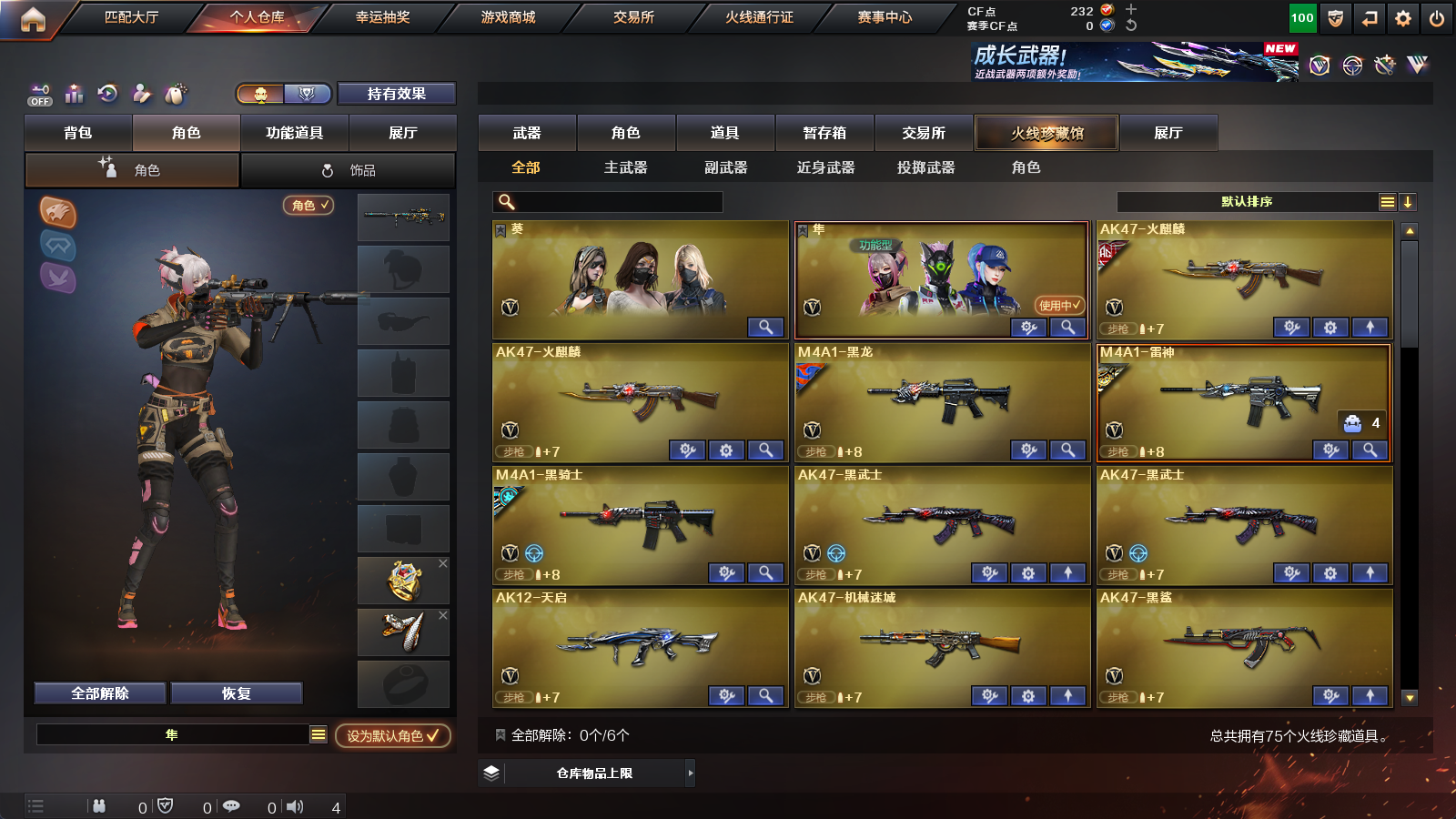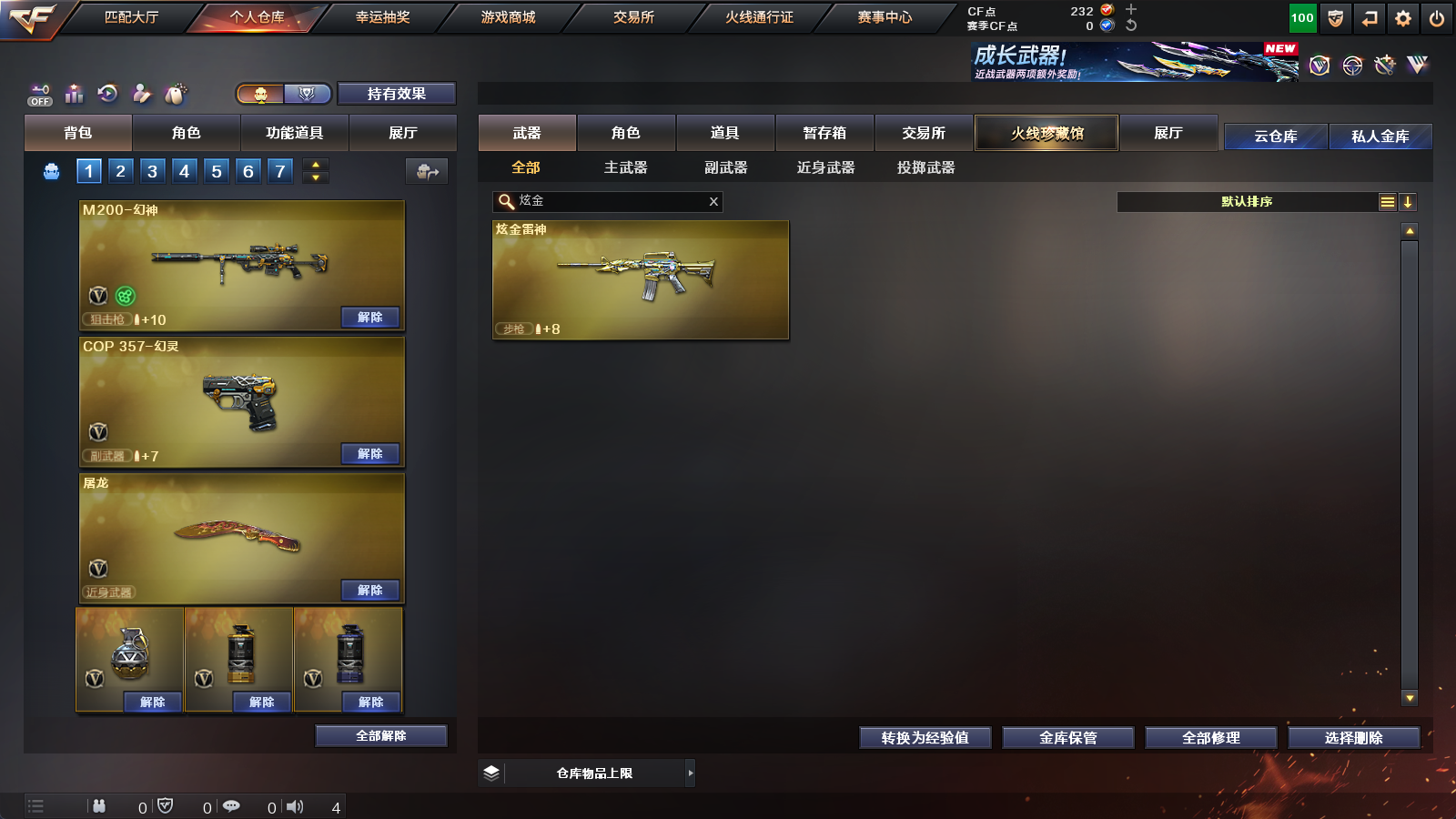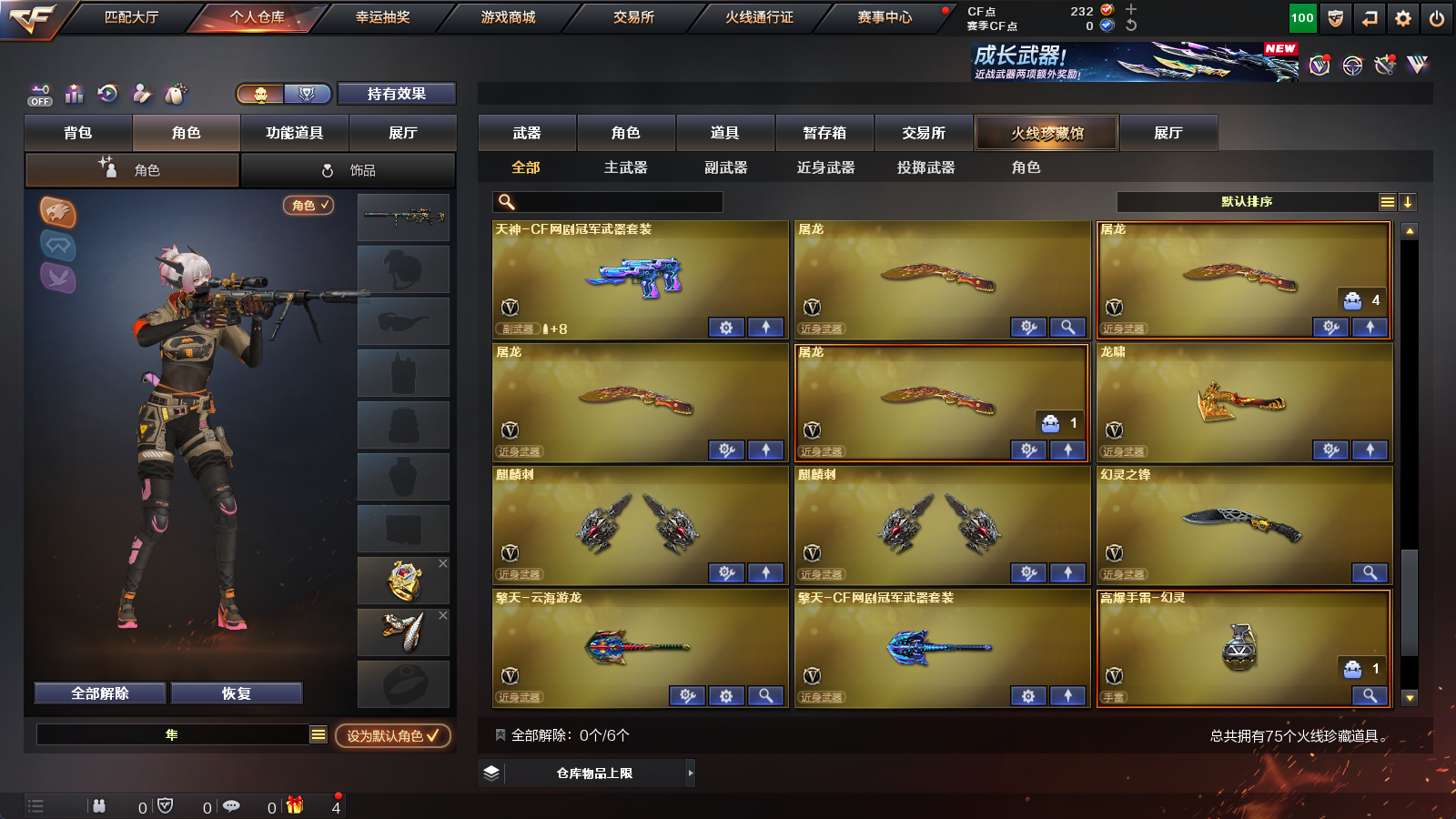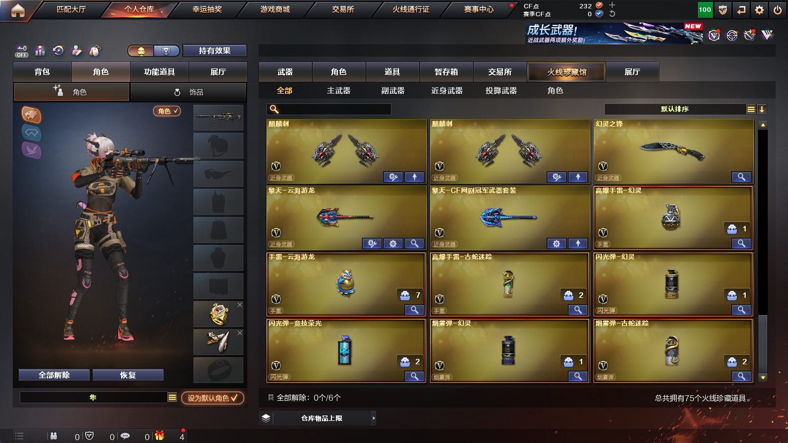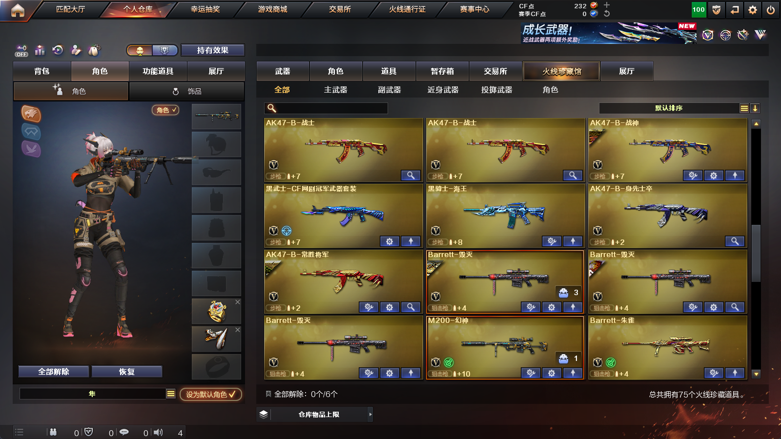 【王者级武器】王者风神-觉醒版,王者之势-觉醒版,王者之怒-觉醒版,王者之力,王者之影【炫金级武器】炫金雷神【英雄级角色】葵,隼【英雄级武器】擎天-云海游龙,手雷-云海游龙,龙啸,高爆手雷-幻灵,闪光弹-幻灵,烟雾弹-幻灵,幻灵之锋,COP,357-幻灵,AK47-黑鲨,M200-幻神,无影-神兵利器,AK47-火麒麟,AK47-机械迷城,Barrett-暗月传说,AK-47-猩红传说,闪光弹-竞技荣光,沙鹰-天神,AK-47-猩红传说,AK47-B-常胜将军,AK47-B-战士,AK-47-猩红传说,沙鹰-天神,Barrett-朱雀,AK47-B-身先士卒,黑骑士-海王,麒麟刺,M4A1-玫瑰精灵,天神-CF网剧冠军,黑武士-CF网剧冠军,擎天-CF网剧冠军,AK47-黑鲨,AK47-黑武士,M4A1-龙血,加特林-炼狱,AK47-黑鲨,汤姆逊-烈龙,M4A1-玫瑰精灵,AK-47-猩红传说,AK-47-猩红传说,Barrett-暗月传说,AK47-黑武士,AK47-B-战神,AK-47-猩红传说,AK-47-猩红传说,AK47-B-战士,AK-47-猩红传说,AK-47-猩红传说,AK-47-猩红传说,AK47-黑鲨,Barrett-毁灭,9A91-烈火,M4A1-黑龙,Barrett-毁灭,Barrett-毁灭,M4A1-雷神,AK12-天启,屠龙,M4A1-龙血,屠龙,屠龙,M4A1-黑骑士,沙鹰-修罗,屠龙,麒麟刺,沙鹰-天神,AK47-火麒麟