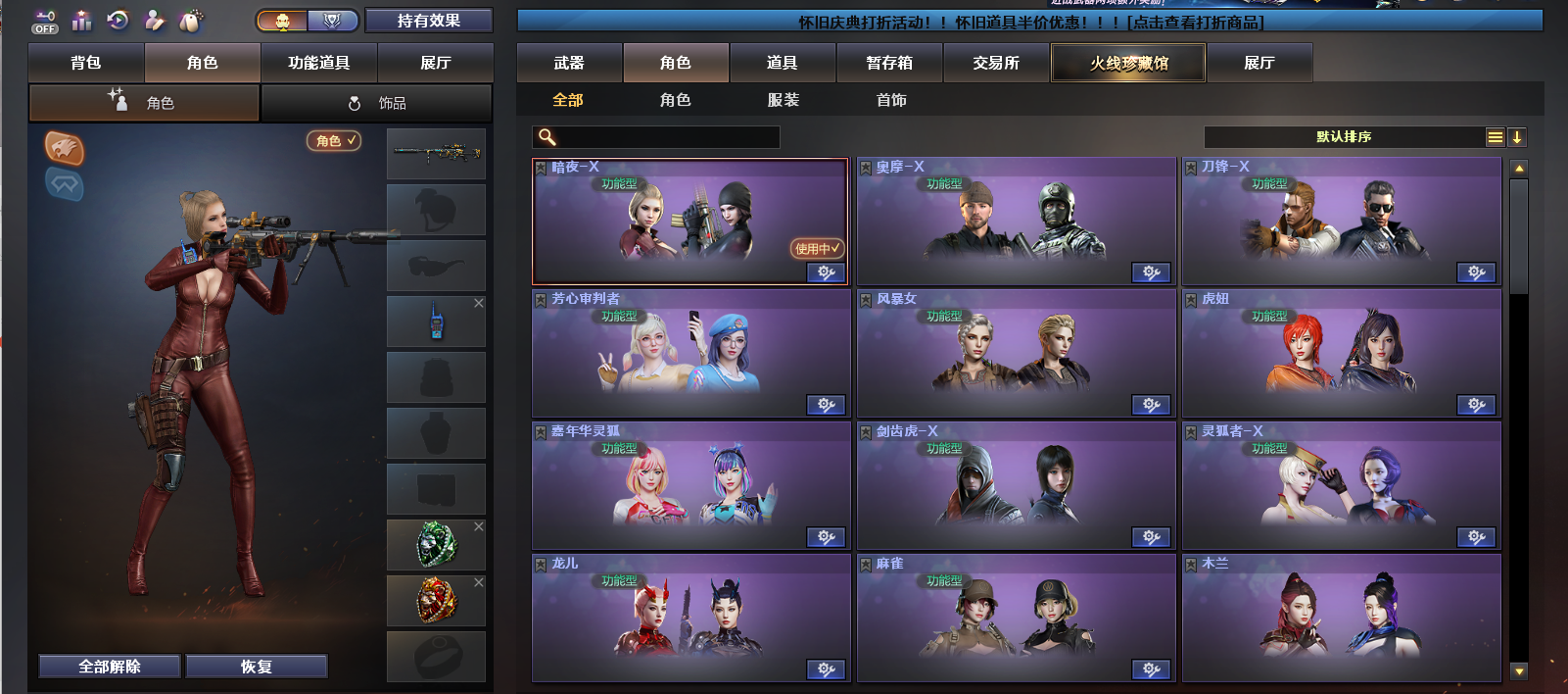 【通用级角色】灵狐者-X,龙儿,潘多拉-X,铁骑荣耀,暗夜-X,刀锋-X,紫霞,奥摩-X,麻雀,剑齿虎-X,圣诞潘多拉-X,虎妞,芳心审判者,社长刀锋,兔囡囡,斯沃特-X,风暴女,木兰,嘉年华灵狐