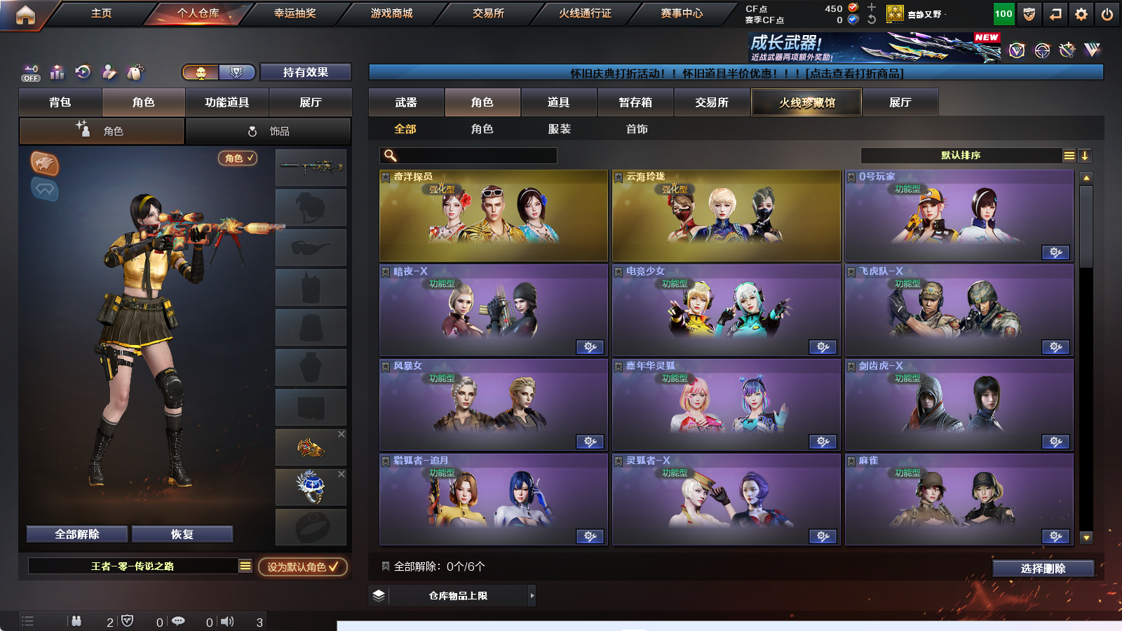 【通用级角色】灵狐者-X,潘多拉-X,暗夜-X,青霞仙子,妲己,夜玫瑰-X,风暴女,齐天大圣,麻雀,剑齿虎-X,圣诞潘多拉-X,飞虎队-X,樱-战斗天使,社长刀锋,斯沃特-X,嘉年华灵狐,猎狐者-追月,维纳斯,电竞少女,云海玲珑,游珑儿,奇洋探员,夜玫瑰-宠粉,0号玩家