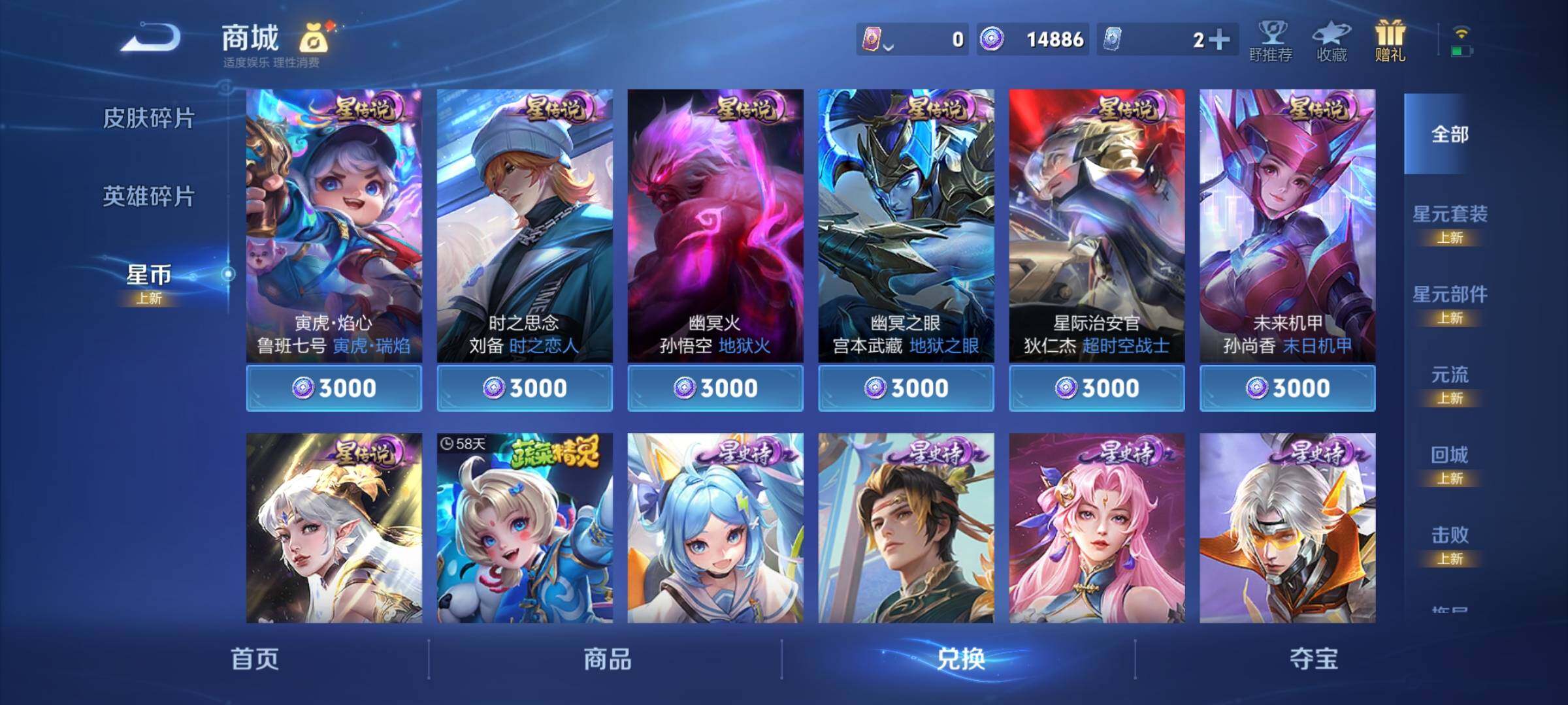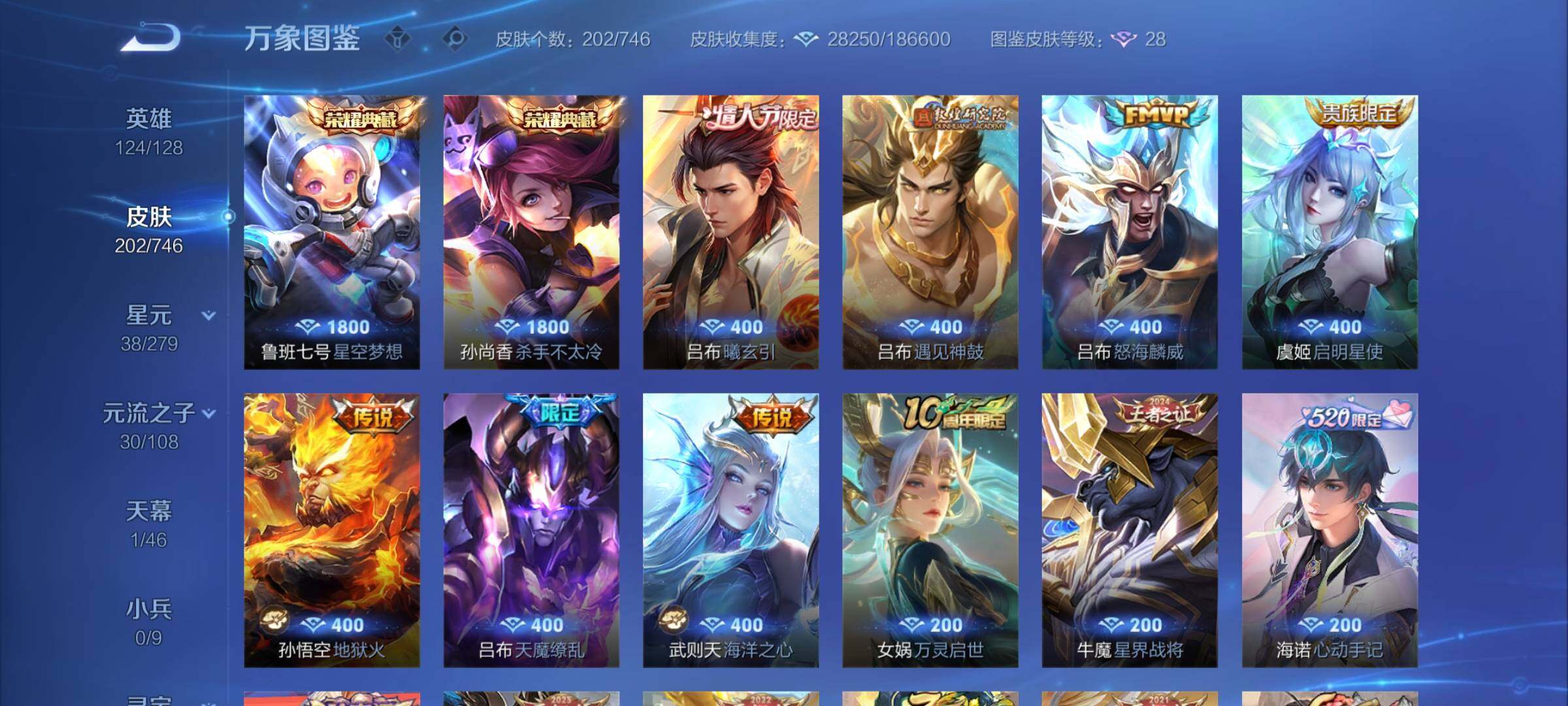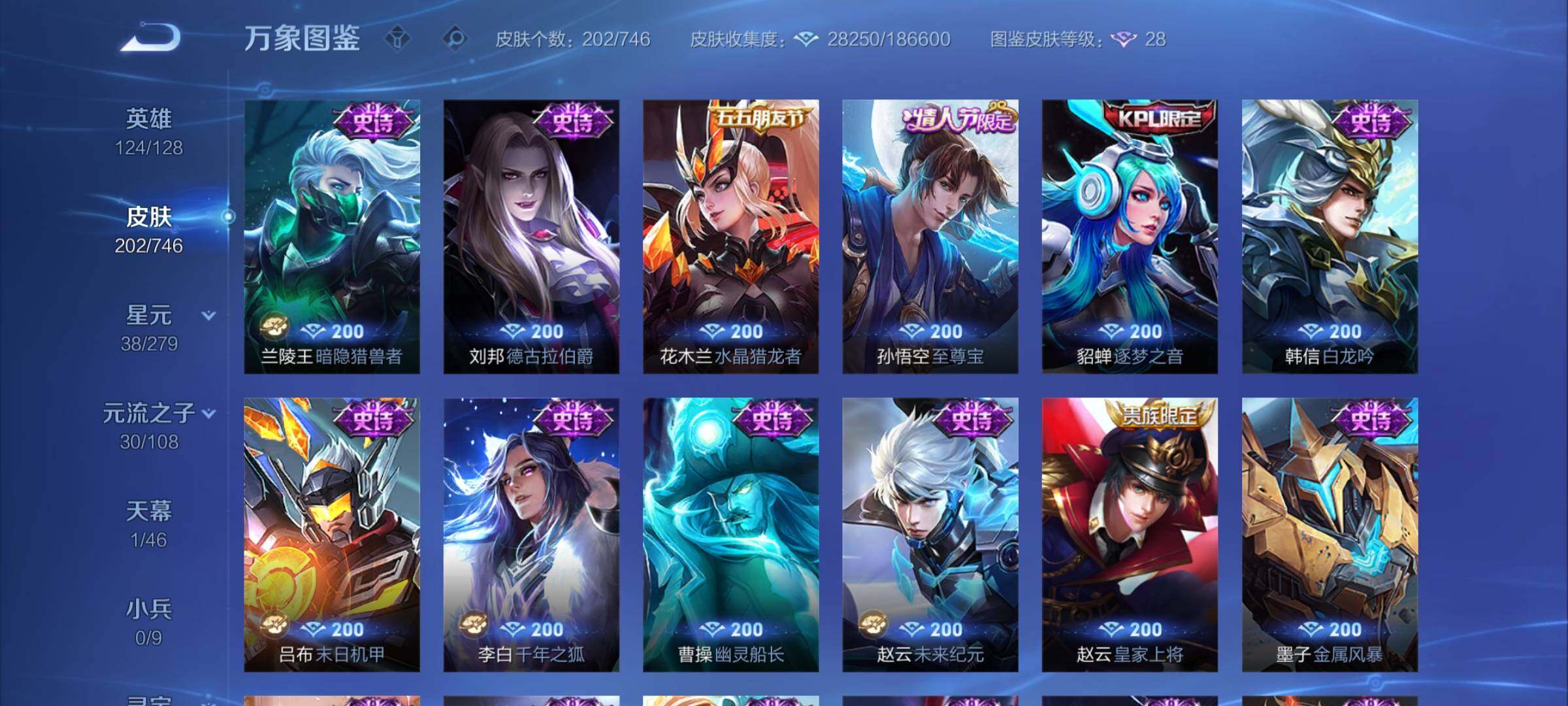 【史诗皮肤】:项羽苍穹之光,露娜紫霞仙子,赵云皇家上将,赵云未来纪元,貂蝉圣诞恋歌,甄姬冰雪圆舞曲,王昭君偶像歌手,狄仁杰魔术师,宫本武藏鬼剑武藏,孙尚香水果甜心,嬴政摇滚巨星,妲己女仆咖啡,墨子金属风暴,吕布圣诞狂欢,曹操幽灵船长,李白千年之狐,吕布末日机甲,韩信白龙吟,貂蝉逐梦之音,孙悟空至尊宝,花木兰水晶猎龙者,刘邦德古拉伯爵,兰陵王暗隐猎兽者,诸葛亮黄金分割率,亚瑟心灵战警,雅典娜冰冠公主,安琪拉心灵骇客,百里守约特工魅影,铠曙光守护者,蔡文姬舞动绿茵,刘禅天才门将,李元芳逐浪之夏,程咬金功夫厨神,杨玉环遇见飞天,嬴政白昼王子,孙策猫狗日记,伽罗箭羽风息,狄仁杰鹰眼统帅,上官婉儿梁祝,百里玄策原初追逐者,裴擒虎李小龙,吕布御风骁将,庄周高山流水,雅典娜黎明之约,鬼谷子五谷丰年,梦奇顽趣,蒙恬荣光圣徽,姬小满妄想食味,海诺心动手记,牛魔星界战将,女娲万灵启世