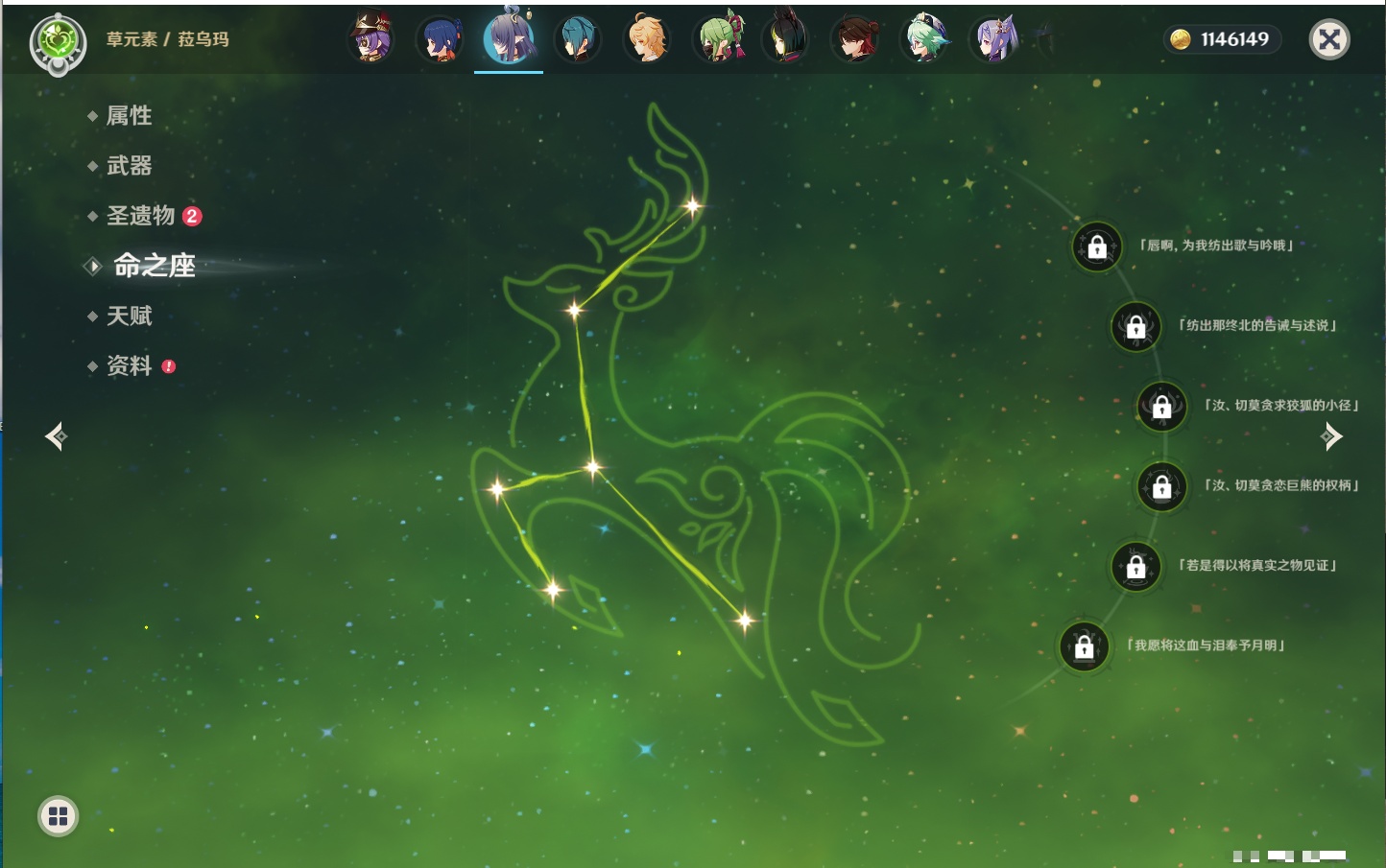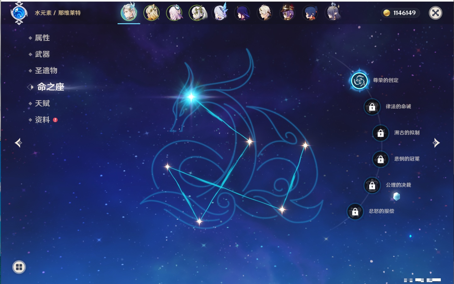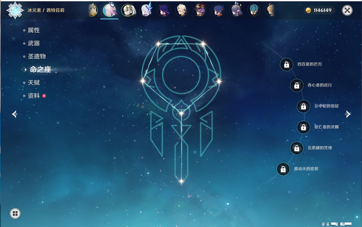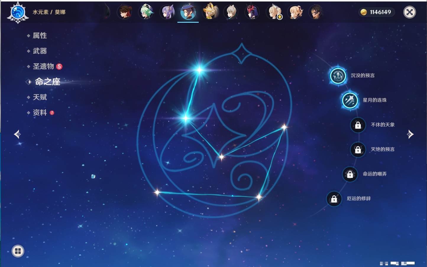 【13个五星角色】,2命莫娜,1命那维莱特,1命迪希雅,1命琴,0命纳西妲,0命提纳里,0命雷电将军,0命刻晴,0命迪卢克,0命希诺宁,0命茜特菈莉,0命丝柯克,0命菈乌玛,
